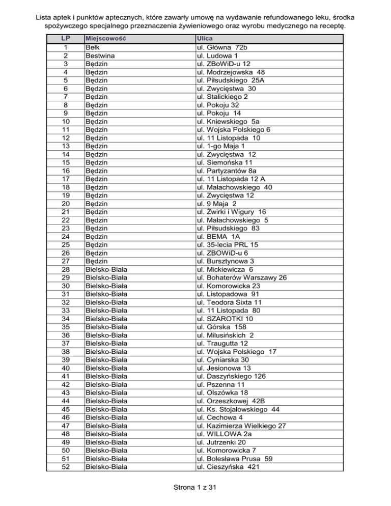 Lista aptek i punktów aptecznych, które zawarły umowę na wydawanie refundowanego leku, środka spożywczego specjalnego przeznaczenia żywieniowego oraz wyrobu medycznego na receptę. LP 1 2 3 4 5 6 7 8 9 10 11 12 13 14 15 16 17 18 19 20 21 22 23 24 25 26 27 28 29 30 31 32 33 34 35 36 37 38 39 40 41 42 43 44 45 46 47 48 49 50 51 52 Miejscowość Ulica Bełk Bestwina Będzin Będzin Będzin Będzin Będzin Będzin Będzin Będzin Będzin Będzin Będzin Będzin Będzin Będzin Będzin Będzin Będzin Będzin Będzin Będzin Będzin Będzin Będzin Będzin Będzin Bielsko-Biała Bielsko-Biała Bielsko-Biała Bielsko-Biała Bielsko-Biała Bielsko-Biała Bielsko-Biała Bielsko-Biała Bielsko-Biała Bielsko-Biała Bielsko-Biała Bielsko-Biała Bielsko-Biała Bielsko-Biała Bielsko-Biała Bielsko-Biała Bielsko-Biała Bielsko-Biała Bielsko-Biała Bielsko-Biała Bielsko-Biała Bielsko-Biała Bielsko-Biała Bielsko-Biała Bielsko-Biała ul. Główna 72b ul. Ludowa 1 ul. ZBoWiD-u 12 ul. Modrzejowska 48 ul. Piłsudskiego 25A ul. Zwycięstwa 30 ul. Stalickiego 2 ul. Pokoju 32 ul. Pokoju 14 ul. Kniewskiego 5a ul. Wojska Polskiego 6 ul. 11 Listopada 10 ul. 1-go Maja 1 ul. Zwycięstwa 12 ul. Siemońska 11 ul. Partyzantów 8a ul. 11 Listopada 12 A ul. Małachowskiego 40 ul. Zwycięstwa 12 ul. 9 Maja 2 ul. Żwirki i Wigury 16 ul. Małachowskiego 5 ul. Piłsudskiego 83 ul. BEMA 1A ul. 35-lecia PRL 15 ul. ZBOWiD-u 6 ul. Bursztynowa 3 ul. Mickiewicza 6 ul. Bohaterów Warszawy 26 ul. Komorowicka 23 ul. Listopadowa 91 ul. Teodora Sixta 11 ul. 11 Listopada 80 ul. SZAROTKI 10 ul. Górska 158 ul. Milusińskich 2 ul. Traugutta 12 ul. Wojska Polskiego 17 ul. Cyniarska 30 ul. Jesionowa 13 ul. Daszyńskiego 126 ul. Pszenna 11 ul. Olszówka 18 ul. Orzeszkowej 42B ul. Ks. Stojałowskiego 44 ul. Cechowa 4 ul. Kazimierza Wielkiego 27 ul. WILLOWA 2a ul. Jutrzenki 20 ul. Komorowicka 7 ul. Bolesława Prusa 59 ul. Cieszyńska 421 Strona 1 z 31 Lista aptek i punktów aptecznych, które zawarły umowę na wydawanie refundowanego leku, środka spożywczego specjalnego przeznaczenia żywieniowego oraz wyrobu medycznego na receptę. LP 53 54 55 56 57 58 59 60 61 62 63 64 65 66 67 68 69 70 71 72 73 74 75 76 77 78 79 80 81 82 83 84 85 86 87 88 89 90 91 92 93 94 95 96 97 98 99 100 101 102 103 104 Miejscowość Ulica Bielsko-Biała Bielsko-Biała Bielsko-Biała Bielsko-Biała Bielsko-Biała Bielsko-Biała Bielsko-Biała Bielsko-Biała Bielsko-Biała Bielsko-Biała Bielsko-Biała Bielsko-Biała Bielsko-Biała Bielsko-Biała Bielsko-Biała Bielsko-Biała Bielsko-Biała Bielsko-Biała Bielsko-Biała Bielsko-Biała Bielsko-Biała Bielsko-Biała Bielsko-Biała Bielsko-Biała Bielsko-Biała Bielsko-Biała Bielsko-Biała Bielsko-Biała Bielsko-Biała Bielsko-Biała Bielsko-Biała Bielsko-Biała Bielsko-Biała Bielsko-Biała Bielsko-Biała Bielsko-Biała Bielsko-Biała Bielsko-Biała Bielsko-Biała Bielsko-Biała Bielsko-Biała Bielsko-Biała Bielsko-Biała Bielsko-Biała Bielsko-Biała Bielsko-Biała Bielsko-Biała Bielsko-Biała Bielsko-Biała Bielsko-Biała Bieruń Bieruń ul. Międzyrzecka 7 ul. Jutrzenki 24 ul. Mikołaja Reja 18 ul. Sternicza 26 A ul. Siewna 2f ul. Mostowa 5 ul. Warszawska 2 ul. Sobieskiego 64A ul. Harcerska 6a ul. Żywiecka 92 ul. Podgórna 13 ul. Warszawska 5 ul. 11 Listopada 37 ul. Cyniarska 11 ul. Michałowicza 20 ul. Partyzantów 39 ul. Sobieskiego 83 ul. Gen. W. Sikorskiego 2 ul. Jutrzenki 8 ul. Ikara 2 ul. Krakowska 196 ul. Leszczyńska 20 ul. Kasztanowa 5 ul. Aleja Armii Krajowej 101 ul. Pocztowa 19 Al. Gen. Andersa 81 ul. Bystrzańska 94B ul. Komorowicka 314 ul. Mickiewicza 40 ul. 11-go Listopada 21 ul. Cieszyńska 132 ul. Monte Cassino 421 ul. Michałowicza 41 ul. Plac Żwirki i Wigury 9 ul. Rynek 15 ul. Klemensa Matusiaka 3 Al. Armii Krajowej 132 ul. Spódzielców 50 ul. Mostowa 2 ul. Jana Kazimierza 6 ul. Stojałowskiego 55 ul. Górska 129 ul. Warszawska 180 ul. Powstańców Śląskich 9 pl. Józefa Niemczyka 6 ul. 3 Maja 4 ul. Wyzwolenia 367 ul. Janowicka 11 ul. Pięciu Stawów 6 ul. Sarni Stok 2 ul. Jerzego 4 ul. Granitowa 22 22 Strona 2 z 31 Lista aptek i punktów aptecznych, które zawarły umowę na wydawanie refundowanego leku, środka spożywczego specjalnego przeznaczenia żywieniowego oraz wyrobu medycznego na receptę. LP 105 106 107 108 109 110 111 112 113 114 115 116 117 118 119 120 121 122 123 124 125 126 127 128 129 130 131 132 133 134 135 136 137 138 139 140 141 142 143 144 145 146 147 148 149 150 151 152 153 154 155 156 Miejscowość Ulica Bieruń Bieruń Bieruń Bieruń Bieruń Bieruń Stary Blachownia Blachownia Blachownia Blachownia Bobrowniki Bojszowy Boronów Borowno Brenna Brenna Brenna Brenna Brudzowice Brzeźce Brzuśnik Buczkowice Buczkowice Bujaków Bystra Bystra Krakowska Bystrzanowice Bytom Bytom Bytom Bytom Bytom Bytom Bytom Bytom Bytom Bytom Bytom Bytom Bytom Bytom Bytom Bytom Bytom Bytom Bytom Bytom Bytom Bytom Bytom Bytom Bytom ul. Węglowa 14 ul. Chemików 3 ul. Wawelska 40 ul. Adama 17/2 ul. Granitowa 20 ul. Chemików 37 ul. Żeromskiego 2 ul. Żeromskiego 8 ul. 1 Maja 97 ul. Leśna 11 ul. Sienkiewicza 121B ul. Książęca 4 ul. Poznańska 1 ul. Głowackiego 1 ul. Wyzwolenia 34 A ul. Wyzwolenia 38b ul. Leśnica 2 ul. Wyzwolenia 77 ul. Szkolna 12 ul. Ofiar Faszyzmu 7 ul. Brzuśnik 227 ul. Szkolna 1 ul. Romana Białka 1307 ul. Bielska 15 ul. Szczyrkowska 58 ul. Promienista 1 ul. Bystrzanowice 13 ul. Chrzanowskiego 5 ul. Józefczaka 1 ul. Dworcowa 24 ul. Żeromskiego 15/1 ul. Orzegowska 32 ul. Dworcowa 14/1 ul. Strzelców Bytomskich 33A ul. Strzelców Bytomskich 25 ul. Jainty 20 ul. Św. Cyryla i Metodego 44 ul. Felińskiego 63/f ul. Chłodna 1 ul. Narutowicza 3C ul. Rynek 6 ul. Gombrowicza 1 ul. Racjonalizatorów 39 ul. Stolarzowicka 44 ul. Felińskiego 63/a ul. Stolarzowicka 106 ul. Olimpijska 1 ul. Plac Tadeusz Kościuszki 1/005 ul. Piłsudskiego 72 ul. Didura 3 ul. Łużycka 12 ul. Tatrzańska 2 Strona 3 z 31 Lista aptek i punktów aptecznych, które zawarły umowę 