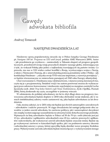GGawędy adwokata bibliofila Andrzej Tomaszek Następne dwadzieścia lat Niedawno sporą popularnością cieszyła się w Polsce książka Georga Friedmana pt. Następne 100 lat. Prognoza na XXI wiek (wyd. polskie AMF, Warszawa 2009). Autor – jak przedstawia go wydawca – zamieszkały w Teksasie ekspert od prognoz geopolitycznych, przedstawił swoją wizję przyszłych dziejów naszego globu, interesującą nas o tyle, że wskazał Polskę jako jedno z najbardziej rozwijających się państw świata. Co prawda, ma nas w XXI wieku czekać konflikt z Rosją, wyniszczająca wojna z Turcją, a także z Niemcami i Francją, ale z amerykańską pomocą poradzimy sobie i Polska – jak konkluduje Friedman – „odzyska swoje XVII-wieczne imperium, a nawet je powiększy”, co będzie równoznaczne ze zmierzchem panującej od 1945 roku Europy atlantyckiej. Choć rozważania G. Friedmana rażą i dyletanctwem, i stanowczością stawianych tez, czyta się je z przyjemnością. Śmiałość wizji i tez autora porównać można do wykraczającej poza salonowe konwenanse i niesłusznie zepchniętej na margines eseistyki Lecha Jęczmyka (zob. zbiór Trzy końce historii czyli Nowe Średniowiecze, Zysk i Spółka, Poznań 2006), którą doskonale się czyta, szczególnie w jesienny wieczór. W odniesieniu do polskiej adwokatury sto lat to zbyt długi okres na prognozy (nowoczesna adwokatura będzie dopiero w 2018 roku obchodzić swoje stulecie), ale w ramach intelektualnej zabawy warto zastanowić się, jaka będzie adwokatura za lat dwadzieścia. I tak, można założyć, że w 2031 roku nie będzie już dwóch samorządów zawodowych – adwokatów i radców prawnych. W ciągu dwudziestu lat nastąpi połączenie obu zawodów w jeden zawód adwokata, bo zarówno politycy, jak i samorządowi decydenci nie znajdą wystarczającego uzasadnienia na utrzymywanie dotychczasowego podziału. Wpisanych na listę adwokatów będzie w Polsce od 50 do 70 tys. osób (obecnie jest już 13 tys. adwokatów i aplikantów adwokackich oraz 25 tys. radców prawnych i aplikantów radcowskich), ale wykonywać zawód adwokata będzie znacznie mniej. Będzie się go wykonywać zarówno w kancelarii bądź spółce, jak i na podstawie umowy zlecenia i adwokackiej umowy o pracę, której specyfikę będą określać nowe przepisy Kodeksu pracy. Wykonywanie zawodu adwokata będzie można łączyć z wykonywaniem innego 231 Andrzej Tomaszek PALESTRA zawodu polegającego na profesjonalnym świadczeniu usług (jak doradca podatkowy czy finansowy, makler, rzecznik patentowy, rzeczoznawca, pośrednik w obrocie nieruchomościami), a także z innymi godziwymi zajęciami zarobkowymi. Znacznie poprawi się poziom kancelaryjnej infrastruktury i standard usług. Klient będzie otrzymywał na swoje żądanie skany protokołów i pism w prowadzonych przez adwokata sprawach, jak też okresowe raporty o ich stanie. Wizyty u adwokata zastąpią wideo- i telekonferencje, a zlecenie prowadzenia sprawy będzie mogło następować przez Internet. Klienci będą zawierać umowy o świadczenie usług adwokackich nie tylko ze spółkami osobowymi adwokatów, ale także ze spółkami kapitałowymi, które używać będą adwokatów jako podwykonawców. Spółki takie będą powstawać głównie z inicjatywy towarzystw ubezpieczeniowych, które zapewniać będą ubezpieczonym kompleksową obsługę prawną, ale nie zabraknie też innych inwestorów zainteresowanych udziałami bądź akcjami spółek świadczących usługi adwokackie. Tworzenie przez towarzystwa ubezpieczeniowe sieci usług adwokackich dla ludności będzie wywoływać kontrowersje, ale wielu adwokatów przyjmie z entuzjazmem taką możliwość zarobkowania, widząc jej zalety przede wszystkim w stałości otrzymywanego wynagrodzenia. Rynek usług adwokackich będzie jeszcze wyraźniej niż dziś podzielony na dwa sektory: usługi dla ludności i usługi dla biznesu, i na dwa obszary: Warszawa i kilka relatywnie dużych ośrodków miejskich, gdzie gospodarka będzie silniej stymulowała zapotrzebowanie na usługi adwokackie, oraz pozostała Polska, gdzie stymulacja ta będzie słabsza. W pierwszym sektorze nadmiar podaży będzie wymuszać okresowe obniżanie cen i ostrą, niekiedy nawet patologiczną, walkę konkurencyjną o klienta. Nieunikniona jest pauperyzacja wielu kolegów. Poza dużymi ośrodkami będzie spokojniej, bardziej stabilnie, ale o wiele trudniej o wyższe zarobki. W drugim sektorze, skupionym w największych miastach, walka konkurencyjna będzie nie mniej brutalna, ale w ładnym opakowaniu i z zachowaniem pozorów. Tutaj dominować będą duże i średnie kancelarie, głównie te, które pozycję rynkową zdobyły lub zdobywają już teraz (nie wszystkie wszakże zachowają świetność po odejściu swoich założycieli). W pozyskiwaniu klientów coraz większą rolę odgrywać będą renoma (szyld), długa obecność na rynku (w 2031 roku można się będzie pochwalić już nawet ponad czterdziestoletnim funkcjonowaniem kancelarii) i wysokie ubezpieczenie od błędów w sztuce. Choć wciąż istotne będą dobre biogramy wspólników-założycieli i lista historycznych dokonań w procesie polskiej transformacji gospodarczej, to za dwadzieścia lat pierwsze skrzypce grać już będą partnerzy zdobywający dziś wykształcenie i staż za granicą, mający międzynarodowe kontakty i pozbawieni jakichkolwiek PRL-owskich kompleksów i obciążeń. Kancelarie niczym fabryki napędzane będą nie tylko zapałem i umiejętnościami swoich zarządców i partnerów, ale też pracą (jak przy taśmie produkcyjnej) dziesiątków anonimowych dla klientów podwykonawców, którzy nie będą aplikować, a o wpis na listę adwokatów ubiegać się będą z tytułu wykonywania pracy prawnika. Kancelarie będą tych ludzi promować, bo nie zwalniają się na zajęcia i nie potrzebują urlopów na naukę do aplikacyjnych kolokwiów i egzaminu adwokackiego. 232 9–10/2011 Następ