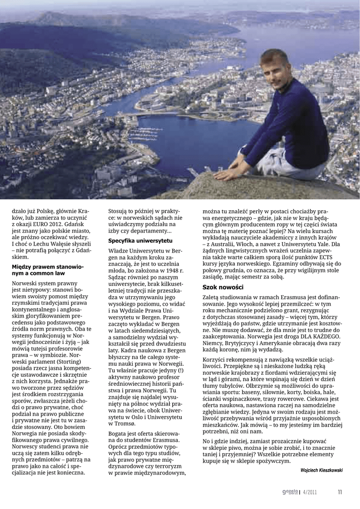 dzało już Polskę, głównie Kraków, lub zamierza to uczynić z okazji EURO 2012. Gdańsk jest znany jako polskie miasto, ale próżno oczekiwać wiedzy. I choć o Lechu Wałęsie słyszeli – nie potrafią połączyć z Gdańskiem. Między prawem stanowionym a common law Norweski system prawny jest nietypowy: stanowi bowiem swoisty pomost między rzymskimi tradycjami prawa kontynentalnego i anglosaskim gloryfikowaniem precedensu jako podstawowego źródła norm prawnych. Oba te systemy funkcjonują w Norwegii jednocześnie i żyją – jak mówią tutejsi profesorowie prawa – w symbiozie. Norweski parlament (Storting) posiada rzecz jasna kompetencje ustawodawcze i skrzętnie z nich korzysta. Jednakże prawo tworzone przez sędziów jest środkiem rozstrzygania sporów, zwłaszcza jeżeli chodzi o prawo prywatne, choć podział na prawo publiczne i prywatne nie jest tu w zasadzie stosowany. Oto bowiem Norwegia nie posiada skodyfikowanego prawa cywilnego. Norwescy studenci prawa nie uczą się zatem kilku odrębnych przedmiotów – patrzą na prawo jako na całość i specjalizacja nie jest konieczna. Stosują to później w praktyce: w norweskich sądach nie uświadczymy podziału na izby czy departamenty... Specyfika uniwersytetu Władze Uniwersytetu w Bergen na każdym kroku zaznaczają, że jest to uczelnia młoda, bo założona w 1948 r. Sądząc również po naszym uniwersytecie, brak kilkusetletniej tradycji nie przeszkadza w utrzymywaniu jego wysokiego poziomu, co widać i na Wydziale Prawa Uniwersytetu w Bergen. Prawo zaczęto wykładać w Bergen w latach siedemdziesiątych, a samodzielny wydział wykształcił się przed dwudziestu laty. Kadra naukowa z Bergen błyszczy na tle całego systemu nauki prawa w Norwegii. Tu właśnie pracuje jedyny (!) aktywny naukowo profesor średniowiecznej historii państwa i prawa Norwegii. Tu znajduje się najdalej wysunięty na północ wydział prawa na świecie, obok Uniwersytetu w Oslo i Uniwersytetu w Tromsø. Bogata jest oferta skierowana do studentów Erasmusa. Oprócz przedmiotów typowych dla tego typu studiów, jak prawo prywatne międzynarodowe czy terroryzm w prawie międzynarodowym, można tu znaleźć perły w postaci chociażby prawa energetycznego – gdzie, jak nie w kraju będącym głównym producentem ropy w tej części świata można tę materię poznać lepiej? Na wielu kursach wykładają nauczyciele akademiccy z innych krajów – z Australii, Włoch, a nawet z Uniwersytetu Yale. Dla żądnych lingwistycznych wrażeń uczelnia zapewnia także warte całkiem sporą ilość punktów ECTS kursy języka norweskiego. Egzaminy odbywają się do połowy grudnia, co oznacza, że przy wigilijnym stole zasiądę, mając semestr za sobą. Szok nowości Zaletą studiowania w ramach Erasmusa jest dofinansowanie. Jego wysokość lepiej przemilczeć: w tym roku mechanicznie podzielono grant, rezygnując z dotychczas stosowanej zasady – więcej tym, którzy wyjeżdżają do państw, gdzie utrzymanie jest kosztowne. Nie muszę dodawać, że dla mnie jest to trudne do zaakceptowania. Norwegia jest droga DLA KAŻDEGO. Niemcy, Brytyjczycy i Amerykanie obracają dwa razy każdą koronę, nim ją wydadzą. Korzyści rekompensują z nawiązką wszelkie uciążliwości. Przepiękne są i nieskażone ludzką ręką norweskie krajobrazy z fiordami wdzierającymi się w ląd i górami, na które wspinają się dzień w dzień tłumy tubylców. Olbrzymie są możliwości do uprawiania sportu: baseny, siłownie, korty, boiska, hale, ścianki wspinaczkowe, trasy rowerowe. Ciekawa jest oferta naukowa, nastawiona raczej na samodzielne zgłębianie wiedzy. Jedyna w swoim rodzaju jest możliwość przebywania wśród przyjaźnie usposobionych mieszkańców. Jak mówią – to my jesteśmy im bardziej potrzebni, niż oni nam. No i gdzie indziej, zamiast prozaicznie kupować w sklepie piwo, można je sobie zrobić, i to znacznie taniej i przyjemniej? Wszelkie potrzebne elementy kupuje się w sklepie spożywczym. Wojciech Kieszkowski 4/2011 11 z prawa Wielka kontra Jak zapobiegać konfliktom jurysdykcji w postępowaniu karnym i jak je rozstrzygaæ Ciekawą, a wręcz zaskakującą i niespodziewaną inicjatywę legislacyjną wysunął w październiku 2009 roku rząd polski (obok Czech, Słowenii, Słowacji i Szwecji). Wniosek dotyczy decyzji ramowej Rady w sprawie zapobiegania konfliktom jurysdykcji w postępowaniu karnym i rozstrzyganiu takich konfliktów. 12 4/2011 P olska wystąpiła z inicjatywą rozwiązania problemu. Przestępczość staje się międzynarodowa, a zwalczanie jej napotyka trudności praktyczne. Skutkiem jest naruszenie podstawowych praw oskarżonego, wynikających z zasady „Ne bis in idem”. W ramach jednolitej przestrzeni wolności, bezpieczeństwa i sprawiedliwości, w której zagwarantowana jest swoboda przemieszczania się osób, naruszanie tej zasady nie jest dopuszczalne. Głównym celem państw członkowskich stało się stworzenie kompleksowego programu środków dla wprowadzenia w życie zasady wzajemnego uznawania orzeczeń w sprawach karnych. Podjęty cel jest szczytny, jednak nie jest łatwy do osiągnięcia ze względu na ograniczenia stawiane przez konstytucje państw. Unia Europejska wielokrotnie szukała sposobu na zacieśnienie współpracy między państwami przy zwalczaniu przestępczości i na określenie jak daleko może wkroczyć w kompetencje organów krajowych i usprawiedliwić tę ingerencję skutecznością podejmowanych działań. W piśmiennictwie wskazuje się na postępujący proces oddalania się Unii Europejskiej od fundamentów prawa karnego, respektującego porządek konstytucyjno – prawny. Te działania uznaje się sceptycznie za skazane od początku na zawalenie się, a wiele wydarzeń z europejskiej sceny politycznej udowodniło, że wątpiący ocenili trafnie. Przykładem są choćby trudności z wprowadzeniem decyzji ramowej, dotyczącej Europejskiego Nakazu Aresztowania do porządków