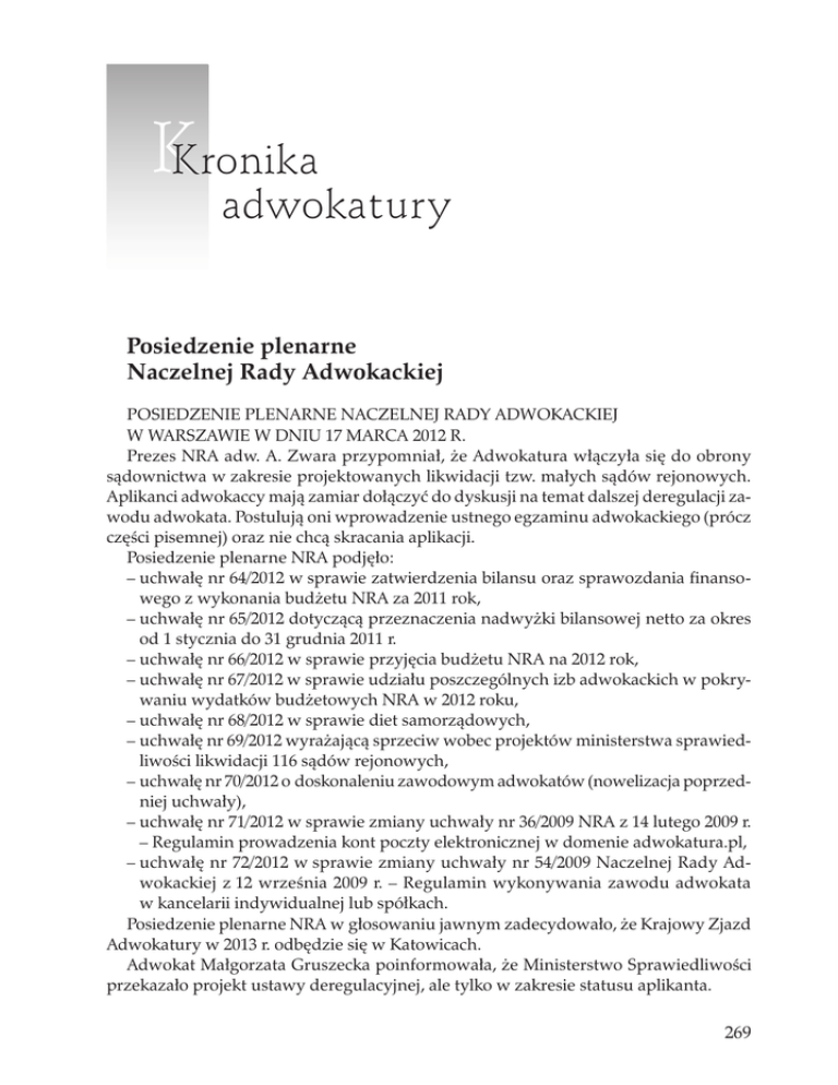 KKronika adwokatury Posiedzenie plenarne Naczelnej Rady Adwokackiej POSIEDZENIE PLENARNE NACZELNEJ RADY ADWOKACKIEJ W WARSZAWIE W DNIU 17 MARCA 2012 R. Prezes NRA adw. A. Zwara przypomniał, że Adwokatura włączyła się do obrony sądownictwa w zakresie projektowanych likwidacji tzw. małych sądów rejonowych. Aplikanci adwokaccy mają zamiar dołączyć do dyskusji na temat dalszej deregulacji zawodu adwokata. Postulują oni wprowadzenie ustnego egzaminu adwokackiego (prócz części pisemnej) oraz nie chcą skracania aplikacji. Posiedzenie plenarne NRA podjęło: – uchwałę nr 64/2012 w sprawie zatwierdzenia bilansu oraz sprawozdania finansowego z wykonania budżetu NRA za 2011 rok, – uchwałę nr 65/2012 dotyczącą przeznaczenia nadwyżki bilansowej netto za okres od 1 stycznia do 31 grudnia 2011 r. – uchwałę nr 66/2012 w sprawie przyjęcia budżetu NRA na 2012 rok, – uchwałę nr 67/2012 w sprawie udziału poszczególnych izb adwokackich w pokrywaniu wydatków budżetowych NRA w 2012 roku, – uchwałę nr 68/2012 w sprawie diet samorządowych, – uchwałę nr 69/2012 wyrażającą sprzeciw wobec projektów ministerstwa sprawiedliwości likwidacji 116 sądów rejonowych, – uchwałę nr 70/2012 o doskonaleniu zawodowym adwokatów (nowelizacja poprzedniej uchwały), – uchwałę nr 71/2012 w sprawie zmiany uchwały nr 36/2009 NRA z 14 lutego 2009 r. – Regulamin prowadzenia kont poczty elektronicznej w domenie adwokatura.pl, – uchwałę nr 72/2012 w sprawie zmiany uchwały nr 54/2009 Naczelnej Rady Adwokackiej z 12 września 2009 r. – Regulamin wykonywania zawodu adwokata w kancelarii indywidualnej lub spółkach. Posiedzenie plenarne NRA w głosowaniu jawnym zadecydowało, że Krajowy Zjazd Adwokatury w 2013 r. odbędzie się w Katowicach. Adwokat Małgorzata Gruszecka poinformowała, że Ministerstwo Sprawiedliwości przekazało projekt ustawy deregulacyjnej, ale tylko w zakresie statusu aplikanta. 269 Kronika adwokatury PALESTRA Omawiano działalność promocyjną i marketingową Adwokatury, która podniesie prestiż adwokata. Adwokat E. Krasowska przedstawiła sprawozdanie z prac rzecznika dyscyplinarnego. Przypomniała o przestrzeganiu terminów prowadzonych postępowań. Adwokat J. Ziobrowski przedstawił sprawozdanie z prac Wyższego Sądu Dyscyplinarnego. Wiceprezes adw. J. Trela przypomniał, że na konferencji dotyczącej sądownictwa dyscyplinarnego on i kilku innych adwokatów: Z. Gintowt, R. Dębowski, K. Boszko, M. Pietrzak skrytykowali pogląd o konieczności zmian w sądownictwie dyscyplinarnym Adwokatury (więcej: „Palestra” 2012, nr 3–4, s. 257–258). Posiedzenie plenarne uchwałą nr 73/2012 skierowało do Trybunału Konstytucyjnego wnioski o zbadanie zgodności z Konstytucją RP rozporządzenia Ministra Sprawiedliwości z 3 lutego 2012 r. zmieniającego rozporządzenie w sprawie opłat za czynności adwokackie oraz ponoszenia przez Skarb Państwa kosztów nieopłaconej pomocy prawnej udzielonej z urzędu. Redaktor naczelny „Palestry” adw. C. Jaworski zwrócił się do dziekanów z apelem, aby nabywali Rocznik Orzecznictwa Sądu Najwyższego w sprawach karnych za 2011 rok dla aplikantów adwokackich. Andrzej Bąkowski Z posiedzeń Prezydium Naczelnej Rady Adwokackiej I. POSIEDZENIE PREZYDIUM NRA W DNIU 4 KWIETNIA 2012 R. W dniu 4 kwietnia 2012 r. na posiedzeniu Prezydium prezes NRA adw. A. Zwara na wstępie zapowiedział, że w związku z koniecznością udziału w Zgromadzeniu Ogólnym Sędziów Trybunału Konstytucyjnego nie będzie mógł uczestniczyć w całym posiedzeniu Prezydium. Wniósł o zdjęcie z porządku obrad spraw finansowych (w związku z nieobecnością skarbnika Naczelnej Rady Adwokackiej) oraz o jego rozszerzenie przez zajęcie stanowiska w sprawie wypowiedzi adw. J. Jacyny w mediach, a także o sprawę spotkania z przewodniczącymi komisji i zespołów NRA, które odbędzie się 12 kwietnia br. Sekretarz NRA adw. K. Boszko zgłosił podobne wnioski, a nadto wniósł, aby w porządku obrad przyszłego Prezydium znalazł się punkt dotyczący zmiany w składach poszczególnych komisji oraz spotkanie z przewodniczącymi komisji i zespołów NRA. Stwierdził konieczność opracowania stosownej regulacji określającej kompetencje w zakresie polityki informacyjnej NRA. Porządek dzienny został uzupełniony zgodnie ze zgłoszonymi wnioskami. Prezydium podjęło w głosowaniu tajnym uchwały merytoryczne w sprawach osobowych. Sekretarz adw. K. Boszko omówił sprawy wynikające z protokołów nadesłanych przez ORA w: Białymstoku, Bielsku-Białej, Częstochowie, Katowicach, Koszalinie, Lublinie, Łodzi (2 protokoły), Olsztynie, Radomiu, Toruniu i Wrocławiu. Prezes NRA adw. A. Zwara podziękował adw. Monice Strus-Wołos za zorganizowanie 270 7–8/2012 Kronika adwokatury debaty przedstawicieli samorządów zaufania społecznego, poświęconej zagadnieniu ochrony art. 17 Konstytucji RP. Punkt obrad dotyczący wypowiedzi adw. J. Jacyny zamieszczonej na łamach „Rzeczpospolitej” wywołał ożywioną dyskusję, w której udział wzięli adwokaci Z. Marciniak, A. Zwara, J. Trela, M. Pietkiewicz, M. Strus-Wołos, K. Komorowski. Zarysowały się dwa stanowiska: o odwołanie adw. J. Jacyny ze stanowiska przewodniczącego Komisji Etyki (adw. Z. Marciniak) i stanowisko uznające taki wniosek za przedwczesny z uwagi na konieczność wysłuchania adw. J. Jacyny i innych przewodniczących komisji NRA (adw. A. Zwara, adw. J. Trela). W wyniku tajnego głosowania Prezydium NRA uchwałą nr 81/2012 odwołało adw. J. Jacynę z funkcji przewodniczącego Komisji Etyki NRA. Adwokat M. Strus-Wołos zrelacjonowała stan przygotowań do uroczystej gali w dniu 2 czerwca 2012 r. w Warszawie z okazji 30-lecia uchwalenia ustawy Prawo o adwokaturze. Omówiono ewentualny udział adwokatów polskich i adwokatów ukraińskich w zakresie obron w sprawach karnych podczas piłkarskich mistrzostw UEFA EURO 2012. Na wniosek okręgowych rad adwok