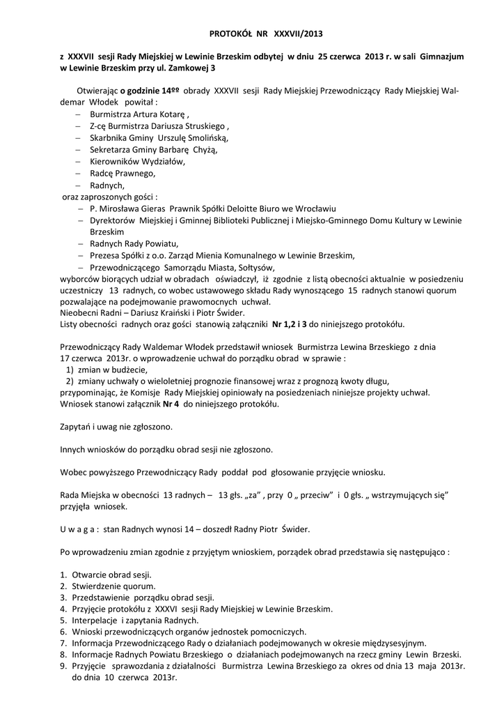 PROTOKÓŁ NR XXXVII/2013 z XXXVII sesji Rady Miejskiej w Lewinie Brzeskim odbytej w dniu 25 czerwca 2013 r. w sali Gimnazjum w Lewinie Brzeskim przy ul. Zamkowej 3 Otwierając o godzinie 14ºº obrady XXXVII sesji Rady Miejskiej Przewodniczący Rady Miejskiej Waldemar Włodek powitał : − Burmistrza Artura Kotarę , − Z-cę Burmistrza Dariusza Struskiego , − Skarbnika Gminy Urszulę Smolińską, − Sekretarza Gminy Barbarę Chyżą, − Kierowników Wydziałów, − Radcę Prawnego, − Radnych, oraz zaproszonych gości : − P. Mirosława Gieras Prawnik Spółki Deloitte Biuro we Wrocławiu − Dyrektorów Miejskiej i Gminnej Biblioteki Publicznej i Miejsko-Gminnego Domu Kultury w Lewinie Brzeskim − Radnych Rady Powiatu, − Prezesa Spółki z o.o. Zarząd Mienia Komunalnego w Lewinie Brzeskim, − Przewodniczącego Samorządu Miasta, Sołtysów, wyborców biorących udział w obradach oświadczył, iż zgodnie z listą obecności aktualnie w posiedzeniu uczestniczy 13 radnych, co wobec ustawowego składu Rady wynoszącego 15 radnych stanowi quorum pozwalające na podejmowanie prawomocnych uchwał. Nieobecni Radni – Dariusz Kraiński i Piotr Świder. Listy obecności radnych oraz gości stanowią załączniki Nr 1,2 i 3 do niniejszego protokółu. Przewodniczący Rady Waldemar Włodek przedstawił wniosek Burmistrza Lewina Brzeskiego z dnia 17 czerwca 2013r. o wprowadzenie uchwał do porządku obrad w sprawie : 1) zmian w budżecie, 2) zmiany uchwały o wieloletniej prognozie finansowej wraz z prognozą kwoty długu, przypominając, że Komisje Rady Miejskiej opiniowały na posiedzeniach niniejsze projekty uchwał. Wniosek stanowi załącznik Nr 4 do niniejszego protokółu. Zapytań i uwag nie zgłoszono. Innych wniosków do porządku obrad sesji nie zgłoszono. Wobec powyższego Przewodniczący Rady poddał pod głosowanie przyjęcie wniosku. Rada Miejska w obecności 13 radnych – 13 głs. „za” , przy 0 „ przeciw” i 0 głs. „ wstrzymujących się” przyjęła wniosek. U w a g a : stan Radnych wynosi 14 – doszedł Radny Piotr Świder. Po wprowadzeniu zmian zgodnie z przyjętym wnioskiem, porządek obrad przedstawia się następująco : 1. 2. 3. 4. 5. 6. 7. 8. 9. Otwarcie obrad sesji. Stwierdzenie quorum. Przedstawienie porządku obrad sesji. Przyjęcie protokółu z XXXVI sesji Rady Miejskiej w Lewinie Brzeskim. Interpelacje i zapytania Radnych. Wnioski przewodniczących organów jednostek pomocniczych. Informacja Przewodniczącego Rady o działaniach podejmowanych w okresie międzysesyjnym. Informacje Radnych Powiatu Brzeskiego o działaniach podejmowanych na rzecz gminy Lewin Brzeski. Przyjęcie sprawozdania z działalności Burmistrza Lewina Brzeskiego za okres od dnia 13 maja 2013r. do dnia 10 czerwca 2013r. 2 10. Rozpatrzenie sprawozdania rocznego z wykonania budżetu gminy za 2012r. 1) wystąpienie Burmistrza w sprawie sprawozdania z realizacji budżetu za 2012r., 2) przedstawienie opinii Regionalnej Izby Obrachunkowej do sprawozdania z wykonania budżetu gminy za 2012r. 3) przedstawienie opinii Komisji Rolnictwa i Ochrony Środowiska oraz Rozwoju Gospodarczego, 4) przedstawienie oceny sprawozdania finansowego gminy , sprawozdania z wykonania budżetu gminy za 2012r. przez Komisję Rewizyjną oraz wniosku w sprawie udzielenia absolutorium wraz z opinią Regionalnej Izby Obrachunkowej w sprawie wniosku, 5) dyskusja, 6) podjęcie uchwał w sprawie : a) zatwierdzenia sprawozdania finansowego Gminy Lewin Brzeski wraz ze sprawozdaniem z wykonania budżetu gminy za 2012r. b) udzielenia absolutorium Burmistrzowi Lewina Brzeskiego z tytułu wykonania budżetu gminy za 2012r. 11. Sprawozdanie z działalności instytucji kultury w gminie Lewin Brzeski za 2012r. 12. Podjęcie uchwał w sprawie: 1) zatwierdzenia sprawozdania finansowego za 2012r. Miejskiej i Gminnej Biblioteki Publicznej w Lewinie Brzeskim, 2) zatwierdzenia sprawozdania finansowego za 2012r. Miejsko-Gminnego Domu Kultury w Lewinie Brzeskim, 3) zmian w budżecie, 4) zmiany uchwały o wieloletniej prognozie finansowej wraz z prognozą kwoty długu. 13. Odpowiedzi na interpelacje zgłoszone na poprzednich sesjach. 14. Wolne wnioski i informacje. 15. Zamknięcie obrad sesji. Do pkt 4 Przystępując do omawiania punktu - przyjęcie protokółów z poprzednich sesji XXXVI w bieżącej kadencji, która odbyła się w dniu 28 maja 2013r. Przewodniczący Waldemar Włodek zwrócił się do Radnych z zapytaniem, czy mają uwagi lub wnioski do treści protokółu. Protokół był przesłany pocztą elektroniczną do tych Radnych , którzy wyrazili życzenie otrzymania projektu protokółu oraz w wersji papierowej były do wglądu w Biurze Rady gdzie Radni mieli możliwości zapoznać się z ich treścią. Radni nie zgłosili uwag do treści protokółu oraz wniosku o odczytanie. Wobec powyższego Przewodniczący Rady poddał pod głosowanie przyjęcie protokółu z XXXVI sesji Rady Miejskiej, która odbyła się w dniu 28 maja 2013r. Rada Miejska w obecności 14 radnych – 14 głs. „za” , przy 0 „ przeciw” i 0 głs. „ wstrzymujących się” przyjęła niniejszy protokół. Do pkt 5 Radni zgłosili następujące interpelacje i wnioski : Radny Robert Laszuk z Lewina Brzeskiego zwrócił się z zapytaniem, czy będzie przeprowadzone w gminie odko marzanie, mieszkańcy zwracali się z tym pytaniem i znając sytuację finansową gminy swoje zdanie w tej sprawie wypowiedział. Jednocześnie poinformował, ze zwróci się z tym zapytaniem do Burmistrza. Radny Roman Pudło z Lewina Brzeskiego w n o s i o : 1) naprawę lamp oświetleniowych przy drodze gminnej ul. Zamkowej w Lewinie Brzeskim (obok zakładu PZZ i posesji P. Witkowskiego). 3 2) interwencję u zarządcy drogi powiatowej w związku z nieprawidłowym wykonaniem naprawy ubytków w ul. Kościuszki w Lewinie Brzeskim , ponieważ materiał z którego uzupełniono ubytki kruszy się i nadal są ubytki - szczególnie pomiędzy ul. Kosynierów a Przych