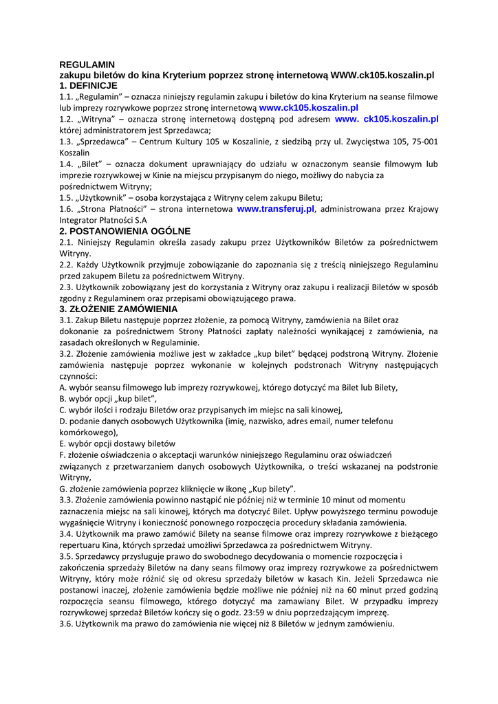REGULAMIN zakupu biletów do kina Kryterium poprzez stronę internetową WWW.ck105.koszalin.pl 1. DEFINICJE 1.1. „Regulamin” – oznacza niniejszy regulamin zakupu i biletów do kina Kryterium na seanse filmowe lub imprezy rozrywkowe poprzez stronę internetową www.ck105.koszalin.pl 1.2. „Witryna” – oznacza stronę internetową dostępną pod adresem www. ck105.koszalin.pl której administratorem jest Sprzedawca; 1.3. „Sprzedawca” – Centrum Kultury 105 w Koszalinie, z siedzibą przy ul. Zwycięstwa 105, 75-001 Koszalin 1.4. „Bilet” – oznacza dokument uprawniający do udziału w oznaczonym seansie filmowym lub imprezie rozrywkowej w Kinie na miejscu przypisanym do niego, możliwy do nabycia za pośrednictwem Witryny; 1.5. „Użytkownik” – osoba korzystająca z Witryny celem zakupu Biletu; 1.6. „Strona Płatności” – strona internetowa www.transferuj.pl, administrowana przez Krajowy Integrator Płatności S.A 2. POSTANOWIENIA OGÓLNE 2.1. Niniejszy Regulamin określa zasady zakupu przez Użytkowników Biletów za pośrednictwem Witryny. 2.2. Każdy Użytkownik przyjmuje zobowiązanie do zapoznania się z treścią niniejszego Regulaminu przed zakupem Biletu za pośrednictwem Witryny. 2.3. Użytkownik zobowiązany jest do korzystania z Witryny oraz zakupu i realizacji Biletów w sposób zgodny z Regulaminem oraz przepisami obowiązującego prawa. 3. ZŁOŻENIE ZAMÓWIENIA 3.1. Zakup Biletu następuje poprzez złożenie, za pomocą Witryny, zamówienia na Bilet oraz dokonanie za pośrednictwem Strony Płatności zapłaty należności wynikającej z zamówienia, na zasadach określonych w Regulaminie. 3.2. Złożenie zamówienia możliwe jest w zakładce „kup bilet” będącej podstroną Witryny. Złożenie zamówienia następuje poprzez wykonanie w kolejnych podstronach Witryny następujących czynności: A. wybór seansu filmowego lub imprezy rozrywkowej, którego dotyczyć ma Bilet lub Bilety, B. wybór opcji „kup bilet”, C. wybór ilości i rodzaju Biletów oraz przypisanych im miejsc na sali kinowej, D. podanie danych osobowych Użytkownika (imię, nazwisko, adres email, numer telefonu komórkowego), E. wybór opcji dostawy biletów F. złożenie oświadczenia o akceptacji warunków niniejszego Regulaminu oraz oświadczeń związanych z przetwarzaniem danych osobowych Użytkownika, o treści wskazanej na podstronie Witryny, G. złożenie zamówienia poprzez kliknięcie w ikonę „Kup bilety”. 3.3. Złożenie zamówienia powinno nastąpić nie później niż w terminie 10 minut od momentu zaznaczenia miejsc na sali kinowej, których ma dotyczyć Bilet. Upływ powyższego terminu powoduje wygaśnięcie Witryny i konieczność ponownego rozpoczęcia procedury składania zamówienia. 3.4. Użytkownik ma prawo zamówić Bilety na seanse filmowe oraz imprezy rozrywkowe z bieżącego repertuaru Kina, których sprzedaż umożliwi Sprzedawca za pośrednictwem Witryny. 3.5. Sprzedawcy przysługuje prawo do swobodnego decydowania o momencie rozpoczęcia i zakończenia sprzedaży Biletów na dany seans filmowy oraz imprezy rozrywkowe za pośrednictwem Witryny, który może różnić się od okresu sprzedaży biletów w kasach Kin. Jeżeli Sprzedawca nie postanowi inaczej, złożenie zamówienia będzie możliwe nie później niż na 60 minut przed godziną rozpoczęcia seansu filmowego, którego dotyczyć ma zamawiany Bilet. W przypadku imprezy rozrywkowej sprzedaż Biletów kończy się o godz. 23:59 w dniu poprzedzającym imprezę. 3.6. Użytkownik ma prawo do zamówienia nie więcej niż 8 Biletów w jednym zamówieniu. 3.7. Użytkownik, zamawiając Bilet ulgowy, przyjmuje do wiadomości i akceptuje, że jego realizacja w Kinie jest możliwa wyłącznie za okazaniem stosownego dokumentu potwierdzającego uprawnienie do ulgi (legitymacji uczniowskiej, studenckiej, emeryckiej, rencisty, Koszalińskiej Karty Dużej Rodziny). Sprzedawca zastrzega, że może odmówić zamiany Biletu na Bilet normalny lub zwrotu Biletu w przypadku nieokazania powyższych dokumentów. 3.8. Użytkownik, który złożył zamówienie, otrzyma potwierdzenie jego przyjęcia w formie wiadomości email, która zostanie wysłana na adres podany podczas składania zamówienia. Potwierdzenie przyjęcia zamówienia zostanie wysłane w czasie nie dłuższym niż 40 minut od otrzymania zamówienia przez Sprzedawcę. Potwierdzenie przyjęcia zamówienia będzie zawierać: A. dane seansu lub imprezy rozrywkowej, na który obowiązywać ma Bilet lub Bilety (kino, data, tytuł filmu lub nazwa imprezy rozrywkowe), B. dane zamówionego Biletu lub Biletów (rodzaj, cena), C. numer transakcji, D. termin wykupu biletów E. Liczbę biletów 3.9 Użytkownik otrzyma również maila z potwierdzeniem dokonania płatności za zakup biletu poprzez Witrynę. 3.10. Cena Biletów wskazana zostanie na podstronie Witryny podczas składania zamówienia oraz w potwierdzeniu przyjęcia zamówienia. 3.11. Sprzedawca zastrzega sobie prawo do niewystawiania do sprzedaży wszystkich rodzajów Biletów. 4. PŁATNOŚĆ 4.1. Płatność za Bilet zamówiony za pośrednictwem Witryny możliwa będzie wyłącznie za pomocą Strony Płatności, na którą Użytkownik zostanie przekierowany bezpośrednio po złożeniu zamówienia. 4.2. Użytkownik ma możliwość zapłaty za zamówione Bilety wyłącznie za pomocą form płatności udostępnionych na Stronie Płatności. 4.3. Płatność wynikająca z jednego zamówienia powinna zostać dokonana jednorazowo, w całości oraz zawierać cenę wszystkich zamówionych Biletów. Użytkownikowi nie przysługuje prawo do wykonania płatności na raty lub oddzielnie za poszczególne Bilety. 4.4. Płatność powinna być dokonana nie wcześniej niż w momencie złożenia zamówienia i nie później niż w terminie 30 minut od złożenia zamówienia. Po bezskutecznym upływie terminu na dokonanie płatności zamówienie Użytkownika zostanie anulowane. 4.5. Płatność dokonana po up