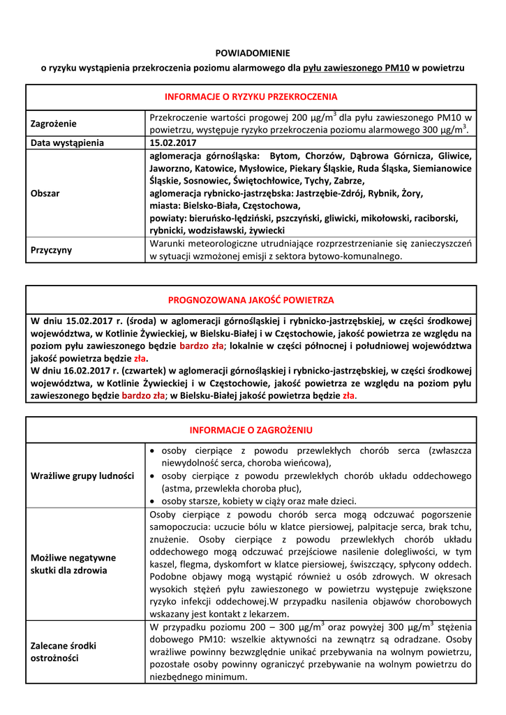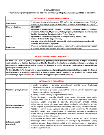 POWIADOMIENIE o ryzyku wystąpienia przekroczenia poziomu alarmowego dla pyłu zawieszonego PM10 w powietrzu INFORMACJE O RYZYKU PRZEKROCZENIA Zagrożenie Data wystąpienia Obszar Przyczyny Przekroczenie wartości progowej 200 µg/m3 dla pyłu zawieszonego PM10 w powietrzu, występuje ryzyko przekroczenia poziomu alarmowego 300 µg/m3. 15.02.2017 aglomeracja górnośląska: Bytom, Chorzów, Dąbrowa Górnicza, Gliwice, Jaworzno, Katowice, Mysłowice, Piekary Śląskie, Ruda Śląska, Siemianowice Śląskie, Sosnowiec, Świętochłowice, Tychy, Zabrze, aglomeracja rybnicko-jastrzębska: Jastrzębie-Zdrój, Rybnik, Żory, miasta: Bielsko-Biała, Częstochowa, powiaty: bieruńsko-lędziński, pszczyński, gliwicki, mikołowski, raciborski, rybnicki, wodzisławski, żywiecki Warunki meteorologiczne utrudniające rozprzestrzenianie się zanieczyszczeń w sytuacji wzmożonej emisji z sektora bytowo-komunalnego. PROGNOZOWANA JAKOŚĆ POWIETRZA W dniu 15.02.2017 r. (środa) w aglomeracji górnośląskiej i rybnicko-jastrzębskiej, w części środkowej województwa, w Kotlinie Żywieckiej, w Bielsku-Białej i w Częstochowie, jakość powietrza ze względu na poziom pyłu zawieszonego będzie bardzo zła; lokalnie w części północnej i południowej województwa jakość powietrza będzie zła. W dniu 16.02.2017 r. (czwartek) w aglomeracji górnośląskiej i rybnicko-jastrzębskiej, w części środkowej województwa, w Kotlinie Żywieckiej i w Częstochowie, jakość powietrza ze względu na poziom pyłu zawieszonego będzie bardzo zła; w Bielsku-Białej jakość powietrza będzie zła. INFORMACJE O ZAGROŻENIU Wrażliwe grupy ludności Możliwe negatywne skutki dla zdrowia Zalecane środki ostrożności osoby cierpiące z powodu przewlekłych chorób serca (zwłaszcza niewydolność serca, choroba wieńcowa), osoby cierpiące z powodu przewlekłych chorób układu oddechowego (astma, przewlekła choroba płuc), osoby starsze, kobiety w ciąży oraz małe dzieci. Osoby cierpiące z powodu chorób serca mogą odczuwać pogorszenie samopoczucia: uczucie bólu w klatce piersiowej, palpitacje serca, brak tchu, znużenie. Osoby cierpiące z powodu przewlekłych chorób układu oddechowego mogą odczuwać przejściowe nasilenie dolegliwości, w tym kaszel, flegma, dyskomfort w klatce piersiowej, świszczący, spłycony oddech. Podobne objawy mogą wystąpić również u osób zdrowych. W okresach wysokich stężeń pyłu zawieszonego w powietrzu występuje zwiększone ryzyko infekcji oddechowej.W przypadku nasilenia objawów chorobowych wskazany jest kontakt z lekarzem. W przypadku poziomu 200 – 300 µg/m3 oraz powyżej 300 µg/m3 stężenia dobowego PM10: wszelkie aktywności na zewnątrz są odradzane. Osoby wrażliwe powinny bezwzględnie unikać przebywania na wolnym powietrzu, pozostałe osoby powinny ograniczyć przebywanie na wolnym powietrzu do niezbędnego minimum. DZIAŁANIA ZMIERZAJĄCE DO OGRANICZENIA PRZEKROCZEŃ Zakres działań krótkoterminowych Zgodnie z Programem Ochrony Powietrza, w szczególności: wzmożone kontrole indywidualnych kotłów i pieców, w tym nakładanie kar za naruszanie przepisów zakazujących spalania odpadów, nie palenie ognisk i pozostałości roślinnych na powierzchni ziemi, rezygnacja z palenia w kominkach, jeżeli nie stanowią one jedynego źródła ogrzewania. INFORMACJE ORGANIZACYJNE Data wydania Podstawa prawna Źródła danych Opracowanie Publikacja powiadomienia 15.02.2017 Ustawa z dnia 27 kwietnia 2001 r. Prawo ochrony środowiska Wojewódzki Inspektorat Ochrony Środowiska w Katowicach – dane z systemu monitoringu jakości powietrza Zakład Modelowania Zanieczyszczeń Powietrza IMGW–PIB w Warszawie z siedzibą w Katowicach - prognoza jakości powietrza na kolejną dobę Wojewódzki Inspektorat Ochrony Środowiska w Katowicach http://www.katowice.wios.gov.pl