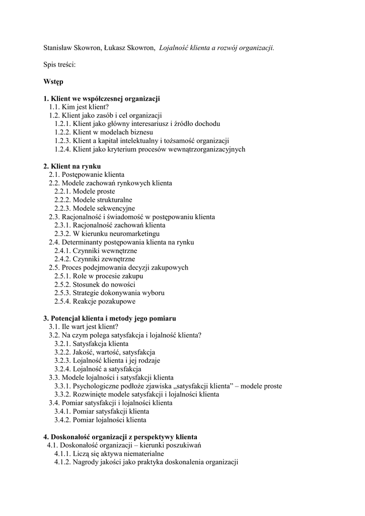 Stanisław Skowron, Łukasz Skowron, Lojalność klienta a rozwój organizacji. Spis treści: Wstęp 1. Klient we współczesnej organizacji 1.1. Kim jest klient? 1.2. Klient jako zasób i cel organizacji 1.2.1. Klient jako główny interesariusz i źródło dochodu 1.2.2. Klient w modelach biznesu 1.2.3. Klient a kapitał intelektualny i tożsamość organizacji 1.2.4. Klient jako kryterium procesów wewnątrzorganizacyjnych 2. Klient na rynku 2.1. Postępowanie klienta 2.2. Modele zachowań rynkowych klienta 2.2.1. Modele proste 2.2.2. Modele strukturalne 2.2.3. Modele sekwencyjne 2.3. Racjonalność i świadomość w postępowaniu klienta 2.3.1. Racjonalność zachowań klienta 2.3.2. W kierunku neuromarketingu 2.4. Determinanty postępowania klienta na rynku 2.4.1. Czynniki wewnętrzne 2.4.2. Czynniki zewnętrzne 2.5. Proces podejmowania decyzji zakupowych 2.5.1. Role w procesie zakupu 2.5.2. Stosunek do nowości 2.5.3. Strategie dokonywania wyboru 2.5.4. Reakcje pozakupowe 3. Potencjał klienta i metody jego pomiaru 3.1. Ile wart jest klient? 3.2. Na czym polega satysfakcja i lojalność klienta? 3.2.1. Satysfakcja klienta 3.2.2. Jakość, wartość, satysfakcja 3.2.3. Lojalność klienta i jej rodzaje 3.2.4. Lojalność a satysfakcja 3.3. Modele lojalności i satysfakcji klienta 3.3.1. Psychologiczne podłoże zjawiska „satysfakcji klienta” – modele proste 3.3.2. Rozwinięte modele satysfakcji i lojalności klienta 3.4. Pomiar satysfakcji i lojalności klienta 3.4.1. Pomiar satysfakcji klienta 3.4.2. Pomiar lojalności klienta 4. Doskonałość organizacji z perspektywy klienta 4.1. Doskonałość organizacji – kierunki poszukiwań 4.1.1. Liczą się aktywa niematerialne 4.1.2. Nagrody jakości jako praktyka doskonalenia organizacji 4.1.3. Lojalność i zadowolenie klienta w świetle norm ISO 9000/9001 4.2. Modele oceny przedsiębiorstw wg perspektywy generowania wartości dla klienta 4.2.1. EFQM Excellence Model 4.2.2. Duński Diament 4.2.3. Zrównoważona Karta Wyników (BSC) 4.3. Model tworzenia i konsumowania wartości 5. Klient i jego bank w świetle badań empirycznych 5.1. Satysfakcja i lojalność klienta usług bankowych 5.1.1. Metodyka badań 5.1.2. Respondenci i „ich” banki 5.1.3. Proces budowania satysfakcji i lojalności wg analizy regresyjnej 5.1.4. Proces budowania satysfakcji i lojalności wg modelu ścieżkowego 5.1.5. Wnioski badawcze 5.2. Bank – instytucja zorientowana na klienta 5.2.1. Metodyka badań 5.2.2. Proces tworzenia wartości dla klienta 5.2.3. Kluczowe obszary sukcesu w działalności banku 5.2.4. Klient jako wymiar strategii banku 6. Potencjał klienta jako metakryterium doskonalenia organizacji 6.1. Budowa długotrwałych i efektywnych relacji firmy z jej klientami – główne wyzwanie marketingu 6.2. Przywództwo i kultura organizacyjna nastawione na partnerstwo klienta 6.3. Zmotywowany pracownik to zadowolony klient – wyzwanie dla polityki kadrowej 6.4. Controlling stanu klienta 6.5. Lojalność klienta jako kryterium budowania strategii Zakończenie Bibliografia Spis rysunków Spis tabel