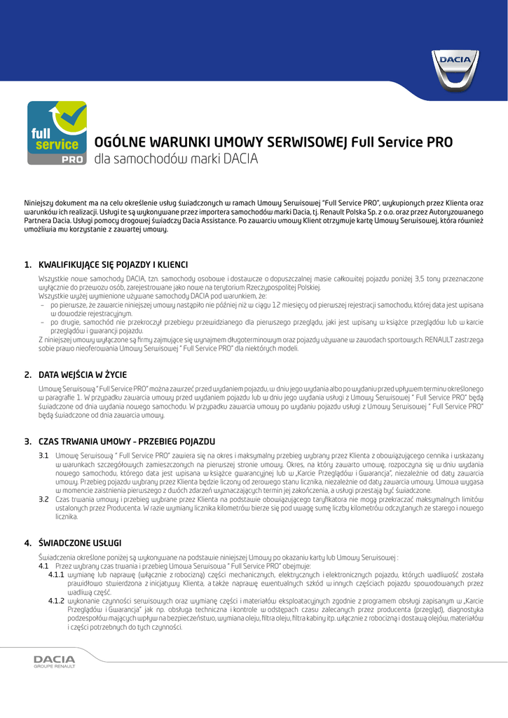 OGÓLNE WARUNKI UMOWY SERWISOWEJ Full Service PRO dla samochodów marki DACIA Niniejszy dokument ma na celu określenie usług świadczonych w ramach Umowy Serwisowej “Full Service PRO”, wykupionych przez Klienta oraz warunków ich realizacji. Usługi te są wykonywane przez importera samochodów marki Dacia, tj. Renault Polska Sp. z o.o. oraz przez Autoryzowanego Partnera Dacia. Usługi pomocy drogowej świadczy Dacia Assistance. Po zawarciu umowy Klient otrzymuje kartę Umowy Serwisowej, która również umożliwia mu korzystanie z zawartej umowy. 1. KWALIFIKUJĄCE SIĘ POJAZDY I KLIENCI Wszystkie nowe samochody DACIA, tzn. samochody osobowe i dostawcze o dopuszczalnej masie całkowitej pojazdu poniżej 3,5 tony przeznaczone wyłącznie do przewozu osób, zarejestrowane jako nowe na terytorium Rzeczypospolitej Polskiej. Wszystkie wyżej wymienione używane samochody DACIA pod warunkiem, że: – po pierwsze, że zawarcie niniejszej umowy nastąpiło nie później niż w ciągu 12 miesięcy od pierwszej rejestracji samochodu, której data jest wpisana w dowodzie rejestracyjnym. – po drugie, samochód nie przekroczył przebiegu przewidzianego dla pierwszego przeglądu, jaki jest wpisany w książce przeglądów lub w karcie przeglądów i gwarancji pojazdu. Z niniejszej umowy wyłączone są firmy zajmujące się wynajmem długoterminowym oraz pojazdy używane w zawodach sportowych. RENAULT zastrzega sobie prawo nieoferowania Umowy Serwisowej “ Full Service PRO” dla niektórych modeli. 2. DATA WEJŚCIA W ŻYCIE Umowę Serwisową “ Full Service PRO” można zawrzeć przed wydaniem pojazdu, w dniu jego wydania albo po wydaniu przed upływem terminu określonego w paragrafie 1. W przypadku zawarcia umowy przed wydaniem pojazdu lub w dniu jego wydania usługi z Umowy Serwisowej “ Full Service PRO” będą świadczone od dnia wydania nowego samochodu. W przypadku zawarcia umowy po wydaniu pojazdu usługi z Umowy Serwisowej “ Full Service PRO” będą świadczone od dnia zawarcia umowy. 3. CZAS TRWANIA UMOWY – PRZEBIEG POJAZDU 3.1 Umowę Serwisową “ Full Service PRO” zawiera się na okres i maksymalny przebieg wybrany przez Klienta z obowiązującego cennika i wskazany w warunkach szczegółowych zamieszczonych na pierwszej stronie umowy. Okres, na który zawarto umowę, rozpoczyna się w dniu wydania nowego samochodu, którego data jest wpisana w książce gwarancyjnej lub w „Karcie Przeglądów i Gwarancja”, niezależnie od daty zawarcia umowy. Przebieg pojazdu wybrany przez Klienta będzie liczony od zerowego stanu licznika, niezależnie od daty zawarcia umowy. Umowa wygasa w momencie zaistnienia pierwszego z dwóch zdarzeń wyznaczających termin jej zakończenia, a usługi przestają być świadczone. 3.2 Czas trwania umowy i przebieg wybrane przez Klienta na podstawie obowiązującego taryfikatora nie mogą przekraczać maksymalnych limitów ustalonych przez Producenta. W razie wymiany licznika kilometrów bierze się pod uwagę sumę liczby kilometrów odczytanych ze starego i nowego licznika. 4. ŚWIADCZONE USŁUGI Świadczenia określone poniżej są wykonywane na podstawie niniejszej Umowy po okazaniu karty lub Umowy Serwisowej : 4.1 Przez wybrany czas trwania i przebieg Umowa Serwisowa “ Full Service PRO” obejmuje: 4.1.1 wymianę lub naprawę (włącznie z robocizną) części mechanicznych, elektrycznych i elektronicznych pojazdu, których wadliwość została prawidłowo stwierdzona z inicjatywy Klienta, a także naprawę ewentualnych szkód w innych częściach pojazdu spowodowanych przez wadliwą część. 4.1.2 wykonanie czynności serwisowych oraz wymianę części i materiałów eksploatacyjnych zgodnie z programem obsługi zapisanym w „Karcie Przeglądów i Gwarancja” jak np. obsługa techniczna i kontrole w odstępach czasu zalecanych przez producenta (przegląd), diagnostyka podzespołów mających wpływ na bezpieczeństwo, wymiana oleju, filtra oleju, filtra kabiny itp. włącznie z robocizną i dostawą olejów, materiałów i części potrzebnych do tych czynności. 4.2 Umowa Serwisowa “ Full Service PRO” nie obejmuje: – prewencyjnej wymiany części eksploatacyjnych, – pośrednich skutków ewentualnej wady (straty w działalności, czas unieruchomienia, itp.). Klient może natomiast skorzystać ze środków prawnych w celu dochodzenia roszczeń na drodze sądowej, – elementów pojazdu, które były poddawane modyfikacji ani skutków (jak zniszczenie, przedwczesne zużycie, uszkodzenie, itp.) modyfikacji innych części lub podzespołów pojazdu, lub zmian jego parametrów, – pogorszenia stanu technicznego wynikającego z ignorowania sygnałów ostrzegawczych podawanych przez instrumenty pokładowe oraz nieprzestrzegania zaleceń zamieszczonych w instrukcji obsługi, książce gwarancyjnej i książce przeglądów lub w karcie przeglądów i gwarancji pojazdu, – następujących części i podzespołów: opon i obręczy kół, tapicerki, obić, deski rozdzielczej, nawiewów powietrza, kołpaków kół, ręcznych elementów sterujących na desce rozdzielczej, ręcznych elementów sterujących drzwi i szyb, popielniczek, akumulatora, lusterek zewnętrznych, ogrzewania szyb, sprzęgła, układu wydechowego, lamp wyładowczych (ksenon), wykładziny podłogowej, obszycia kierownicy. Wyłączone są również: radioodtwarzacze, wszelkie wyposażenie audio i jego akcesoria, systemy alarmowe, poza montowanymi fabrycznie, – uszkodzeń spowodowanych następującymi przyczynami zewnętrznymi: • • • • • • wypadki, kolizje, uderzenia, mniejsze i większe zarysowania, uderzenia żwiru lub innych ciał stałych, grad, akty wandalizmu, stłuczenia szyb, opady substancji związane ze zjawiskiem zanieczyszczenia powietrza, spady z drzew i roślin jak np. spady żywiczne, opadające substancje pochodzenia zwierzęcego jak np. ptasie odchody, opady substancji chemicznych, parowanie reflektorów, lamp i halogenów pod wpływe