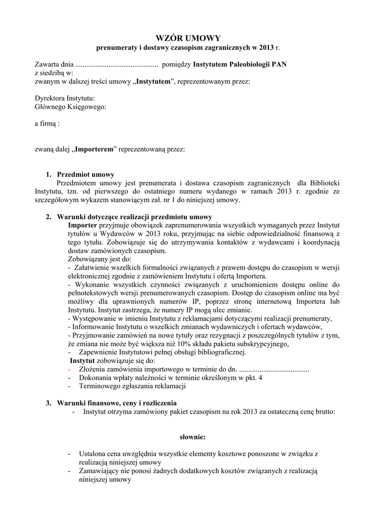 WZÓR UMOWY prenumeraty i dostawy czasopism zagranicznych w 2013 r. Zawarta dnia ............................................. pomiędzy Instytutem Paleobiologii PAN z siedzibą w: zwanym w dalszej treści umowy „Instytutem”, reprezentowanym przez: Dyrektora Instytutu: Głównego Księgowego: a firmą : zwaną dalej „Importerem” reprezentowaną przez: 1. Przedmiot umowy Przedmiotem umowy jest prenumerata i dostawa czasopism zagranicznych dla Biblioteki Instytutu, tzn. od pierwszego do ostatniego numeru wydanego w ramach 2013 r. zgodnie ze szczegółowym wykazem stanowiącym zał. nr 1 do niniejszej umowy. 2. Warunki dotyczące realizacji przedmiotu umowy Importer przyjmuje obowiązek zaprenumerowania wszystkich wymaganych przez Instytut tytułów u Wydawców w 2013 roku, przyjmując na siebie odpowiedzialność finansową z tego tytułu. Zobowiązuje się do utrzymywania kontaktów z wydawcami i koordynacją dostaw zamówionych czasopism. Zobowiązany jest do: - Załatwienie wszelkich formalności związanych z prawem dostępu do czasopism w wersji elektronicznej zgodnie z zamówieniem Instytutu i ofertą Importera. - Wykonanie wszystkich czynności związanych z uruchomieniem dostępu online do pełnotekstowych wersji prenumerowanych czasopism. Dostęp do czasopism online ma być możliwy dla uprawnionych numerów IP, poprzez stronę internetową Importera lub Instytutu. Instytut zastrzega, że numery IP mogą ulec zmianie. - Występowanie w imieniu Instytutu z reklamacjami dotyczącymi realizacji prenumeraty, - Informowanie Instytutu o wszelkich zmianach wydawniczych i ofertach wydawców, - Przyjmowanie zamówień na nowe tytuły oraz rezygnacji z poszczególnych tytułów z tym, że zmiana nie może być większa niż 10% składu pakietu subskrypcyjnego, - Zapewnienie Instytutowi pełnej obsługi bibliograficznej. Instytut zobowiązuje się do: - Złożenia zamówienia importowego w terminie do dn. ...................................... - Dokonania wpłaty należności w terminie określonym w pkt. 4 - Terminowego zgłaszania reklamacji 3. Warunki finansowe, ceny i rozliczenia - Instytut otrzyma zamówiony pakiet czasopism na rok 2013 za ostateczną cenę brutto: słownie: - Ustalona cena uwzględnia wszystkie elementy kosztowe ponoszone w związku z realizacją niniejszej umowy Zamawiający nie ponosi żadnych dodatkowych kosztów związanych z realizacją niniejszej umowy - Faktura proforma VAT zostanie zapłacona na konto ............................................................................................................................................. Wpłata zostanie potwierdzona przez Importera fakturą VAT w terminie 7 dni od ukazania się przedpłaty na rachunku Importera - Za nie dostarczone lub nie opublikowane numery czasopism (np. czasopismo przestanie się ukazywać) Instytutowi przysługuje refundacja. Ostateczne rozliczenie nastąpi na podstawie faktur korygujących - W przypadku rozszerzenia zakresu umowy, np. zmieni się cykl wydawniczy zaprenumerowanego tytułu, ukaże się więcej woluminów/numerów niż przewidziano to w zamówieniu i wycenie, wzrost kosztu umowy ustalony zostanie na podstawie aneksu. Za rozszerzenie zakresu dostawy strony umowy uznają wydanie przez Zamawiającego pisemnego zlecenia wykonania dodatkowych elementów dostawy. - Oferta wraz ze wszystkimi załącznikami stanowi integralną część umowy. 4. Dostawy Wszystkie przesyłki będą adresowane według danych przekazanych przez Instytut. Prenumerowane czasopisma będą dostarczane bezpośrednio od wydawców na adres wymieniony w zamówieniu. 5. Prawo zamawiającego od odstąpienia od umowy W razie wystąpienia istotnej zmiany okoliczności powodującej, że wykonanie umowy nie leży w interesie publicznym, czego nie można było przewidzieć w chwili zawarcia umowy, Zamawiający może odstąpić od umowy w terminie miesiąca od powzięcia wiadomości o powyższych okolicznościach. W takim przypadku wykonawca może żądać jedynie wynagrodzenia należnego mu z tytułu wykonania części umowy. 6. Postanowienia końcowe - - We wszystkich nieuregulowanych Umową sprawach obowiązują odpowiednie przepisy kodeksu cywilnego Umowa zostaje zawarta od 01 stycznia do 31 grudnia 2013 r. Instytut ma prawo ją wypowiedzieć w trybie natychmiastowym, gdy dostawa czasopism nie nastąpi mimo pisemnych reklamacji i upływem określonych terminów. Wszelkie zmiany postanowień umowy wymagają dla swej ważności formy pisemnej w postaci aneksu podpisanego przez obie strony. Ewentualne spory wynikłe na tle wykonania umowy podlegają rozstrzygnięciu przez Sądy Powszechne właściwe miejscowo i rzeczowo dla Instytutu. W przypadku zaistnienia sporu strony będą brały pod uwagę treść: Umowy Oferty Umowa obowiązuje po podpisaniu jej przez obie Strony. Umowa niniejsza został sporządzona w dwóch jednobrzmiących egzemplarzach, po 1 dla każdej ze Stron. IMPORTER INSTYTUT
