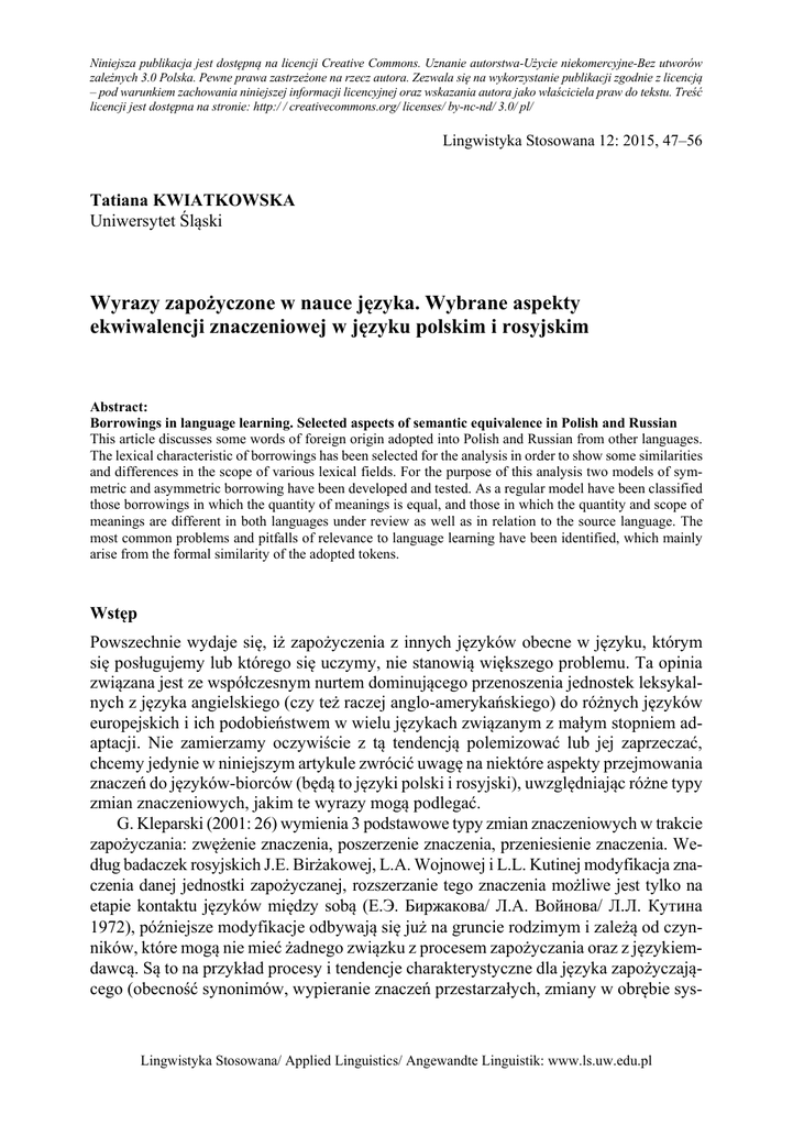 Niniejsza publikacja jest dostępną na licencji Creative Commons. Uznanie autorstwa-Użycie niekomercyjne-Bez utworów zależnych 3.0 Polska. Pewne prawa zastrzeżone na rzecz autora. Zezwala się na wykorzystanie publikacji zgodnie z licencją – pod warunkiem zachowania niniejszej informacji licencyjnej oraz wskazania autora jako właściciela praw do tekstu. Treść licencji jest dostępna na stronie: http:/ / creativecommons.org/ licenses/ by-nc-nd/ 3.0/ pl/ Lingwistyka Stosowana 12: 2015, 47–56 Tatiana KWIATKOWSKA Uniwersytet Śląski Wyrazy zapożyczone w nauce języka. Wybrane aspekty ekwiwalencji znaczeniowej w języku polskim i rosyjskim Abstract: Borrowings in language learning. Selected aspects of semantic equivalence in Polish and Russian This article discusses some words of foreign origin adopted into Polish and Russian from other languages. The lexical characteristic of borrowings has been selected for the analysis in order to show some similarities and differences in the scope of various lexical fields. For the purpose of this analysis two models of symmetric and asymmetric borrowing have been developed and tested. As a regular model have been classified those borrowings in which the quantity of meanings is equal, and those in which the quantity and scope of meanings are different in both languages under review as well as in relation to the source language. The most common problems and pitfalls of relevance to language learning have been identified, which mainly arise from the formal similarity of the adopted tokens. Wstęp Powszechnie wydaje się, iż zapożyczenia z innych języków obecne w języku, którym się posługujemy lub którego się uczymy, nie stanowią większego problemu. Ta opinia związana jest ze współczesnym nurtem dominującego przenoszenia jednostek leksykalnych z języka angielskiego (czy też raczej anglo-amerykańskiego) do różnych języków europejskich i ich podobieństwem w wielu językach związanym z małym stopniem adaptacji. Nie zamierzamy oczywiście z tą tendencją polemizować lub jej zaprzeczać, chcemy jedynie w niniejszym artykule zwrócić uwagę na niektóre aspekty przejmowania znaczeń do języków-biorców (będą to języki polski i rosyjski), uwzględniając różne typy zmian znaczeniowych, jakim te wyrazy mogą podlegać. G. Kleparski (2001: 26) wymienia 3 podstawowe typy zmian znaczeniowych w trakcie zapożyczania: zwężenie znaczenia, poszerzenie znaczenia, przeniesienie znaczenia. Według badaczek rosyjskich J.E. Birżakowej, L.A. Wojnowej i L.L. Kutinej modyfikacja znaczenia danej jednostki zapożyczanej, rozszerzanie tego znaczenia możliwe jest tylko na etapie kontaktu języków między sobą (Е.Э. Биржакова/ Л.А. Войнова/ Л.Л. Кутина 1972), późniejsze modyfikacje odbywają się już na gruncie rodzimym i zależą od czynników, które mogą nie mieć żadnego związku z procesem zapożyczania oraz z językiemdawcą. Są to na przykład procesy i tendencje charakterystyczne dla języka zapożyczającego (obecność synonimów, wypieranie znaczeń przestarzałych, zmiany w obrębie sys- Lingwistyka Stosowana/ Applied Linguistics/ Angewandte Linguistik: www.ls.uw.edu.pl Tatiana KWIATKOWSKA 48 temu, zmiany normy językowej i uzusu). Te właśnie możliwe modyfikacje będą nas interesowały w aspekcie konfrontatywnym polsko-rosyjskim, spróbujemy zbadać i na konkretnym materiale pokazać paralele i różnice w sposobie istnienia jednostek zapożyczonych do języków polskiego i rosyjskiego. Jak wiadomo, słowo zapożyczone nazywa mniejszy fragment rzeczywistości w języku-biorcy niż w języku, który jest źródłem tego zapożyczenia. Dodatkowo wyraz zapożyczony ma mniejszy potencjał znaczeniowy i kontekstualny (Л. Гребинник 2008: 120), ponieważ zapożyczenie leksemu czyli swego rodzaju „wyjęcie, wyrwanie” wyrazu z systemu, może powodować naturalne pozbawienie go wszelkich związków i skojarzeń, które posiadał on, będąc w systemie danego języka, tym samym wiąże go silniej z przedmiotem nominacji (Л. Гребинник 2008: 122). Jest to proces jednoczesny. Zdaniem wielu współczesnych lingwistów słowo pozbawione wewnętrznych związków i swoistej formy znaczeniowej, wewnętrznej, żyje swoim życiem i może być na gruncie języka zapożyczającego zmodyfikowane do takiego stopnia, który nie będzie miał już nic wspólnego z jednostką zapożyczoną i językiem-dawcą (З.Н. Козлова 1970: 93). Badania zestawiające leksemy, w których obserwujemy podobieństwa (mogą one oczywiście być tylko formalne lub wręcz fałszywe) na poziomie leksyki mają długą historię i są szczególnie ważne dla dydaktyki języka obcego. Ponadto badania porównawcze zakresu znaczeniowego wyrazów mają często na celu doskonalenie praktyki tłumaczeniowej (M. Tryuk 1989: 13). Symetria bądź też asymetria znaczeń wyrazów obcych zależy w dużym stopniu, jak pisze K. Luciński (2000: 99) w opracowaniu dotyczącym anglicyzmów, od specyfiki danego języka-biorcy oraz aktualnego „zapotrzebowania” na określone słowa. Dlatego też część leksyki, którą uznamy za symetryczną pod względem znaczeń to najczęściej słowa niezbędne i uznane przez dany system językowy za konieczne w procesie komunikacji. Innym wariantem istnienia zapożyczenia jest jego niezbędność na początkowym etapie, wyparta na przestrzeni czasu przez jednostkę rodzimą lub inne zapożyczenie. Jeszcze innym sposobem istnienia jest pozostanie na etapie wtrętu obcojęzycznego bez oswojenia na gruncie rodzimym. W niniejszym szkicu wzięte zostaną pod uwagę leksemy zapożyczone do obu języków, rosyjskiego i polskiego, w których obserwujemy formalne i znaczeniowe podobieństwo, wynikające z tego samego źródła zapożyczenia (z możliwością udziału języków-pośredników), dla których możliwe jest porównanie znaczeń, ich ewentualnych modyfikacji oraz braku 