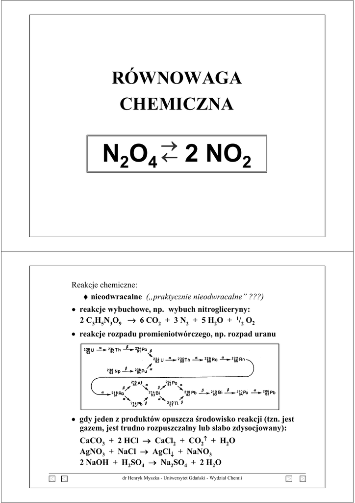 RÓWNOWAGA CHEMICZNA → N2O4 ← 2 NO2 Reakcje chemiczne: ♦ nieodwracalne („praktycznie nieodwracalne” ???) • reakcje wybuchowe, np. wybuch nitrogliceryny: 2 C3H5N3O9 → 6 CO2 + 3 N2 + 5 H2O + 1/2 O2 • reakcje rozpadu promieniotwórczego, np. rozpad uranu • gdy jeden z produktów opuszcza środowisko reakcji (tzn. jest gazem, jest trudno rozpuszczalny lub słabo zdysocjowany): CaCO3 + 2 HCl → CaCl2 + CO2↑ + H2O AgNO3 + NaCl → AgCl↓ + NaNO3 2 NaOH + H2SO4 → Na2SO4 + 2 H2O dr Henryk Myszka - Uniwersytet Gdański - Wydział Chemii ♦ odwracalne aA + bB → ← cC + dD → v1 v1 = k1 · cAa · cBb ← v2 v2 = k2 · cCc · cDd W stanie równowagi chemicznej obie szybkości są sobie równe: v1 = v2 (v1 = v2 > 0; równowaga dynamiczna) ponieważ dla oznaczenia stężeń molowych substratów i produktów w stanie równowagi stosuje się symbole: [A], [B], [C], [D], więc: k1 · [A]a · [B]b = k2 · [C]c · [D]d [C]c ⋅ [D]d Kc = [A]a ⋅ [B]b „prawo działania mas” Kc - stężeniowa stała równowagi (zależy od temperatury); dr Henryk Myszka - Uniwersytet Gdański - Wydział Chemii Kp i Kx - stałe równowagi, w których stężenia substancji są wyrażone za pomocą ciśnień cząstkowych lub ułamków molowych; p cC ⋅ p dD Kp = a b pA ⋅ pB x cC ⋅ x dD Kx = a b x A ⋅ xB ⎛ R ⋅T ⎞ ⎟⎟ K x = K c ⋅ ⎜⎜ ⎝ p ⎠ Δn K x = K p ⋅ p −Δn K p = K c ⋅ (R ⋅ T)Δn Δn - różnica pomiędzy liczbą moli gazowych produktów i substratów Δn = (c + d) − (a + b) gdy n = 0 to Kc = Kx = Kp termodynamiczna stała równowagi: a cC ⋅ a dD Ka = a b a A ⋅ aB dr Henryk Myszka - Uniwersytet Gdański - Wydział Chemii Reakcje odwracalne pomiędzy substancjami w różnych fazach: (g) − gaz, (c) − ciecz, (s) − ciało stałe FeO(s) + CO(g) Kc = [CO 2 ] [CO] → ← Kp = CaCO3(s) → ← Fe(s) + CO2(g) p CO2 p CO Kx = x CO2 xCO CaO(s) + CO2(g) K p = p CO 2 „Stała równowagi reakcji przebiegającej w danym kierunku jest zawsze równa odwrotności stałej równowagi reakcji przebiegającej w kierunku przeciwnym.” → ← (1) H2O (2) 2 H2O H2 + 1/2 O2 → ← 2 H2 + O2 K (1) c = [H2 ] ⋅ [O2 ]1/2 [H2O] K (2) c = [H2 ]2 ⋅ [O2 ] [H2O]2 2 (2) ⇒ (K(1) c ) = Kc dr Henryk Myszka - Uniwersytet Gdański - Wydział Chemii WPŁYW CZYNNIKÓW ZEWNĘTRZNYCH NA RÓWNOWAGĘ CHEMICZNĄ Wartość Kc wskazuje czy uprzywilejowane są substraty (nieb. kw.) czy produkty reakcji (pom. kw.). Substraty przeważają, gdy Kc jest małe, a produkty gdy Kc jest duże. Ilość substratów i produktów jest jednakowa, gdy wartość Kc jest zbliżona do jedności. Parametry zewnętrzne: • • • • stężenie reagentów ciśnienie katalizator temperatura W praktyce przesuwanie równowagi reakcji w pożądanym kierunku prowadzi się poprzez równoczesną zmianę kilku czynników warunkujących tę równowagę. dr Henryk Myszka - Uniwersytet Gdański - Wydział Chemii Reguła przekory Le Chateliera – Brauna Karl Ferdinand Braun (1850-1918) Nagroda Nobla w 1909 r. Henri Louis Le Chatelier (1850-1936) „Jeżeli na układ znajdujący się w stanie równowagi działa jakiś bodziec zewnętrzny, to układ zachowuje się w taki sposób, aby osłabić jego działanie, poprzez osiągnięcie nowego stanu równowagi.” „Każdej akcji odpowiada kontrakcja” dr Henryk Myszka - Uniwersytet Gdański - Wydział Chemii • stężenie reagentów zmiana stężenia jednej lub kilku substancji reagujących wywołuje zmianę stężenia pozostałych substancji z zachowaniem wartości stałej równowagi; • zwiększenie stężenia substratów będzie prowadziło do zwiększenia stężenia produktów, a więc będzie przesuwało równowagę w prawo; • ten sam efekt, tzn. przesunięcia równowagi w prawo, można wywołać przez zmniejszenie stężenia produktów, poprzez ich usuwanie ze środowiska reakcji; • odwrotny proces, przesuwania równowagi reakcji w lewo, może być wywołany przez zwiększenie stężenia produktów lub zmniejszenie stężenia substratów; np. 2 SO2 + O2 2 NOCl → ← → ← 2 SO3 2 NO + Cl2 dr Henryk Myszka - Uniwersytet Gdański - Wydział Chemii • ciśnienie zmiana ciśnienia ogólnego układu może wywołać przesunięcie stanu równowagi reakcji przebiegającej w fazie gazowej, ale tylko, gdy sumy liczby moli gazowych substratów i produktów są różne; • wzrost ciśnienia zewnętrznego przesuwa równowagę w kierunku reakcji, w której objętość składników gazowych jest mniejsza; p1 · V1 = p2 · V2 np. 3 H2 + N2 → ← 2 NH3 - wzrost ciśnienia ogólnego (zmniejszenie objętości) przesuwa równowagę reakcji w prawo; - zwiększenie objętości (zmniejszenie ciśnienia) przesuwa równowagę reakcji w lewo; np. C(s) + H2O → ← CO + H2 http://www.chm.davidson.edu/ChemistryApplets/equilibria/Volume.html Równowaga.html.url dr Henryk Myszka - Uniwersytet Gdański - Wydział Chemii np. N2O4 → ← 2 NO2 - wzrost ciśnienia ogólnego (zmniejszenie objętości) przesuwa równowagę reakcji w lewo; - zwiększenie objętości (zmniejszenie ciśnienia) przesuwa równowagę reakcji w prawo; np. H2 + Cl2 → ← 2 HCl - zmiana ciśnienia ogólnego nie wywiera wpływu na stan równowagi tej reakcji, ponieważ liczba moli (objętości) gazowych substratów jest równa liczbie moli (objętości) gazowego produktu, co oznacza, iż objętość układu nie ulega zmianie; • katalizator obecność katalizatora nie ma wpływu na położenie stanu równowagi, powoduje jedynie szybsze jego osiągnięcie dr Henryk Myszka - Uniwersytet Gdański - Wydział Chemii • temperatura 1/ zmiana temperatury powoduje nie tylko przesunięcie stanu równowagi, ale również zmianę wartości stałej równowagi; 2/ podwyższenie temperatury, zgodnie z regułą przekory, przesuwa równowagę w kierunku reakcji endotermicznej (ciepło wydzielone w reakcji można traktować jako produkt); np. N2 + O2 → ← ΔH > 0 2 NO CaCO3(s) + 10 kJ → ← CaO(s) + CO2(g) - podwyżs