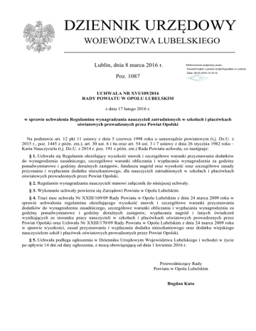 DZIENNIK URZĘDOWY WOJEWÓDZTWA LUBELSKIEGO Lublin, dnia 8 marca 2016 r. Elektronicznie podpisany przez: Paweł Chruściel; Lubelski Urząd Wojewódzki w Lublinie Data: 08.03.2016 14:14:10 Poz. 1087 UCHWAŁA NR XVI/109/2016 RADY POWIATU W OPOLU LUBELSKIM z dnia 17 lutego 2016 r. w sprawie uchwalenia Regulaminu wynagradzania nauczycieli zatrudnionych w szkołach i placówkach oświatowych prowadzonych przez Powiat Opolski Na podstawie art. 12 pkt 11 ustawy z dnia 5 czerwca 1998 roku o samorządzie powiatowym (t.j. Dz.U. z 2015 r., poz. 1445 z późn. zm.), art. 30 ust. 6 i 6a oraz art. 54 ust. 3 i 7 ustawy z dnia 26 stycznia 1982 roku – Karta Nauczyciela (t.j. Dz.U. z 2014 r. poz. 191 z późn. zm.) Rada Powiatu uchwala, co następuje: § 1. Uchwala się Regulamin określający wysokość stawek i szczegółowe warunki przyznawania dodatków do wynagrodzenia zasadniczego, szczegółowe warunki obliczania i wypłacania wynagrodzenia za godziny ponadwymiarowe i godziny doraźnych zastępstw, funduszu nagród oraz wysokość oraz szczegółowe zasady przyznania i wypłacania dodatku mieszkaniowego, dla nauczycieli zatrudnionych w szkołach i placówkach oświatowych prowadzonych przez Powiat Opolski. § 2. Regulamin wynagradzania nauczycieli stanowi załącznik do niniejszej uchwały. § 3. Wykonanie uchwały powierza się Zarządowi Powiatu w Opolu Lubelskim. § 4. Traci moc uchwała Nr XXIII/169/09 Rady Powiatu w Opolu Lubelskim z dnia 24 marca 2009 roku w sprawie uchwalenia regulaminu określającego wysokość stawek i szczegółowe warunki przyznawania dodatków do wynagrodzenia zasadniczego, szczegółowe warunki obliczania i wypłacania wynagrodzenia za godziny ponadwymiarowe i godziny doraźnych zastępstw, wypłacania nagród i innych świadczeń wynikających ze stosunku pracy nauczycieli w szkołach i placówkach oświatowych prowadzonych przez Powiat Opolski oraz Uchwała Nr XXIII/170/09 Rady Powiatu w Opolu Lubelskim z dnia 24 marca 2009 roku w sprawie wysokości, zasad przyznawania i wypłacania dodatku mieszkaniowego oraz dodatku wiejskiego nauczycielom szkół i placówek oświatowych prowadzonych przez Powiat Opolski. § 5. Uchwała podlega ogłoszeniu w Dzienniku Urzędowym Województwa Lubelskiego i wchodzi w życie po upływie 14 dni od daty ogłoszenia, z mocą obowiązującą od dnia 1 kwietnia 2016 r. Przewodniczący Rady Powiatu w Opolu Lubelskim Bogdan Kuta Dziennik Urzędowy Województwa Lubelskiego –2– Poz. 1087 _______________________________________________________________________________________________________________ Załącznik do uchwały Nr XVI/109/2016 Rady Powiatu w Opolu Lubelskim z dnia 17 lutego 2016 r. Regulamin wynagradzania nauczycieli zatrudnionych w szkołach i placówkach oświatowych prowadzonych przez Powiat Opolski Rozdział 1 Przepisy ogólne §1 1. Niniejszy regulamin stosuje się do nauczycieli zatrudnionych w szkołach i placówkach prowadzonych przez Powiat Opolski. 2. Regulamin określa dla nauczycieli poszczególnych stopni awansu zawodowego: 1) wysokość stawek oraz szczegółowe warunki przyznawania dodatków: a) za wysługę lat, b) motywacyjnego, c) funkcyjnego, d) za warunki pracy; 2) szczegółowe warunki obliczania i wypłacania wynagrodzenia za godziny ponadwymiarowe i godziny doraźnych zastępstw; 3) fundusz nagród 4) wysokość oraz szczegółowe zasady przyznawania i wypłacania dodatku mieszkaniowego. Rozdział 2 Dodatek za wysługę lat §2 Wysokość oraz warunki nabywania przez nauczycieli prawa do dodatku za wysługę lat określają przepisy art. 33 ustawy z dnia 26 stycznia 1982 roku – Karta Nauczyciela (t.j. Dz. U. z 2014 r. poz. 191 z późn. zm.) Rozdział 3 Dodatek funkcyjny §3 1. Do uzyskania dodatku funkcyjnego uprawnieni są nauczyciele, którym powierzono: a) stanowisko dyrektora lub wicedyrektora szkoły albo inne stanowisko kierownicze przewidziane w statucie szkoły, b) sprawowanie funkcji: -wychowawcy klasy -opiekuna stażu 2. Dodatek funkcyjny przysługuje także nauczycielom, którym powierzono obowiązki kierownicze w zastępstwie. §4 1. Przy ustalaniu dodatku funkcyjnego bierze się pod uwagę: a) organizację pracy, poprawność pod względem formalno – prawnym podejmowanych decyzji oraz ich zasadność i celowość, b) podnoszenie kwalifikacji związanych z prowadzeniem szkoły, c) jakość sprawowanego nadzoru pedagogicznego i kontroli wewnętrznej, d) prawidłowość realizacji budżetu szkoły i przestrzeganie dyscypliny finansowej, Dziennik Urzędowy Województwa Lubelskiego –3– Poz. 1087 _______________________________________________________________________________________________________________ e) działalność na rzecz poprawy bazy materialnej, rozwoju oraz osiągnięć szkoły, placówki, f) terminowość i rzetelność wykonywanych zadań, g) liczbę uczniów, h) ilość oddziałów i liczbę stanowisk kierowniczych w szkole lub placówce, i) liczbę pracowników pedagogicznych, administracji i obsługi, j) funkcjonowanie internatów, warsztatów szkolnych, kuchni i stołówek, k) ilość administrowanych budynków, obiektów sportowych, l) współpracę z radą pedagogiczną, radą szkoły, samorządem uczniowskim, związkami zawodowymi. 2. Wysokość dodatku funkcyjnego dyrektorowi szkoły przyznaje Zarząd Powiatu. 3. Wicedyrektorowi i osobom zajmującym stanowiska kierownicze w szkole dodatek przyznaje dyrektor szkoły. 4. Wysokość dodatków funkcyjnych ustala się wg tabeli zawartej w załączniku nr 1 na każdy rok szkolny. Ich wysokość ulega zmianie wraz ze zmianą kwot zawartych w załączniku nr 1. 5. Nauczycielom realizującym dodatkowe zadania przysługuje dodatek funkcyjny w wysokościach: a) za funkcję wychowawcy klasy - 120 zł miesięcznie, b) za funkcję opiekuna stażu -50 zł miesięcznie. Rozdział 4 Dodatek motywacyjny §5 Warunkiem przyznania dyrektorowi szkoły, nauczycielowi dodatku motywacyjnego jest: 1. uzyskiwanie osiągnięć dydaktycznych