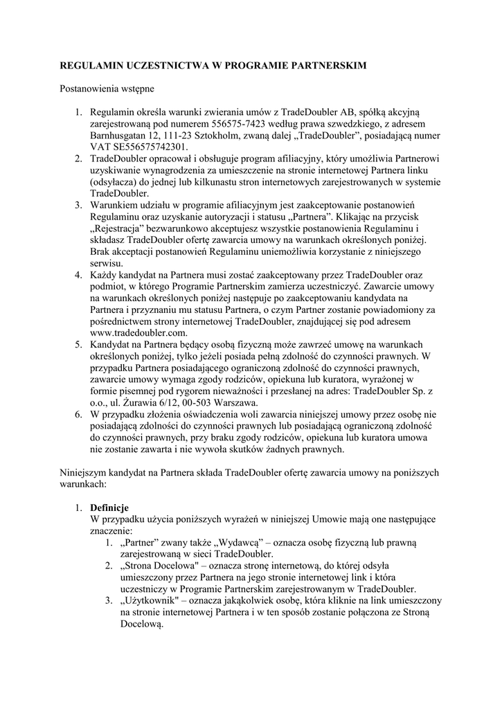 REGULAMIN UCZESTNICTWA W PROGRAMIE PARTNERSKIM Postanowienia wstępne 1. Regulamin określa warunki zwierania umów z TradeDoubler AB, spółką akcyjną zarejestrowaną pod numerem 556575-7423 według prawa szwedzkiego, z adresem Barnhusgatan 12, 111-23 Sztokholm, zwaną dalej „TradeDoubler”, posiadającą numer VAT SE556575742301. 2. TradeDoubler opracował i obsługuje program afiliacyjny, który umożliwia Partnerowi uzyskiwanie wynagrodzenia za umieszczenie na stronie internetowej Partnera linku (odsyłacza) do jednej lub kilkunastu stron internetowych zarejestrowanych w systemie TradeDoubler. 3. Warunkiem udziału w programie afiliacyjnym jest zaakceptowanie postanowień Regulaminu oraz uzyskanie autoryzacji i statusu „Partnera”. Klikając na przycisk „Rejestracja” bezwarunkowo akceptujesz wszystkie postanowienia Regulaminu i składasz TradeDoubler ofertę zawarcia umowy na warunkach określonych poniżej. Brak akceptacji postanowień Regulaminu uniemożliwia korzystanie z niniejszego serwisu. 4. Każdy kandydat na Partnera musi zostać zaakceptowany przez TradeDoubler oraz podmiot, w którego Programie Partnerskim zamierza uczestniczyć. Zawarcie umowy na warunkach określonych poniżej następuje po zaakceptowaniu kandydata na Partnera i przyznaniu mu statusu Partnera, o czym Partner zostanie powiadomiony za pośrednictwem strony internetowej TradeDoubler, znajdującej się pod adresem www.tradedoubler.com. 5. Kandydat na Partnera będący osobą fizyczną może zawrzeć umowę na warunkach określonych poniżej, tylko jeżeli posiada pełną zdolność do czynności prawnych. W przypadku Partnera posiadającego ograniczoną zdolność do czynności prawnych, zawarcie umowy wymaga zgody rodziców, opiekuna lub kuratora, wyrażonej w formie pisemnej pod rygorem nieważności i przesłanej na adres: TradeDoubler Sp. z o.o., ul. Żurawia 6/12, 00-503 Warszawa. 6. W przypadku złożenia oświadczenia woli zawarcia niniejszej umowy przez osobę nie posiadającą zdolności do czynności prawnych lub posiadającą ograniczoną zdolność do czynności prawnych, przy braku zgody rodziców, opiekuna lub kuratora umowa nie zostanie zawarta i nie wywoła skutków żadnych prawnych. Niniejszym kandydat na Partnera składa TradeDoubler ofertę zawarcia umowy na poniższych warunkach: 1. Definicje W przypadku użycia poniższych wyrażeń w niniejszej Umowie mają one następujące znaczenie: 1. „Partner” zwany także „Wydawcą” – oznacza osobę fizyczną lub prawną zarejestrowaną w sieci TradeDoubler. 2. „Strona Docelowa" – oznacza stronę internetową, do której odsyła umieszczony przez Partnera na jego stronie internetowej link i która uczestniczy w Programie Partnerskim zarejestrowanym w TradeDoubler. 3. „Użytkownik" – oznacza jakąkolwiek osobę, która kliknie na link umieszczony na stronie internetowej Partnera i w ten sposób zostanie połączona ze Stroną Docelową. 4. „Kliknięcie" – oznacza zaznaczenie i wybranie przez Użytkownika na stronie internetowej Partnera linku łączącego przeglądarkę internetową Użytkownika ze Stroną Docelową. 5. „Kontakt” – oznacza Użytkownika, który zostanie połączony przez Partnera ze Stroną Docelową i wykona określoną czynność na Stronie Docelowej, np.: zarejestruje się jako nowy użytkownik. 6. „Transakcja/sprzedaż” – oznacza Użytkownika, który zostanie połączony przez Partnera ze Stroną Docelową i zakupi produkt lub usługę dostępną na Stronie Docelowej. 7. "Ruch" – jest wyrażeniem zbiorczym obejmującym prawidłowe Kliknięcia, Kontakty i Transakcje/sprzedaż. 8. "Sztuczny Ruch" – jest wyrażeniem zbiorczym obejmującym nieprawidłowe Kliknięcia, Kontakty i Transakcje/sprzedaż, których przyczyną może być (na przykład, ale nie wyłącznie) automatyczne załadowanie się strony, oprogramowanie aktualizujące indeksy wyszukiwarek internetowych, roboty internetowe, prośby przesłane za pośrednictwem emaila lub serwisy dyskusyjne typu chatroom, generatory skryptów, umieszczenie odsyłaczy na stronach innych niż te, które Partner zgłosił oraz Kliknięcia nie wygenerowane przez przeglądarki internetowe, Kliknięcia, które nie zostały poprzedzone aktywacją linku przez Użytkownika chcącego połączyć się z daną stroną. 9. „Program Partnerski” – oznacza program, który jest własnością TradeDoubler i jest obsługiwany przez TradeDoubler dla firmy znajdującej się w spisie na stronie internetowej TradeDoubler, do którego Partner może zgłosić swoje uczestnictwo. 10. Wyrażenia rodzaju męskiego odnoszą się również do rodzaju żeńskiego i nijakiego, a wyrażenia użyte jedynie w liczbie pojedynczej odnoszą się również do liczby mnogiej i na odwrót. 2. Usługa 1. Partner, po uzyskaniu autoryzacji i statusu Partnera może umieszczać na swojej stronie internetowej linki do stron, które zostały zarejestrowane w TradeDoubler w ramach Programu Partnerskiego. 2. Partner może umieszczać w e-mailach linki do stron internetowych, które zostały zarejestrowane w TradeDoubler w ramach Programu Partnerskiego. 3. Każdy Program Partnerski może w dowolnym terminie zostać zmieniony lub zakończony. Informacje na temat Programów Partnerskich będą udostępniane na stronie internetowej TradeDoubler dostępnej pod adresem www.tradedoubler.com. Partner zobowiązany jest sprawdzać aktualne informacje na temat zmian w Programach Partnerskich a w szczególności w przypadku zakończenia Programu Partnerskiego lub zmiany warunków dotyczących wynagrodzeń dla Partnerów przez zarejestrowaną stronę. Partner zobowiązany jest przestrzegać wymagań Programu Partnerskiego, a w szczególności wszystkich postanowień dotyczących charakteru i zawartości strony internetowej Partnera a także korzystania ze znaków handlowych i logo osób trzecich lub innych Partnerów. 4. TradeDoubler zastrzega sobie prawo do modyfikacji, poprawy, zmiany lub r