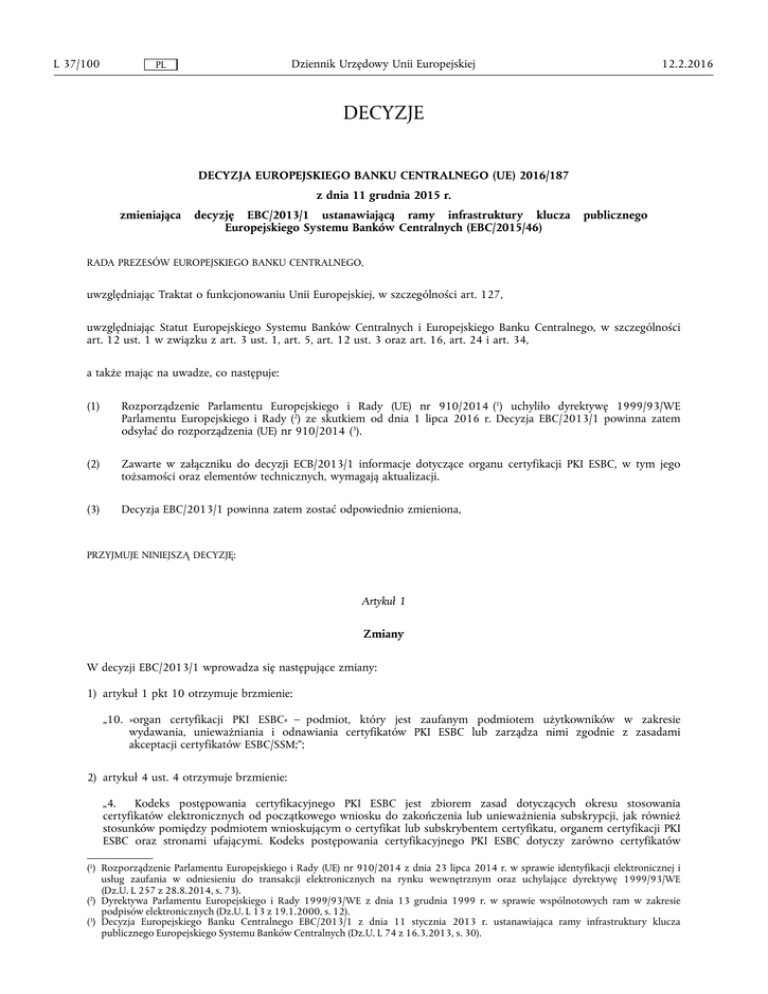 L 37/100 Dziennik Urzędowy Unii Europejskiej PL 12.2.2016 DECYZJE DECYZJA EUROPEJSKIEGO BANKU CENTRALNEGO (UE) 2016/187 z dnia 11 grudnia 2015 r. zmieniająca decyzję EBC/2013/1 ustanawiającą ramy infrastruktury klucza Europejskiego Systemu Banków Centralnych (EBC/2015/46) publicznego RADA PREZESÓW EUROPEJSKIEGO BANKU CENTRALNEGO, uwzględniając Traktat o funkcjonowaniu Unii Europejskiej, w szczególności art. 127, uwzględniając Statut Europejskiego Systemu Banków Centralnych i Europejskiego Banku Centralnego, w szczególności art. 12 ust. 1 w związku z art. 3 ust. 1, art. 5, art. 12 ust. 3 oraz art. 16, art. 24 i art. 34, a także mając na uwadze, co następuje: (1) Rozporządzenie Parlamentu Europejskiego i Rady (UE) nr 910/2014 (1) uchyliło dyrektywę 1999/93/WE Parlamentu Europejskiego i Rady (2) ze skutkiem od dnia 1 lipca 2016 r. Decyzja EBC/2013/1 powinna zatem odsyłać do rozporządzenia (UE) nr 910/2014 (3). (2) Zawarte w załączniku do decyzji ECB/2013/1 informacje dotyczące organu certyfikacji PKI ESBC, w tym jego tożsamości oraz elementów technicznych, wymagają aktualizacji. (3) Decyzja EBC/2013/1 powinna zatem zostać odpowiednio zmieniona, PRZYJMUJE NINIEJSZĄ DECYZJĘ: Artykuł 1 Zmiany W decyzji EBC/2013/1 wprowadza się następujące zmiany: 1) artykuł 1 pkt 10 otrzymuje brzmienie: „10. »organ certyfikacji PKI ESBC« – podmiot, który jest zaufanym podmiotem użytkowników w zakresie wydawania, unieważniania i odnawiania certyfikatów PKI ESBC lub zarządza nimi zgodnie z zasadami akceptacji certyfikatów ESBC/SSM;”; 2) artykuł 4 ust. 4 otrzymuje brzmienie: „4. Kodeks postępowania certyfikacyjnego PKI ESBC jest zbiorem zasad dotyczących okresu stosowania certyfikatów elektronicznych od początkowego wniosku do zakończenia lub unieważnienia subskrypcji, jak również stosunków pomiędzy podmiotem wnioskującym o certyfikat lub subskrybentem certyfikatu, organem certyfikacji PKI ESBC oraz stronami ufającymi. Kodeks postępowania certyfikacyjnego PKI ESBC dotyczy zarówno certyfikatów (1) Rozporządzenie Parlamentu Europejskiego i Rady (UE) nr 910/2014 z dnia 23 lipca 2014 r. w sprawie identyfikacji elektronicznej i usług zaufania w odniesieniu do transakcji elektronicznych na rynku wewnętrznym oraz uchylające dyrektywę 1999/93/WE (Dz.U. L 257 z 28.8.2014, s. 73). (2) Dyrektywa Parlamentu Europejskiego i Rady 1999/93/WE z dnia 13 grudnia 1999 r. w sprawie wspólnotowych ram w zakresie podpisów elektronicznych (Dz.U. L 13 z 19.1.2000, s. 12). (3) Decyzja Europejskiego Banku Centralnego EBC/2013/1 z dnia 11 stycznia 2013 r. ustanawiająca ramy infrastruktury klucza publicznego Europejskiego Systemu Banków Centralnych (Dz.U. L 74 z 16.3.2013, s. 30). 12.2.2016 PL Dziennik Urzędowy Unii Europejskiej L 37/101 objętych zakresem dyrektywy 1999/93/WE i rozporządzenia Parlamentu Europejskiego i Rady (UE) nr 910/2014 (*), jak i certyfikatów elektronicznych nieobjętych zakresem tych aktów. Kodeks postępowania certyfikacyjnego PKI ESBC określa również role i obowiązki wszystkich stron i ustanawia procedury dotyczące wydawania certyfikatów i zarządzania nimi. Kodeks postępowania certyfikacyjnego PKI ESBC stanowi załącznik do umowy pomiędzy poziomami 2 i 3. (*) Rozporządzenie Parlamentu Europejskiego i Rady (UE) nr 910/2014 z dnia 23 lipca 2014 r. w sprawie identy fikacji elektronicznej i usług zaufania w odniesieniu do transakcji elektronicznych na rynku wewnętrznym oraz uchylające dyrektywę 1999/93/WE (Dz.U. L 257 z 28.8.2014, s. 73).”; 3) w art. 10 ust. 1 zdanie wprowadzające oraz lit. a) otrzymują brzmienie: „1. Bank centralny Eurosystemu, o ile nie wykaże braku niedbalstwa, ponosi odpowiedzialność w ramach swoich funkcji i obowiązków w PKI ESBC za szkody poniesione przez użytkownika, który w uzasadniony sposób zaufał certyfikatowi kwalifikowanemu w rozumieniu dyrektywy 1999/93/WE i rozporządzenia (UE) nr 910/2014, w odniesieniu do: a) dokładności – w momencie wydania certyfikatu – wszelkich informacji zawartych w kwalifikowanym certyfikacie, oraz kwestii zawarcia w certyfikacie wszystkich szczegółów, jakie powinien zawierać certyfikat kwalifikowany zgodnie z dyrektywą 1999/93/WE i rozporządzeniem (UE) nr 910/2014;”; 4) załącznik otrzymuje brzmienie określone w załączniku do niniejszej decyzji. Artykuł 2 Wejście w życie Niniejsza decyzja wchodzi w życie trzeciego dnia po jej opublikowaniu w Dzienniku Urzędowym Unii Europejskiej. Sporządzono we Frankfurcie nad Menem dnia 11 grudnia 2015 r. Mario DRAGHI Prezes EBC L 37/102 PL Dziennik Urzędowy Unii Europejskiej 12.2.2016 ZAŁĄCZNIK „ZAŁĄCZNIK Informacje dotyczące organu certyfikacji PKI ESBC, w tym jego tożsamości, oraz jego elementów technicznych Organ certyfikacji PKI ESBC jest określony w swoim certyfikacie jako wydawca a jego prywatny klucz jest używany do podpisywania certyfikatów. Organ certyfikacji PKI ESBC jest właściwy w sprawach: (i) wydawania certyfikatów klucza publicznego i prywatnego; (ii) wydawania list unieważnionych certyfikatów; (iii) generowania par kluczy powiązanych z określonymi certyfikatami, np. tymi, które wymagają odtworzenia klucza; (iv) ponoszenia ogólnej odpowiedzialności za PKI ESBC i zapewnienia spełniania wszelkich wymogów niezbędnych do jego działania. Organ certyfikacji PKI ESBC obejmuje wszystkie osoby, polityki, procedury i systemy komputerowe, którym powierzono wydawanie certyfikatów elektronicznych i przypisywanie ich subskrybentom certyfikatów. Organ certyfikacji PKI ESBC obejmuje dwa elementy techniczne: — Główny organ certyfikacji PKI ESBC (Root ESCB-PKI certification authority): ten organ certyfikacji, funkcjo nujący na poziomie pierwszym, wydaje certyfikaty dla siebie oraz podlegających mu organów certyfikacji. Działa jedynie podczas wykonywania swoich wąsko zdefiniowanych zadań. Oto jego najważniejsze dane: a) Certyfikat SHA-1 (1): Distingui