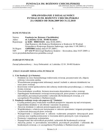 FUNDACJA IM. BOŻENNY CHECHLIŃSKIEJ ul. Lubelska 12/10, 30-003 Kraków [email protected] KRS: 0000332425, REGON: 120955884, NIP: 6772329714 www.przytulisko.harbutowice.pointblue.com.pl SPRAWOZDANIE Z DZIAŁALNOŚCI FUNDACJI IM. BOŻENNY CHECHLIŃSKIEJ ZA OKRES OD 30.06.2009 DO 31.12.2010 1. DANE FUNDACJI: Fundacja im. Bożenny Chechlińskiej ul. Lubelska 12/10, 30-003 Kraków nr KRS 0000332425, dnia 30.06.2009 r. (Sąd Rejonowy dla Krakowa-Śródmieścia w Krakowie XI Wydział Gospodarczy Krajowego Rejestru Sądowego, wpis dnia 11.08.2009 r.) Nr Regon: 120955884 nadany dnia 07.07.2009 r. NIP: 677 232 97 14 (Urząd Skarbowy Kraków – Krowodrza, dnia 18.07.2009 r.) www.przytuliskoharbutowice.pointblue.com.pl Nazwa: Adres: Rejestracja: ZARZĄD FUNDACJI: Zarząd jednoosobowy : Jerzy Dobrzański ul. Lubelska 12/10 30-003 Kraków CELE I ZASADY DZIAŁANIA FUNDACJI 1. Cele fundacji ( § 6 Statutu): - Działanie na rzecz humanitarnego traktowania zwierząt, poszanowanie ich, objęcia ochroną i otoczenia opieką. - Wszechstronne propagowanie informacji, metod i technik w zakresie działalności na rzecz praw zwierząt. - Krzewienie wśród społeczeństwa idei ochrony środowiska przyrodniczego, a zwłaszcza świata zwierząt. - Przeciwdziałanie wszelkim formom stosowania okrucieństwa wobec zwierząt. - Zapobieganie bezdomności zwierząt towarzyszących, przez pomoc w prowadzeniu niewielkich, prywatnych przytulisk i schronisk dla bezdomnych zwierząt, a w szczególności Przytuliska w Harbutowicach. 2. Fundacja realizuje swoje cele poprzez (§ 7 Statutu): - Czynną postawę przy zwalczaniu wszelkich przejawów znęcania się nad zwierzętami, bezpośrednie działanie w ich obronie i niesienie im pomocy. - Aktywne działanie w zakresie przestrzegania praw zwierząt. - Współdziałanie z właściwymi instytucjami w zakresie ujawniania i ścigania przestępstw i wykroczeń dotyczących praw zwierząt. - Występowanie z inicjatywami w zakresie wydawania przepisów dotyczących praw zwierząt oraz współuczestniczenie w tworzeniu aktów prawnych z tym związanych. - Promocję i organizację wolontariatu. - Propagowanie idei niewielkich przytulisk i schronisk dla bezdomnych zwierząt. - Aktywną pomoc w prowadzeniu niewielkich, prywatnych przytulisk i schronisk dla bezdomnych zwierząt, a w szczególności Przytuliska w Harbutowicach, przez: Strona 1 z 4 FUNDACJA IM. BOŻENNY CHECHLIŃSKIEJ ul. Lubelska 12/10, 30-003 Kraków [email protected] KRS: 0000332425, REGON: 120955884, NIP: 6772329714 www.przytulisko.harbutowice.pointblue.com.pl a) zakup karmy i leków dla zwierząt, oraz wszelkich innych środków niezbędnych do prowadzenia Przytuliska, b) transport karmy i zwierząt z Przytuliska, c) diagnostykę, leczenie i rehabilitację zwierząt z Przytuliska. - Prowadzenie działań zmierzających do regulacji populacji bezdomnych zwierząt poprzez: A. propagowanie antykoncepcji, sterylizacji i identyfikacji zwierząt towarzyszących, B. przeciwdziałanie w nie koncesjonowanym rozmnażaniu zwierząt towarzyszących (nie gospodarczych) - Współdziałanie z instytucjami oświatowo – wychowawczymi w zakresie wychowania dzieci i młodzieży w duchu humanitarnego stosunku do zwierząt - Współpracę z innymi organizacjami i instytucjami zajmującymi się ochroną zwierząt, w tym zagranicznymi. 2. DZIAŁALNOŚĆ STATUTOWA: Sprawozdanie obejmuje okres od powstania Fundacji tj. lipca 2009 r., do 31 grudnia 2010 r. A. Realizując cele statutowe Fundacja zorganizowała szereg imprez plenerowych, w trakcie których prowadzono zbiórki darów na potrzeby przytulisk opiekujących się bezdomnymi zwierzętami.: 1. W dniu 4.10.2009 r. zorganizowano, współpracując TVP w Krakowie, na Bulwarze Czerwieńskim w Krakowie zbiórkę darów w naturze i pieniężnych dla Przytuliska w Harbutowicach 2. W dniu 18.10.2009 r. zorganizowano, współpracując z Urzędem Miasta i Gminy w Niepołomicach imprezę plenerową „Koty, Psy, Konie i My”, w trakcie której prowadzono zbiórkę darów pieniężnych dla Przytuliska w Podłężu. 3. W dniach 10-31.12.2009 r. zorganizowano na terenie Miasta Krakowa zbiórkę darów dla Przytuliska w Harbutowicach i Podłężu. 4. W roku 2010 zorganizowano, współpracując z TVP Kraków i RP Kraków, sześć imprez na Bulwarze Czerwieńskim w Krakowie (w dniach: 24 kwietnia, 16 maja, 13 czerwca, 12 września, 10 i 24 października), w trakcie których zbierano dary pieniężne i w naturze dla Przytulisk w Harbutowicach, Podłężu i Zabierzowie Bocheńskim. Zebrane dary w naturze przekazano w/w przytuliskom. Z zebranych środków pieniężnych sfinansowano zakup karmy i leczenie oraz sterylizację zwierząt. B. W trakcie wymienionych imprez prowadzono prezentację psów pochodzących z wymienionych Przytulisk, w celu znalezienia dla nich indywidualnych opiekunów (adopcje). W efekcie tych działań 15 psów znalazło nowych właścicieli. C. Finansowano leczenie okaleczonych bezdomnych zwierząt pozostających pod opieką wolontariuszy współpracujących z Fundacją. D. W ramach opieki na Przytuliskami finansowano sterylizację suk i kotek oraz kastrację psów i kotów, aby zapobiec niepotrzebnemu i niepożądanemu mnożeniu się zwierząt. E. Współpracując z Szkołami i Przedszkolami prowadzono akcję uświadamiania młodzieży i uczulania jej na los zwierząt, a w szczególności wszelkim przejawom ich dręczenia. Strona 2 z 4 FUNDACJA IM. BOŻENNY CHECHLIŃSKIEJ ul. Lubelska 12/10, 30-003 Kraków [email protected] KRS: 0000332425, REGON: 120955884, NIP: 6772329714 www.przytulisko.harbutowice.pointblue.com.pl 3. DZIAŁALNPŚĆ GOSPODARCZA: Fundacja nie prowadzi działalności gospodarczej. 4. UCHWAŁY i PROTOKOŁY: 1. Kraków, dnia 20.04.2009 r., Uchwała nr 1 Fundatorów Fundacji w sprawie wyboru Zarządu 2. Kraków, dnia 20.04.2009 r., Uchwała nr 2 Fundatorów Fundacji w sprawie wyboru członków Rady Fundacji 3. Kraków, dnia 20.07.2009 r., Uchwała nr 1/07/09 Zarzą