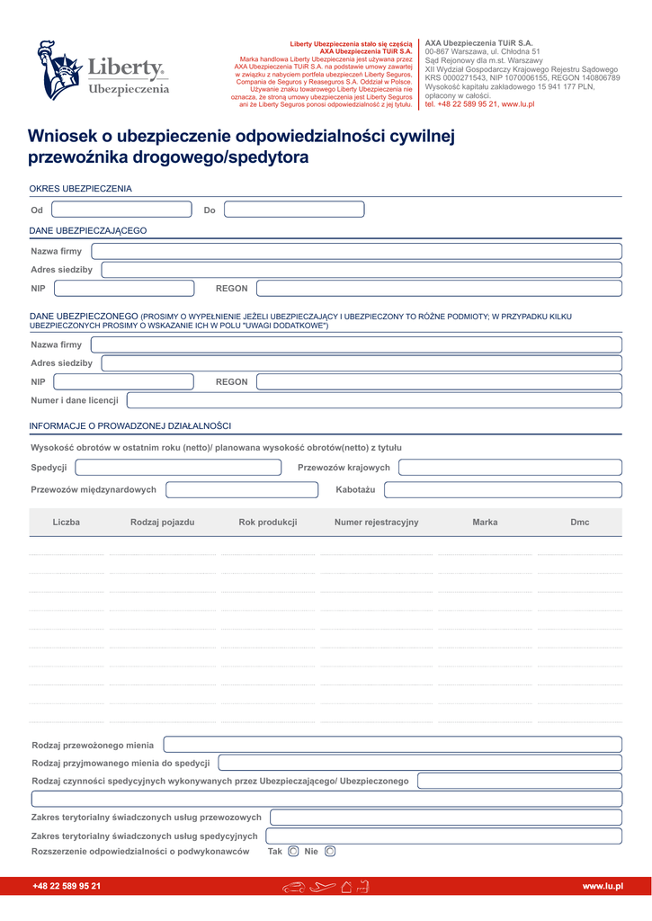 Liberty Ubezpieczenia stało się częścią AXA Ubezpieczenia TUiR S.A. Marka handlowa Liberty Ubezpieczenia jest używana przez AXA Ubezpieczenia TUiR S.A. na podstawie umowy zawartej w związku z nabyciem portfela ubezpieczeń Liberty Seguros, Compania de Seguros y Reaseguros S.A. Oddział w Polsce. Używanie znaku towarowego Liberty Ubezpieczenia nie oznacza, że stroną umowy ubezpieczenia jest Liberty Seguros ani że Liberty Seguros ponosi odpowiedzialność z jej tytułu. AXA Ubezpieczenia TUiR S.A. 00-867 Warszawa, ul. Chłodna 51 Sąd Rejonowy dla m.st. Warszawy XII Wydział Gospodarczy Krajowego Rejestru Sądowego KRS 0000271543, NIP 1070006155, REGON 140806789 Wysokość kapitału zakładowego 15 941 177 PLN, opłacony w całości. tel. +48 22 589 95 21, www.lu.pl Wniosek o ubezpieczenie odpowiedzialności cywilnej przewoźnika drogowego/spedytora OKRES UBEZPIECZENIA Od Do DANE UBEZPIECZAJĄCEGO Nazwa firmy Adres siedziby NIP REGON DANE UBEZPIECZONEGO (PROSIMY O WYPEŁNIENIE JEŻELI UBEZPIECZAJĄCY I UBEZPIECZONY TO RÓŻNE PODMIOTY; W PRZYPADKU KILKU UBEZPIECZONYCH PROSIMY O WSKAZANIE ICH W POLU "UWAGI DODATKOWE") Nazwa firmy Adres siedziby NIP REGON Numer i dane licencji INFORMACJE O PROWADZONEJ DZIAŁALNOŚCI Wysokość obrotów w ostatnim roku (netto)/ planowana wysokość obrotów(netto) z tytułu Spedycji Przewozów krajowych Przewozów międzynardowych Liczba Rodzaj pojazdu Kabotażu Rok produkcji Numer rejestracyjny Marka Dmc Rodzaj przewożonego mienia Rodzaj przyjmowanego mienia do spedycji Rodzaj czynności spedycyjnych wykonywanych przez Ubezpieczającego/ Ubezpieczonego Zakres terytorialny świadczonych usług przewozowych Zakres terytorialny świadczonych usług spedycyjnych Rozszerzenie odpowiedzialności o podwykonawców +48 22 589 95 21 Tak Nie www.lu.pl WNIOSKOWANA SUMA GWARANCYJNA Z TYTUŁU Odpowiedzialności cywilnej przewoźnika w ruchu krajowym Odpowiedzialności cywilnej przewoźnika w ruchu międzynarodowym Odpowiedzialności cywilnej spedytora KLAUZULE DODATKOWE Klauzula Franszyza Limit odpowiedzialności Klauzula reprezentantów Klauzula prowadzenia środka transportu po spożyciu alkoholu lub po użyciu narkotyków Klauzula zadeklarowania w liście przewozowym dodatkowej wartości towaru Klauzula zadeklarowania w liście przewozowym kwoty specjalnego interesu w dostawie towaru Klauzula przewozu samochodów nowych lub używanych Klauzula przewozu ładunków ponadgabarytowych i ciężkich Klauzula przewozów towaru w kontrolowanej temperaturze Klauzula utraty lub uszkodzenia kontenera, palet, platform, opakowań lub pojemników Klauzula przewozu żywych zwierząt Klauzula przewozu przesyłek kurierskich Klauzula szkód w przesyłce na skutek zamoczenia, zawilgocenia lub zabrudzenia będącego wynikiem niewystarczającego umycia cysterny lub jej przewodów Klauzula ubytku ilościowego powstającego na skutek wycieku z nieszczelnej cysterny Kabotaż na terenie UE Kabotaż na terenie Niemiec Klauzula odpowiedzialności cywilnej przewoźnika umownego DOTYCHCZASOWY PRZEBIEG UBEZPIECZENIA Poprzedni Ubezpieczyciel Liczba szkód w okresie ostatnich 5 lat Informacje dodatkowe o szkodach (rok wystąpienia, przyczyna, wartość odszkodowania, wysokość założonych rezerw) LICZBA RAT Liczba rat Uwagi dodatkowe (miejsce na uwagi, opisy, wnioskowane rozszerzenia zakresu) OŚWIADCZENIA I PODPISY (OŚWIADCZENIE 2 ORAZ 3 DOTYCZY WYŁĄCZNIE OSÓB FIZYCZNYCH) 1. Oświadczam, że dane zawarte w niniejszym wniosku są prawdziwe, zgodne z moją wiedzą. Przed sporządzeniem wniosku otrzymałem/am: 1) Ogólne Warunki Ubezpieczenia odpowiedzialności cywilnej przewoźnika drogowego w ruchu krajowym Liberty zatwierdzone uchwałą AXA Ubezpieczenia TUiR S.A. z dnia 30 sierpnia 2016 r. 2) Ogólne Warunki Ubezpieczenia odpowiedzialności cywilnej przewoźnika drogowego w ruchu międzynarodowym Liberty zatwierdzone uchwałą AXA Ubezpieczenia TUiR S.A. z dnia 30 sierpnia 2016 r. 3) Ogólne Warunki Ubezpieczenia odpowiedzialności cywilnej spedytora Liberty, zatwierdzone uchwałą AXA Ubezpieczenia TUiR S.A. z dnia 30 sierpnia 2016 r. 2. Oświadczam, że zostałem poinformowany/a, iż administratorem danych osobowych jest AXA Ubezpieczenia Towarzystwo Ubezpieczeń i Reasekuracji S.A., ul. Chłodna 51, 00-867 Warszawa. Dane osobowe będą przetwarzane w celu podjęcia działań przed zawarciem umowy ubezpieczenia, wykonania umowy ubezpieczenia oraz wypełnienia prawnie usprawiedliwionych celów administratora danych (w szczególności przekazywania informacji o oferowanych produktach i usługach). Podanie danych jest dobrowolne. Osobie, której dane dotyczą przysługuje prawo dostępu do treści swoich danych oraz ich poprawienia. +48 22 589 95 21 3. Wyrażam zgodę na posłużenie się przez AXA Ubezpieczenia TUiR S.A. telefonem, automatycznym systemem wywołującym, a także pocztą elektroniczną lub innym środkiem komunikacji elektronicznej do celów marketingu produktów i usług własnych oraz podmiotów z Grupy AXA tj. AXA Ubezpieczenia Towarzystwo Ubezpieczeń i Reasekuracji S.A., Avanssur S.A. Oddział w Polsce, AXA Powszechne Towarzystwo Emerytalne S.A., AXA Życie Towarzystwo Ubezpieczeń S.A., AXA Towarzystwo Ubezpieczeń i Reasekuracji S.A., AXA Towarzystwo Funduszy Inwestycyjnych S.A., AXA Polska S.A., ul. Chłodna 51, 00-867 Warszawa. Data i miejsce wypełnienia wniosku Tak Nie Podpis Ubezpieczającego www.lu.pl