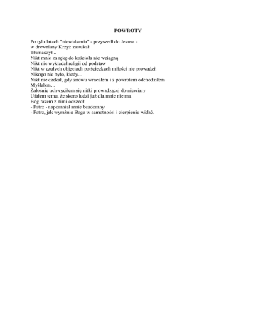POWROTY Po tylu latach "niewidzenia" - przyszedł do Jezusa w drewniany Krzyż zastukał Tłumaczył... Nikt mnie za rękę do kościoła nie wciągną Nikt nie wykładał religii od podstaw Nikt w czułych objęciach po ścieżkach miłości nie prowadził Nikogo nie było, kiedy... Nikt nie czekał, gdy znowu wracałem i z powrotem odchodziłem Myślałem... Żałośnie uchwyciłem się nitki prowadzącej do niewiary Ufałem temu, że skoro ludzi już dla mnie nie ma Bóg razem z nimi odszedł - Patrz - napomniał mnie bezdomny - Patrz, jak wyraźnie Boga w samotności i cierpieniu widać.