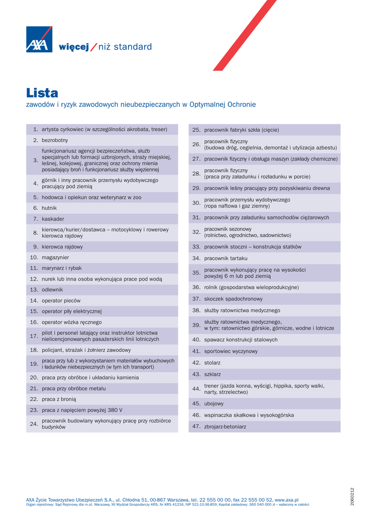 Lista zawodów i ryzyk zawodowych nieubezpieczanych w Optymalnej Ochronie 2. bezrobotny 3. 4. funkcjonariusz agencji bezpieczeństwa, służb specjalnych lub formacji uzbrojonych, straży miejskiej, leśnej, kolejowej, granicznej oraz ochrony mienia posiadający broń i funkcjonariusz służby więziennej górnik i inny pracownik przemysłu wydobywczego pracujący pod ziemią 25. pracownik fabryki szkła (cięcie) 26. 27. pracownik fizyczny i obsługa maszyn (zakłady chemiczne) 28. 7. kaskader 8. kierowca/kurier/dostawca – motocyklowy i rowerowy kierowca rajdowy 9. kierowca rajdowy 10. magazynier 11. marynarz i rybak pracownik fizyczny (praca przy załadunku i rozładunku w porcie) 29. pracownik leśny pracujący przy pozyskiwaniu drewna 5. hodowca i opiekun oraz weterynarz w zoo 6. hutnik pracownik fizyczny (budowa dróg, cegielnia, demontaż i utylizacja azbestu) 30. pracownik przemysłu wydobywczego (ropa naftowa i gaz ziemny) 31. pracownik przy załadunku samochodów ciężarowych 32. pracownik sezonowy (rolnictwo, ogrodnictwo, sadownictwo) 33. pracownik stoczni – konstrukcja statków 34. pracownik tartaku 35. 12. nurek lub inna osoba wykonująca prace pod wodą pracownik wykonujący pracę na wysokości powyżej 6 m lub pod ziemią 13. odlewnik 36. rolnik (gospodarstwa wieloprodukcyjne) 14. operator pieców 37. skoczek spadochronowy 15. operator piły elektrycznej 38. służby ratownictwa medycznego 16. operator wózka ręcznego 17. pilot i personel latający oraz instruktor lotnictwa nielicencjonowanych pasażerskich linii lotniczych 18. policjant, strażak i żołnierz zawodowy 19. praca przy lub z wykorzystaniem materiałów wybuchowych i ładunków niebezpiecznych (w tym ich transport) 20. praca przy obróbce i układaniu kamienia 21. praca przy obróbce metalu 22. praca z bronią 23. praca z napięciem powyżej 380 V 24. pracownik budowlany wykonujący pracę przy rozbiórce budynków 39. służby ratownictwa medycznego, w tym: ratownictwo górskie, górnicze, wodne i lotnicze 40. spawacz konstrukcji stalowych 41. sportowiec wyczynowy 42. stolarz 43. szklarz 44. trener (jazda konna, wyścigi, hippika, sporty walki, narty, strzelectwo) 45. ubojowy 46. wspinaczka skałkowa i wysokogórska 47. zbrojarz-betoniarz AXA Życie Towarzystwo Ubezpieczeń S.A., ul. Chłodna 51, 00-867 Warszawa, tel. 22 555 00 00, fax 22 555 00 52, www.axa.pl Organ rejestrowy: Sąd Rejonowy dla m.st. Warszawy, XII Wydział Gospodarczy KRS, Nr KRS 41216, NIP 521-10-36-859, Kapitał zakładowy: 360 540 000 zł – wpłacony w całości 2060212 1. artysta cyrkowiec (w szczególności akrobata, treser)