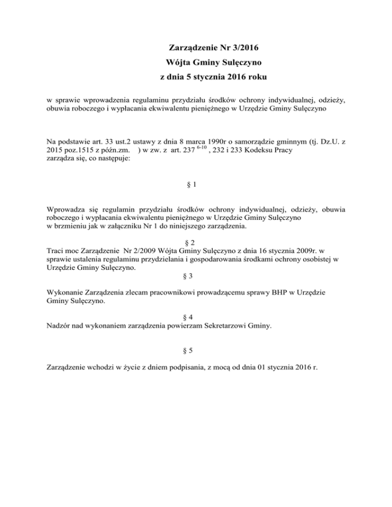 Zarządzenie Nr 3/2016 Wójta Gminy Sulęczyno z dnia 5 stycznia 2016 roku w sprawie wprowadzenia regulaminu przydziału środków ochrony indywidualnej, odzieży, obuwia roboczego i wypłacania ekwiwalentu pieniężnego w Urzędzie Gminy Sulęczyno Na podstawie art. 33 ust.2 ustawy z dnia 8 marca 1990r o samorządzie gminnym (tj. Dz.U. z 2015 poz.1515 z późn.zm. ) w zw. z art. 237 6-10 , 232 i 233 Kodeksu Pracy zarządza się, co następuje: §1 Wprowadza się regulamin przydziału środków ochrony indywidualnej, odzieży, obuwia roboczego i wypłacania ekwiwalentu pieniężnego w Urzędzie Gminy Sulęczyno w brzmieniu jak w załączniku Nr 1 do niniejszego zarządzenia. §2 Traci moc Zarządzenie Nr 2/2009 Wójta Gminy Sulęczyno z dnia 16 stycznia 2009r. w sprawie ustalenia regulaminu przydzielania i gospodarowania środkami ochrony osobistej w Urzędzie Gminy Sulęczyno. §3 Wykonanie Zarządzenia zlecam pracownikowi prowadzącemu sprawy BHP w Urzędzie Gminy Sulęczyno. §4 Nadzór nad wykonaniem zarządzenia powierzam Sekretarzowi Gminy. §5 Zarządzenie wchodzi w życie z dniem podpisania, z mocą od dnia 01 stycznia 2016 r. Załącznik Nr 1 do Zarządzenie Nr 3/2016 Wójta Gminy Sulęczyno z dnia 5 stycznia 2016 roku REGULAMIN przydziału środków ochrony indywidualnej, odzieży, obuwia roboczego i wypłacania ekwiwalentu pieniężnego w Urzędzie Gminy Sulęczyno §1 1.Ustala się tabelę norm przydziału zawierającą wykaz stanowisk, na których stosuje się środki ochrony indywidualnej, odzież i obuwie robocze oraz przewidywane okresy ich używalności: l.p Stanowiska: Rodzaj środków ochrony osobistej , odzież i obuwie robocze Okres używalności R-robocze 0-ochrony indywidualnej 1 Czapka drelichowa lub beret 24 miesiące R Ubranie drelichowe 12 miesięcy R Trzewiki przemysłowe lub buty skórzano gumowe 18 miesięcy 0 Koszula flanelowa 1 sezon grzewczy 0 Rękawice ochronne Do zużycia 0 Ubranie ocieplane 36 miesięcy 0 Buty filcowo-gumowe 36 miesięcy 0 Buty gumowe 24 miesiące 0 Chustka na głowę (lub czapka, beret ) 12 miesięcy R Fartuch roboczy 12 miesiące R Trzewiki profilaktyczne, tekstylne 12 miesięcy 0 Rękawice gumowe do zużycia 0 Ubranie drelichowe 12 miesięcy R Czapka drelichowa lub beret, chustka 24 miesiące R Buty robocze 24 miesiące 0 Buty filcowo-gumowe 24 miesiące 0 2 3 Palacz, Konserwator Sprzątaczka Pracownik fizyczny w tym zatrudnieni w ramach prac społecznie użytecznych oraz skazani przez sądy, 4 Pracownicy zatrudnieni na stanowiskach wyposażonych w monitory ekranowe Koszula flanelowa 12 miesięcy 0 Rękawice gumowe do zużycia 0 1.O-okulary korygujące wzrok. Nie częściej niż co 2 lata. 0 2. Przydział odzieży i obuwia roboczego przysługuje pracownikom za pełne miesiące trwania stosunku pracy. Przydział przysługuje także pracownikom zatrudnionym w niepełnym wymiarze czasu pracy, z tym że normy przydziału zmniejsza się odpowiednio do wymiaru zatrudnienia. 3. Przydział nie przysługuje za pełne miesiące nieobecności w pracy z tytułu: urlopu wychowawczego, rodzicielskiego, bezpłatnego, zwolnień lekarskich, zasiłku macierzyńskiego. 4. W przypadku użytkowania przez pracownika (w tym wykonującym prace społecznie użyteczne i skazanym przez sądy) własnej odzieży i obuwia roboczego, za zgodą pracodawcy przysługuje ekwiwalent w wysokości obliczonej na podstawie tabeli norm przydziału, okresu zatrudnienia i aktualnych cen. 5. Ekwiwalent pieniężny wypłacany jest z dołu za pełne miesiące 1 raz w roku ( w IV kw.) 6. Za pranie i naprawę odzieży roboczej pracownikowi przysługuje ekwiwalent pieniężny (pokrywający koszty własne : woda, ścieki, prąd, nici) w wys.10,00 zł miesięcznie. 7. Środki ochrony indywidualnej oraz odzież robocza są własnością Urzędu Gminy. 8. Obowiązkiem pracownika jest utrzymanie w należytym stanie przydzielonej mu odzieży i obuwia roboczego. §2 1.Ustala się normy przydziału środków higieny osobistej oraz napojów: l.p. Stanowiska Środki higieny osobistej ilość okres 1 Pracownicy zatrudnieni na stanowiskach nierobotniczych Ręcznik 1 szt 12 miesięcy 100 gram 1 miesiąc Mydło toaletowe Woda, napoje - gdy temperatura w pomieszczeniu pracy przekracza 28°C 2 Pracownicy zatrudnieni na stanowiskach robotniczych Ręcznik frotte Mydło toaletowe 2 szt 200 gram 12 miesięcy 1 miesiąc Proszek do prania 2 kg 12 miesięcy Pasta do rąk 2 kg 12 miesięcy Woda, napoje - Gdy temperatura powietrza na stanowisku pracy na otwartej przestrzeni przekracza 25°C miesięcznie 2.Określony w tabeli przydział przysługuje za pełne miesiące trwania stosunku pracy. 3.Przydział środków przysługuje także pracownikom zatrudnionym w niepełnym wymiarze czasu pracy, z tym że normy przydziału zmniejsza się odpowiednio do wymiaru zatrudnienia. 4.Przydział nie przysługuje za pełne miesiące nieobecności w pracy z tytułu: urlopu wychowawczego, rodzicielskiego, bezpłatnego, zwolnień lekarskich, zasiłku macierzyńskiego. 5.Przydział dokonywany jest 2 razy w roku (na przełomie V/VI i XI/XII ). 6.Pracownikom administracji nie przysługuje ekwiwalent za napoje. §3 1.Pracownikom użytkującym w czasie pracy monitor ekranowy co najmniej przez połowę dobowego wymiaru czasu pracy przysługują – okulary korygujące wzrok. 2.Potrzebę stosowania przez pracownika okularów korygujących wzrok określa lekarz medycyny pracy na podstawie badań okulistycznych, przeprowadzonych w ramach profilaktycznej opieki zdrowotnej- badan lekarskich. 3.Zakup okularów korygujących wzrok odbywać się będzie przez pracownika w dowolnym zakładzie optycznym. 4.Ustala się zwrot kosztów związanych z zakupem okularów korygujących wzrok w wysokości poniesionych kosztów (szkła, robocizna i refundowana oprawka), nie wyższych niż 300,00zł. W przypadku zakupu oprawek okularów droższych, różnicę w cenie pokrywa pracownik. 5.Ustala się możliwość refundacji kosztów zakupu okularó