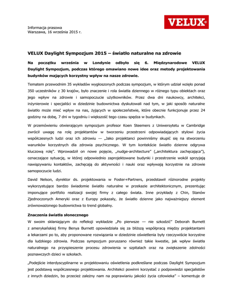 VELUX Daylight Sympozjum 2015 – światło naturalne na zdrowie