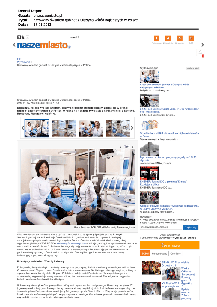 Dental Depot Gazeta: elk.naszemiasto.pl Tytu³: Kreowany wiat³em gabinet z Olsztyna wród najlepszych w Polsce Data: 15.01.2013 nowość Rejestracja Wydarzenia Rozrywka Katalog firm Ogłoszenia Sport Euro 2012 Dom Mieszkańcy Zaloguj się Newsletter RSS Miasta Kobiet 10 Ełk > Wydarzenia > Kreowany światłem gabinet z Olsztyna wśród najlepszych w Polsce Wydarzenia dnia dodaj artykuł Kreowany światłem gabinet z Olsztyna wśród najlepszych w Polsce Dzięki tzw. kreacji wnętrza... Kreowany światłem gabinet z Olsztyna wśród najlepszych w Polsce 2013-01-15, Aktualizacja: dzisiaj 11:53 Dzięki tzw. kreacji wnętrza światłem, olsztyński gabinet stomatologiczny znalazł się w gronie najlepiej zaprojektowanych w Polsce. O miano najlepszego rywalizuje z klinikami m.in. z Katowic, Rzeszowa, Warszawy i Gdańska. 2,5 tysiąca uczniów wzięło udział w akcji "Bezpieczny Lód - Bezpieczne... 2,5 tysiąca uczniów z powiatu... Wysokie kary UOKiK dla trzech największych banków w Polsce Wprowadzająca w błąd kampania... 1/6 Będzie mroźno. Zobacz prognozę pogody na 15 i 16 stycznia Jak informuje IMGW, Europa... ENEMEF: TarantiNOC z premierą "Django". Rozdajemy bilety ENEMEF: TarantinoNOC to... Golden Retrievery pomagały kwestować podczas finału WOŚP w Olsztynie [ZDJĘCIA] Właściciele psów rasy golden... Newsletter Chcesz dostawać najważniejsze informacje z Twojego miasta? Zapisz się do Newsletter! Biuro Prasowe TOP DESIGN Gabinety Stomatologiczne Wizyta u dentysty w Olsztynie może być bezstresowa! A to za sprawą Specjalistycznej Praktyki Stomatologicznej Izabeli i Andrzeja Sokołowskich. Ich gabinet trafił właśnie do grona 11 najlepiej zaprojektowanych placówek stomatologicznych w Polsce. Co roku spośród setek klinik z całego kraju organizator plebiscytu TOP DESIGN Gabinety Stomatologiczne nominuje garstkę, która podejmuje działania na rzecz walki z dentofobią wśród Polaków. Na nagrodę mają szansę te ośrodki stomatologiczne, które dzięki nowoczesnej architekturze i wzornictwu zerwały ze stereotypowym i odstraszającym obrazem wnętrza gabinetu dentystycznego. Sokołowskim to się udało. Stworzyli oni gabinet wypełniony nowoczesną technologią, a przy niebudzący grozy. U dentysty podziwiasz Warmię i Mazury Polacy wciąż boją się wizyt u dentysty. Najczęstszą przyczyną, dla której unikamy leczenia jest widmo bólu. Odstrasza on aż 59 proc. z nas. Strach budzą także same wnętrza. Szpitalnego i zimnego wnętrza, w którym słychać borowanie boi się blisko 10 proc. Polaków - podaje portal Dentysta.eu. Nic więc dziwnego, że stomatolodzy wypowiadają wojnę zarówno bólowi, jak i własnemu wizerunkowi. Tak też jest w przypadku Izabeli i Andrzeja Sokołowskich z Olsztyna. Sokołowscy stworzyli w Olsztynie gabinet, który jest zaprzeczeniem tradycyjnego, klinicznego wnętrza. W jego wnętrzu dominują uspokajające barwy, zamiast zimnej, szpitalnej bieli. Jest także akcent regionalny, na ścianach gabinetów i poczekalni znajdujemy fotogramy przyrody Warmii i Mazur. Zdjęcia łąki pełnej maków, lasu i zachodu słońca mają odciągać uwagę pacjenta od zabiegu. Wszystko w gabinecie zostało tak dobrane, aby budzić pozytywne, mało stomatologiczne skojarzenia. [email protected] Zapisz się Dodaj swój artykuł! Spotkało cię coś ciekawego? Wyślij tekst i zdjęcie! Dodaj artykuł TOP 5 Komentowane Ocenione SIEMA. XXI Finał Wielkiej Orkiestry... 1 Wielka Orkiestra Świątecznej Pomocy grała... 2 XXI Finał WOŚP. Migawki z innych regionów... 3 Będzie mroźno. Zobacz prognozę Dental Depot Gazeta: elk.naszemiasto.pl Tytu³: Kreowany wiat³em gabinet z Olsztyna wród najlepszych w Polsce Data: 15.01.2013 Zobacz: 2,5 tysiąca uczniów wzięło udział w akcji "Bezpieczny Lód - Bezpieczne Ferie" [ZDJĘCIA] - W poczekalni zamiast zwykłych krzeseł ustawiliśmy ławkę, taką samą jak stawia się w parku. Są też stoliki znane z kawiarni i sporo egzotycznej roślinności. Na ścianach nie ma szablonów zęba i reklam past do zębów, są za to przyciągające uwagę relaksujące grafiki, widoki Warmii i Mazur. W gabinecie cały czas gra muzyka, która dodatkowo rozprasza uwagę. Muzyki można posłuchać także podczas zabiegu. Zawsze to lepsza Zobacz koniecznie alternatywa dla dźwięku borującego wiertła - śmieje się lek. stom. Izabela Rybak-Sokołowska, współwłaścicielka gabinetu. Światło mówi ci, na co patrzeć, a na co nie To co jednak wyróżnia klinikę na tle pozostałych, nominowanych w tym roku do nagrody TOP DESIGN Gabinety Stomatologiczne to przestrzeń jaką architekci zbudowali kreacją światła. W gabinecie użyto kilkanaście różnych form oświetleniowych. Zastosowanie kierunkowych źródeł światła dało możliwość bardzo selektywnego wyłaniania elementów niczym w profesjonalnej galerii. Dzięki czemu zaciemniono w gabinecie elementy budzące niepokój pacjenta. Cała uwaga skupia się natomiast na kwiatach i detalach. Powód? Dobre oświetlenie działa relaksująco nawet na 10 proc. pacjentów - wynika z badań Dentysta.eu. Bardziej kojąco działa na nas tylko dobra muzyka (38 proc.) i wygodne fotele (30 proc.). Nieco inaczej architekci zabawili się światłem w gabinetach. W nich dominuje naturalne oświetlenie, które do wnętrza dostaje się przez olbrzymie, szklane ściany z dekoracyjną okleiną, która z jednej strony zapewnia prywatność, z drugiej daje pacjentowi możliwość obserwowania wszystkiego, co za oknem. - Pomiędzy poczekalnią, a gabinetami jest spory kontrast oświetlenia. Poczekalnia ma stonowane światło, jej celem jest wyciszyć pacjenta, gabinety mają za to intensywne, dzienne światło, dzięki czemu niwelowane jest oddziaływanie lamp np. podczas zabiegów - tłumaczy lek. stom. Andrzej Sokołowski, współwłaściciel gabinetu. Organizatorem konkursu TOP DESIGN Gabinety Stomatologiczne jest magazyn "Dobre Wnętrze", Dental Depot Wasio i Biomet 3i. O wybor