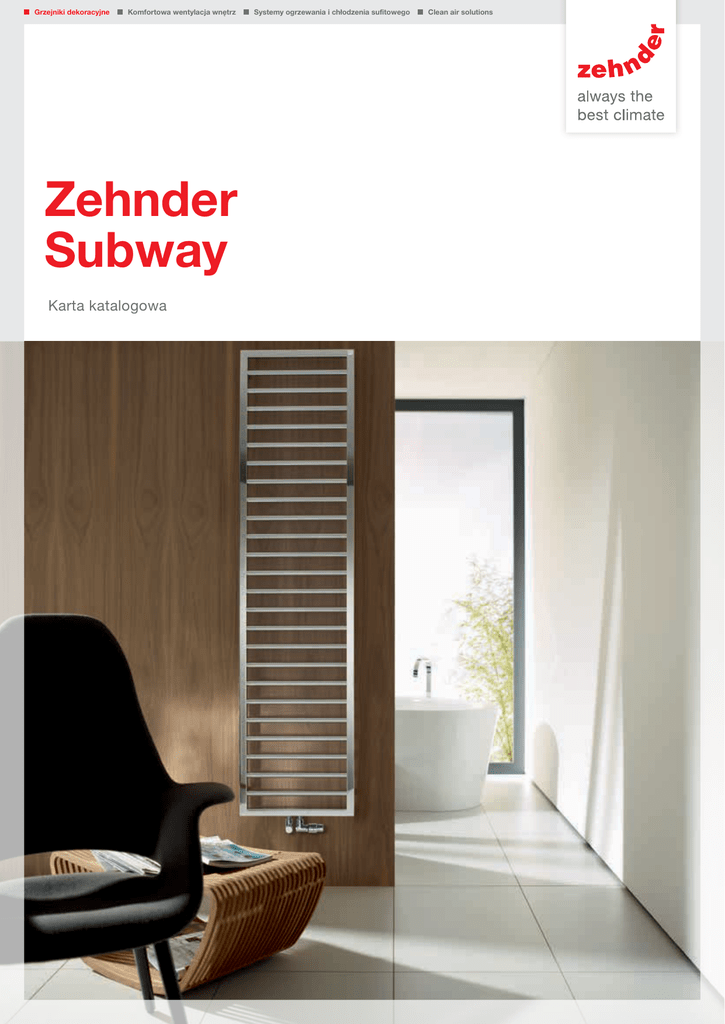 Grzejniki dekoracyjne Komfortowa wentylacja wnętrz Zehnder Subway Karta katalogowa Systemy ogrzewania i chłodzenia sufitowego Clean air solutions Zehnder Subway Minimalizm na ścianie. Zehnder Subway to czystość designu dzięki minimalistycznemu wzornictwu. Grzejnik zachwyca swoją prostą i bezkompromisową formą. Wyrazista czworokątna rama i filigranowe okrągłe rurki tworzą "perełkę" wzornictwa. Dostępny w niemal wszystkich kolorach i powierzchniach z palety Zehnder. Zalety ■ Ciekawe wzornictwo doskonałe dla stosowania w klasycznych łazienkach ■ Geometryczny wygląd dzięki okalającej konsoli montażowej ■ Duże odległości między rurkami pozwalają na wygodne zawieszanie ręczników ■ Wersja inox ze szczotkowanej stali nierdzewnej zapewnia odporność na korozję ■ Wszechstronne możliwości stosowania dzięki rozwiązaniom specjalnym, na przykład modele w formie ścianki działowej ■ Duże odległości między rurkami umożliwiają łatwe czyszczenie Zalety wersji z zasilaniem wodnym ■ Elastyczna instalacja dzięki przyłączu środkowemu 50 mm oraz przyłączom z lewej i prawej strony – na zapytanie Zalety wersji z zasilaniem wodno-elektrycznym ■ Grzejniki elektryczne pozwalają cieszyć się ciepłymi wnętrzami przez cały rok ■ Mniejsze nakłady związane z instalacją dzięki zamontowanej fabrycznie i estetycznie zintegrowanej grzałce elektrycznej Zalety wersji z zasilaniem 100% elektrycznym ■ Zabezpieczenie przed pracą "na sucho" chroni grzejnik przed przegrzaniem ■ Łatwy i szybki montaż dzięki dostarczeniu w postaci gotowej do podłączenia ■ Praca w zależności od potrzeb dzięki funkcji timera ■ Mniejsze nakłady związane z instalacją dzięki zamontowanej fabrycznie i estetycznie zintegrowanej grzałce elektrycznej ■ Prosta regulacja temperatury za pomocą sterownika bezprzewodowego ■ Sterowanie w zależności od potrzeb z zastosowaniem programu dziennego i tygodniowego ■ Grzejniki elektryczne pozwalają cieszyć się ciepłymi wnętrzami przez cały rok Przegląd modeli WIDOK Z PRZODU WIDOK Z PRZODU WIDOK Z PRZODU WIDOK Z PRZODU STRONA L =długość D = Wymiar ściany do środka przyłącza WA = odległość od ściany Wymiary podane w mm www.zehnder.pl V20161213, PL_pl, zmiany zastrzeżone Zehnder Subway Zasilanie wodne Grzejniki lakierowane Model H L Moc cieplna Moc grzał. elektr. mm 75/65/20 °C1) 70/55/24 °C 55/45/24 °C 55/45/20 °C mm W W W W SUB-060-045 613 450 310 223.6 136.9 164 - SUB-100-045 973 450 401 289.2 177.1 212 300 W SUB-130-045 1261 450 509 367.1 224.8 269 300 SUB-150-045 1549 450 615 443.6 271.6 325 600 SUB-180-045 1837 450 715 517.1 317.8 380 600 SUB-100-060 973 499 359.9 220.3 264 300 600 SUB-130-060 1261 600 639 460.9 282.2 337 600 SUB-150-060 1549 600 772 556.8 340.9 408 600 SUB-180-060 1837 600 898 649.4 399.1 477 900 Grzejniki chromowane Model H L mm Moc cieplna Moc grzał. elektr. 75/65/20 °C1) 70/55/24 °C 55/45/24 °C 55/45/20 °C mm W W W W SUBC-130-045 1261 450 336 241.1 146.4 W 176 300 SUBC-150-045 1549 450 413 296.3 180.0 216 300 SUBC-180-045 1837 450 486 348.7 211.8 254 300 SUBC-130-060 1261 600 408 293.5 179.0 214 300 SUBC-150-060 1549 600 502 361.1 220.2 264 300 SUBC-180-060 1837 600 590 424.5 258.8 310 600 Grzejniki ze stali szlachetnej szlifowanej na półpołysk Model H L mm SUBI-130-045 Moc cieplna Moc grzał. elektr. 75/65/20 °C1) 70/55/24 °C 55/45/24 °C 55/45/20 °C mm W W W W 1261 450 370 265.5 161.3 193 W 300 SUBI-150-045 1549 450 445 319.3 193.9 233 300 SUBI-180-045 1837 450 523 374.3 226.5 272 300 SUBI-130-060 1261 600 447 321.6 196.1 235 300 SUBI-150-060 1549 600 538 388.1 237.6 284 300 SUBI-180-060 1837 600 633 459.0 283.2 338 600 Zasilanie wodno-elektryczne Grzejniki lakierowane z grzałką Model H mm L Moc cieplna Moc grzał. elektr. 75/65/20 °C1) 70/55/24 °C 55/45/24 °C 55/45/20 °C mm W W W W SUBM-130-45/ID 1261 450 509 367.1 224.8 269 W 500 SUBM-150-45/ID 1549 450 615 443.6 271.6 325 600 SUBM-180-45/ID 1837 450 715 517.1 317.8 380 600 SUBM-130-60/ID 1261 600 639 460.9 282.2 337 600 SUBM-150-60/ID 1549 600 772 556.8 340.9 408 750 SUBM-180-60/ID 1837 600 898 649.4 399.1 477 900 H = wysokość, L = długość 1) Normatywna moc cieplna wg PN-EN 442 2) Podana wysokość bez grzałki elektrycznej (wysokość całkowita = H + 30 mm) www.zehnder.pl V20161213, PL_pl, zmiany zastrzeżone Zehnder Subway Grzejniki chromowane z grzałką Model H mm L Moc cieplna Moc grzał. elektr. 75/65/20 °C1) 70/55/24 °C 55/45/24 °C 55/45/20 °C mm W W W W W SUBMC-130-45/ID 1261 450 336 241.1 146.4 176 300 SUBMC-150-45/ID 1549 450 413 296.3 180.0 216 300 SUBMC-180-45/ID 1837 450 486 348.7 211.8 254 300 SUBMC-130-60/ID 1261 600 408 293.5 179.0 214 300 SUBMC-150-60/ID 1549 600 502 361.1 220.2 264 500 SUBMC-180-60/ID 1837 600 590 424.5 258.8 310 600 Wersje specjalne Extra model for use as guest WC radiator. Wersja z opcjonalnym zestawem montażowym do ścianek działowych H = wysokość, L = długość 1) Normatywna moc cieplna wg PN-EN 442 2) Podana wysokość bez grzałki elektrycznej (wysokość całkowita = H + 30 mm) www.zehnder.pl V20161213, PL_pl, zmiany zastrzeżone Zehnder Subway Wersja z zasilaniem wodnym z głowicą termostatyczną Zehnder i chromowana komfortowa armatura Zehnder. Wersja zasilana elektrycznie z urządzeniem sterującym na podczerwień Wersja zasilana elektrycznie z wbudowaną grzałką elektryczną WIVAR RF. Wersja zasilana elektrycznie z wbudowaną grzałką elektryczną WIVAR RF. Zehnder Polska Sp. z o.o. · ul. Kurpiów 14 A · 52-214 Wrocław · Polska T +48 71 367 64 24 · F +48 71 367 64 25 · [email protected] · www.zehnder.pl V20161213, RAD_DAS, PL_pl, zmiany zastrzeżone Warianty produktu i przyłączy