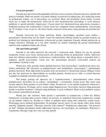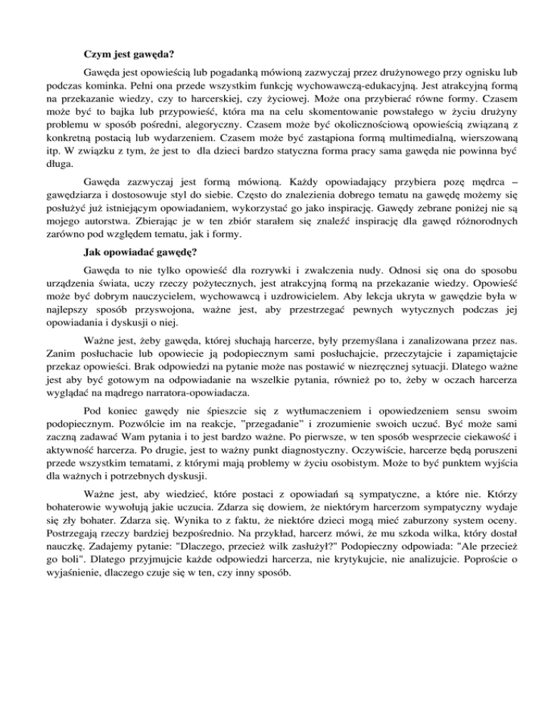 Czym jest gawęda? Gawęda jest opowieścią lub pogadanką mówioną zazwyczaj przez drużynowego przy ognisku lub podczas kominka. Pełni ona przede wszystkim funkcję wychowawczą-edukacyjną. Jest atrakcyjną formą na przekazanie wiedzy, czy to harcerskiej, czy życiowej. Może ona przybierać równe formy. Czasem może być to bajka lub przypowieść, która ma na celu skomentowanie powstałego w życiu drużyny problemu w sposób pośredni, alegoryczny. Czasem może być okolicznościową opowieścią związaną z konkretną postacią lub wydarzeniem. Czasem może być zastąpiona formą multimedialną, wierszowaną itp. W związku z tym, że jest to dla dzieci bardzo statyczna forma pracy sama gawęda nie powinna być długa. Gawęda zazwyczaj jest formą mówioną. Każdy opowiadający przybiera pozę mędrca – gawędziarza i dostosowuje styl do siebie. Często do znalezienia dobrego tematu na gawędę możemy się posłużyć już istniejącym opowiadaniem, wykorzystać go jako inspirację. Gawędy zebrane poniżej nie są mojego autorstwa. Zbierając je w ten zbiór starałem się znaleźć inspirację dla gawęd różnorodnych zarówno pod względem tematu, jak i formy. Jak opowiadać gawędę? Gawęda to nie tylko opowieść dla rozrywki i zwalczenia nudy. Odnosi się ona do sposobu urządzenia świata, uczy rzeczy pożytecznych, jest atrakcyjną formą na przekazanie wiedzy. Opowieść może być dobrym nauczycielem, wychowawcą i uzdrowicielem. Aby lekcja ukryta w gawędzie była w najlepszy sposób przyswojona, ważne jest, aby przestrzegać pewnych wytycznych podczas jej opowiadania i dyskusji o niej. Ważne jest, żeby gawęda, której słuchają harcerze, były przemyślana i zanalizowana przez nas. Zanim posłuchacie lub opowiecie ją podopiecznym sami posłuchajcie, przeczytajcie i zapamiętajcie przekaz opowieści. Brak odpowiedzi na pytanie może nas postawić w niezręcznej sytuacji. Dlatego ważne jest aby być gotowym na odpowiadanie na wszelkie pytania, również po to, żeby w oczach harcerza wyglądać na mądrego narratora-opowiadacza. Pod koniec gawędy nie śpieszcie się z wytłumaczeniem i opowiedzeniem sensu swoim podopiecznym. Pozwólcie im na reakcje, ”przegadanie” i zrozumienie swoich uczuć. Być może sami zaczną zadawać Wam pytania i to jest bardzo ważne. Po pierwsze, w ten sposób wesprzecie ciekawość i aktywność harcerza. Po drugie, jest to ważny punkt diagnostyczny. Oczywiście, harcerze będą poruszeni przede wszystkim tematami, z którymi mają problemy w życiu osobistym. Może to być punktem wyjścia dla ważnych i potrzebnych dyskusji. Ważne jest, aby wiedzieć, które postaci z opowiadań są sympatyczne, a które nie. Którzy bohaterowie wywołują jakie uczucia. Zdarza się dowiem, że niektórym harcerzom sympatyczny wydaje się zły bohater. Zdarza się. Wynika to z faktu, że niektóre dzieci mogą mieć zaburzony system oceny. Postrzegają rzeczy bardziej bezpośrednio. Na przykład, harcerz mówi, że mu szkoda wilka, który dostał nauczkę. Zadajemy pytanie: "Dlaczego, przecież wilk zasłużył?" Podopieczny odpowiada: "Ale przecież go boli". Dlatego przyjmujcie każde odpowiedzi harcerza, nie krytykujcie, nie analizujcie. Poproście o wyjaśnienie, dlaczego czuje się w ten, czy inny sposób. 1. Byk i wilki1 Nosił byk kosy po mieście i sprzedawał je każdemu, kto ich potrzebował. Pytali się ludzie byka, którego nazywali Bysiorek: – A po co ci kosy? A byk odpowiada: – Będę kosić! Poszedł do dworu, zgłosił się na kosiarza, wyklepał kosę i zaczął kosić. Kosi byk – podchodzi do niego wilk i mówi: – Ty jesteś Bysiorek? – Tak to ja. – Kosisz siano? – Koszę. – Rogami kręcisz? – Kręcę. – Ogonem mielisz? – Mielę. – Boisz się mnie? – Ja was i dziesięciorga się nie boję. Wilk poszedł szukać drugiego wilka. Znalazł i mówi: – Тam kosi byk za duży na jednego. Nie boi się mnie. Poszli we dwóch do byka. Idą i mówią: – Ty jesteś Bysiorek? – Tak to ja. – Kosisz siano? – Koszę. – Rogami kręcisz? – Kręcę. – Ogonem mielisz? 1 Bajka białoruska, tłumaczenie własne, – Mielę. – Jest nas dwóch, boisz się nas? – Niespecjalnie... Wilki poszły szukać trzeciego wilka. Znaleźli i mówią: – Тam kosi byk za duży na dwóch. Nie boi się nas. Poszli we trzech do byka. Idą i mówią: – Ty jesteś Bysiorek? – Tak to ja. – Kosisz siano? – Koszę. – Rogami kręcisz? – Kręcę. – Ogonem mielisz? – Mielę. – Teraz jest nas trzech! Pewno się nas wystraszyłeś? – Niekoniecznie... Wilki poszły szukać czwartego wilka. Znaleźli i mówią: – Тam kosi byk za duży na trzech. Nie boi się nas. Poszli we czterech do byka. Idą i mówią: – Ty jesteś Bysiorek? – Tak to ja. – Kosisz siano? – Koszę. – Rogami kręcisz? – Kręcę. – Ogonem mielisz? – Mielę. – Nawet taki byk jak Ty przestraszy się czterech wilków... – Nie, nie boję się Was. Wilki poszły szukać piątego wilka. Znaleźli i mówią: – Тam kosi byk za duży na czterech. Nie boi się nas. Poszli w pięciu do byka. Idą i mówią: – Ty jesteś Bysiorek? – Tak to ja. – Kosisz siano? – Koszę. – Rogami kręcisz? – Kręcę. – Ogonem mielisz? – Mielę. – Czterech może i się nie bałeś, ale pięciu nie dasz rady.. – Nie przestraszycie mnie. Poszły wilki szukać szóstego. Wtedy byk już się trochę wystraszył i poszedł z powrotem do dworu. Wyklepał kosę, potem nauczył konia kopać, kozła nauczył walić, barana nauczył bodać, a koguta nauczył drapać. Wtedy wilki przyszły w sześciu na łąkę, patrzą, a byka nie ma. Poszli do byka na dwór i mówią: – Aha, Bysiorek, wystraszyłeś się nas! – Nie, nie wystraszyłem się, zachciało mi się jeść, więc poszedłem do dworu. Wtedy skoczyli na byka z zębami, a byk ich potraktowała kosą, koń zaczął kopać, kozioł zaczął walić, baran ich pobódł,