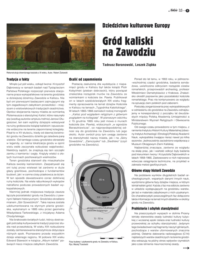 5•6 2008 5 Dziedzictwo kulturowe Europy Gród kaliski na Zawodziu Tadeusz Baranowski, Leszek Ziąbka Rekonstrukcja drewnianego kościoła z XI wieku. Autor, Robert Żukowski Tradycja a fakty Ocalić od zapomnienia Minęło już pół wieku, odkąd Iwona i Krzysztof Dąbrowscy w ramach badań nad Tysiącleciem Państwa Polskiego rozpoczęli pierwsze stacjonarne prace wykopaliskowe na terenie grodziska w dzisiejszej dzielnicy Zawodzie w Kaliszu. Nie byli oni pierwszymi badaczami zajmującymi się tym zagadkowym zabytkiem przeszłości – miejscem o wielowiekowych tradycjach osadnictwa. Oprócz skojarzenia nazwy miasta ze wzmianką Ptolemeusza o starożytnej Kalisii, które nasunęło się (według autorów artykułu trafnie) Janowi Długoszowi, ten sam wybitny dziejopis wskazywał na ruiny grobowców książąt kaliskich i opuszczenie widoczne na terenie zapomnianej kolegiaty. Pisał to w XV stuleciu, kiedy od dawnej świetności grodu na Zawodziu dzieliło go zaledwie parę wieków. Od tamtego czasu grodzisko obrastało w legendy, a i sama lokalizacja grodu w opinii wielu osób zaczynała wzbudzać wątpliwości. Niektórzy sądzili, że znajdują się tam szczątki zamku z kamienia i cegły. Krążyły wieści o złotych trumnach pochowanych wielmożów. Teren grodziska stanowił dla mieszkańców Kalisza swoisty kamieniołom. Zaopatrywali się oni tutaj przez wieleset lat zarówno w duże głazy granitowe, pochodzące z fundamentów budowli, jak i w cenne ciosy piaskowca ze ścian. W ten sposób dewastowano coraz dotkliwiej ruiny kościoła. Na wiele rabunkowych wykopów natrafiono podczas prowadzonych badań wykopaliskowych. Niemniej jednak miejscowa tradycja zawsze łączyła pozostałości grodu na Zawodziu z pewnymi faktami historycznymi. Grodzisko określano mianem „Gór Szwedzkich”. Taka nazwa została udokumentowana na słynnym planie grodziska, wykonanym w 1885 roku przez geometrę Władysława Tarłowskiego, z inicjatywy Adama Chodyńskiego. Nie brakowało światłych ludzi, którzy dostrzegali potrzebę kultywowania tradycji poprzez studia nad przeszłością. W wieku XIX rozbudzone zostały zainteresowania starożytnicze dotyczące różnych epok. Poznawano przede wszystkim dzieje własnego regionu. W połowie XIX wieku Edward Stawecki w książce „Album kaliski” poświęcił nieco miejsca zabytkom Zawodzia. Postacią zasłużoną dla wydobycia z niepamięci grodu w Kaliszu był także ksiądz Piotr Kobyliński (pleban dobrzecki), który powiązał znaleziska rozsypisk murów na Zawodziu ze wzmiankami o kościele św. Pawła. Publikował on w latach sześćdziesiątych XIX wieku fragmenty opracowania na temat dziejów Kościoła w Kaliszu na łamach „Tygodnika Katolickiego”. W latach 1865-1866 zamieścił rodzaj monografii – „Kalisz pod względem religijnym z głównym poglądem na kollegiatę”. W pierwszym odcinku z 15 grudnia 1865 roku jest mowa o murach kościoła (św. Pawła), widocznych „w ogrodzie Baraszkiewicza”, co najprawdopodobniej odnosi się do grodziska na Zawodziu lub jego okolic. Autor zwrócił przy tym uwagę zarówno na starożytność nazwy miasta, jak i na „Góry Szwedzkie”, „Zamczysko” lub „Siedlisko” (czyli grodzisko na Zawodziu). Ponad sto lat temu, w 1903 roku, w północno-wschodniej części grodziska, badania sondażowe, uwieńczone odkryciem rozsypisk ciosów romańskich, przeprowadził archeolog, profesor Włodzimierz Demetrykiewicz z Krakowa. Znalezisko określił poprawnie jako pozostałości kościoła romańskiego. Prac nie kontynuowano ze względu na sytuację ziem polskich pod zaborami. Postulaty zorganizowania prac wykopaliskowych w odniesieniu do grodziska na Zawodziu odnajdujemy w korespondencji z początku lat dwudziestych między Polską Akademią Umiejętności a Ministerstwem Wyznań Religijnych i Oświecenia Publicznego. Od owego czasu prowadzono w tym miejscu, z ramienia Instytutu Historii Kultury Materialnej (obecny Instytut Archeologii i Etnologii) Polskiej Akademii Nauk, wykopaliska trwające nieraz nawet po kilka sezonów. Jednocześnie zacieśniono współpracę z Muzeum Okręgowym Ziemi Kaliskiej. Najbardziej znaczące, zarówno ze względu na skalę prac, jak i wartość odkryć były badania pod kierunkiem Iwony i Krzysztofa Dąbrowskich w latach 1958-1965. Zastosowano w nich najnowsze wówczas osiągnięcia techniczne, na przykład w zakresie metod geofizycznych. Główne etapy historii Zawodzia Na podstawie wyników długoletnich badań archeologicznych, wspartych danymi innych nauk, wyróżniono główne fazy dziejów miejsca, w którym istniał kaliski gród. Każda z faz ma odbicie zarówno w układzie występujących na grodzisku warstw, jak też w materiale zabytkowym z nich uzyskanym. Do charakterystyki poszczególnych faz dołączono także informacje na temat innych obiektów w okolicy grodu na Zawodziu. Prahistoria i schyłek starożytności Fazy budowy i użytkowania grodu na Zawodziu w Kaliszu. Rys. Maciej Trzeciecki Na piaszczystych wyspach w dolinie Prosny istniały stanowiska osady ludności kultury łużyckiej z wczesnej epoki żelaza oraz ludności kultury przeworskiej ze schyłku starożytności. Jedynym tego świadectwem są fragmenty naczyń glinianych, pochodzące z warstw uformowanych znacznie później. Ostatnie datowania radiowęglowe (C14) najstarszych warstw osadniczych na terenie grodziska wskazują na późny okres wpływów rzymskich jako czas istnienia nieumocnionej osady. 6 5•6 2008 badania archeologiczne Początki wczesnego średniowiecza Z wieków VI-VII pozostały ślady działalności ludzkiej (głównie w postaci fragmentów naczyń). Ze względu na bardzo ograniczoną liczbę tych źródeł niewiele można powiedzieć o charakterze tego miejsca; najprawdopodobniej była to osada otwarta. Osada otwarta o podobnym datowaniu powstała również na północny zachód od centrum dzisiejszego Kalisza (tak zwana ulica Wydarte). Pochodzi z niej piękna ozd