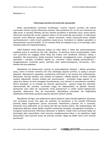 Materiał pomocniczy do modułu szóstego Centrum Edukacji Obywatelskiej Materiał nr 1 Informacja zwrotna od ucznia dla nauczyciela Kiedy wprowadzamy ocenianie kształtujące, uczymy naszych uczniów, jak ważna w procesie uczenia się jest informacja zwrotna. Aby przekonać ich, że ma ona znaczenie nie tylko teraz, w sytuacji szkolnej, ale jest również przydatna w dorosłym życiu, warto oprócz informacji zwrotnej dla ucznia, poprosić także o IZ od ucznia dla nauczyciela. Ta informacja zwrotna może dotyczyć sposobów i metod nauczania, relacji nauczyciel-uczeń, działań wychowawczych i wielu innych aspektów naszej pracy. Uczniowie to najlepsi specjaliści w obserwowaniu naszych działań. To oni wiedzą, kiedy się najlepiej uczą, co im pomaga i jakie metody są dla nich najskuteczniejsze. Takie badanie może dotyczyć jednej czy kilku lekcji, a także być podsumowaniem wspólnej pracy w semestrze lub roku szkolnym. To pierwsze warto przeprowadzić, kiedy nasi uczniowie nie osiągają celów lekcji lub trudno nam zbudować właściwe relacje z zespołem. Nie powinniśmy wtedy stosować trudnych, wymagających czasu i przygotowań sposobów i narzędzi. Przydatna będzie np. rozmowa z klasą według przemyślanych i przygotowanych wcześniej pytań, technika zdań podsumowujących, termometr, miniankieta lub tym podobne. Niezależnie od skuteczności uczenia na poszczególnych lekcjach i dobrej atmosfery pracy, warto na koniec semestru lub roku szkolnego zapytać uczniów, co sądzą o naszych zajęciach. Najszybszym sposobem uzyskiwania informacji w tej sytuacji jest ankietowanie. Nauczyciel, tworząc ankietę, sam określa cel badania i układa pytania, na które chciałby uzyskać odpowiedź. Atutem ankiety jest anonimowość - uczniowie mogą napisać to, co sądzą bez obawy, że ktoś wyciągnie konsekwencje, oraz łatwość w opracowaniu wyników. Warto pamiętać, że ta metoda ma również ograniczenia - pytania mogą być nietrafne, niezrozumiałe dla uczniów, uczniowie mogą nie odpowiedzieć na pytania otwarte. Zachęcamy więc także do stosowania mniej popularnych w szkole metod badawczych: wywiadu, obserwacji, listu do nauczyciela, identyfikacji przeszkód, itp. Najbardziej obiektywne informacje uzyskamy poprzez łączenie różnych metod. Niezależnie od tego, jaki wybierzemy zakres badania i jakie metody będziemy stosować, nasi uczniowie muszą znać jego cel, wiedzieć, że pozyskane w ten sposób informacje pozwolą lepiej organizować proces nauczania. Powinniśmy poprosić ich o szczerość, otwartość oraz podkreślić, że ich opinia jest dla nas bardzo ważna. Ale najistotniejsze dla budowania dobrych relacji będzie wspólne omówienie wyników, wyciagnięcie wniosków, a następnie wykorzystanie informacji zebranych w badaniu. Dzięki temu uczniowie będą nas postrzegać jako sojuszników, mieć poczucie współautorstwa lekcji, a my będziemy mogli dostosować swój warsztat pracy do potrzeb uczniów. Będą się dzięki temu czuli naszymi partnerami. Kurs internetowy „Lider oceniania kształtującego w szkole” 1 Materiał pomocniczy do modułu szóstego Centrum Edukacji Obywatelskiej Poniżej doświadczenia i opinie nauczycieli stosujących w swojej praktyce informację zwrotną ucznia dla nauczyciela: „Zebranie opinii od uczniów oparłam na ocenianiu kształtującym. Na początku II semestru wspólnie z uczniami ustaliliśmy nacobezu dla nauczyciela. Dotyczyło głównie sposobów i technik nauczania stosowanych podczas lekcji biologii. Podczas całego semestru nacobezu wisiało na drzwiach pracowni, a ja, prowadząc zajęcia, starałam się sprostać tym kryteriom oceniania. Pod koniec roku szkolnego uczniowie indywidualnie, anonimowo, odnosząc się do nacobezu, pisali informacje zwrotne na temat mojego sposobu uczenia. Umówiliśmy się, że IZ napiszą na komputerach i zbiorą do jednej teczki. W ostatnim punkcie IZ, dotyczącym kierunków na przyszłość, uczniowie mogli udzielać mi rad, ale też zaproponować modyfikacje wcześniej stworzonego przez nas nacobezu. […] Uczniowie podkreślali, że czuli, iż mają wpływ na to, w jaki sposób zdobywają wiedzę, że traktuję ich jako partnerów w procesie nauczania.” Justyna Franczak „Może to być przeprowadzona z uczniami raz w semestrze wymiana informacji zwrotnych. Robię to zawsze z nowymi klasami- proszę ich o informację zwrotną dla mnie: co im się na moich lekcjach podoba, a co jest trudne, nudne i oceniane przez nich jako bezużyteczne. […] Przystąpienie do takiej rozmowy wymaga od nauczyciela gotowości do zmiany niektórych elementów swojej pracy. Jeśli uczniowie widzą skuteczność takiej IZ dla nauczyciela, jeśli jest on w stanie uwzględnić niektóre ich uwagi, w przyszłości chętnie i rzetelnie rozmawiają z nim na ten temat. […] Uzyskiwanie obiektywnych informacji jest możliwe w sytuacji zaufania i pełnego poczucia bezpieczeństwa ucznia.” Małgorzata Osińska „(…)Dużo dają mi rozmowy o lekcji przeprowadzone z uczniami podczas jej trwania. Co jakiś czas mam taką swobodną lekcję, która ma na celu, poznanie opinii uczniów na temat pracy na zajęciach, materiału i omawianych zagadnień. Ćwiczymy wtedy poprawne wypowiadanie się i sztukę dyskusji – a przy okazji poznaję opinię uczniów. Dużo dają mi również zdania podsumowujące, które uczniowie piszą w zeszytach.” Ewa Kurek „W mojej klasie mam tak zwaną skrzynkę pytań i wniosków. Czasami znajduje tam ciekawe wskazówki do dalszej pracy.” Jolanta Kisiała „Na kartkach zamieszczam różne pytania lub niedokończone zdania w zależności od tego, jak zaplanowałam lekcję, np. „Najciekawszym ćwiczeniem było: …. (…) Najlepiej czułam się, gdy pani Ewa … Pod koniec lekcji piszą swoje opinie. Poza tym często na tychże kartkach uczniowie oceniają swoją pracę na lekcji. Wtedy oceniają również moją pracę.” Ewa Borgosz Podane niżej przykł