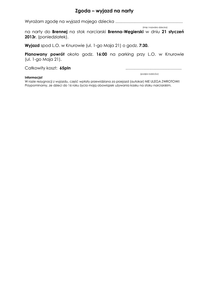 Zgoda – wyjazd na narty Wyrażam zgodę na wyjazd mojego dziecka ………………………………………… (imię i nazwisko dziecka) na narty do Brennej na stok narciarski Brenna-Węgierski w dniu 21 styczeń 2013r. (poniedziałek). Wyjazd spod L.O. w Knurowie (ul. 1-go Maja 21) o godz. 7:30. Planowany powrót około godz. 16:00 na parking przy L.O. w Knurowie (ul. 1-go Maja 21). Całkowity koszt: 65pln …………………………………. (podpis rodziców) Informacja! W razie rezygnacji z wyjazdu, część wpłaty przewidziana za przejazd (autokar) NIE ULEGA ZWROTOWI! Przypominamy, ze dzieci do 16 roku życia mają obowiązek używania kasku na stoku narciarskim.