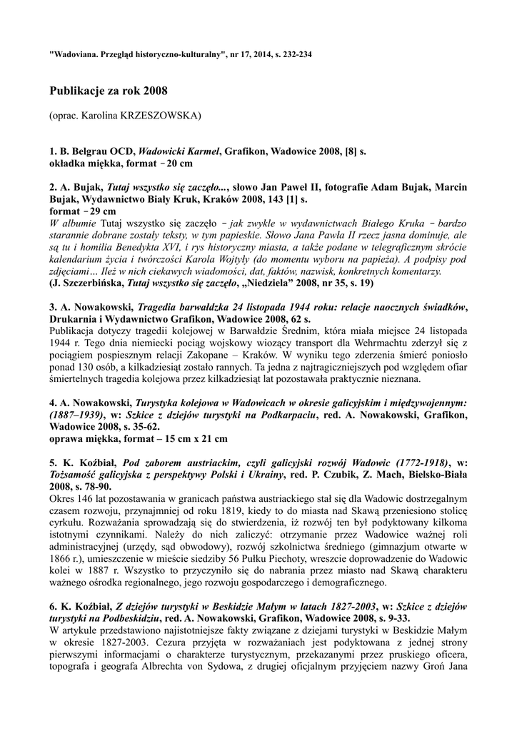 "Wadoviana. Przegląd historyczno-kulturalny", nr 17, 2014, s. 232-234 Publikacje za rok 2008 (oprac. Karolina KRZESZOWSKA) 1. B. Belgrau OCD, Wadowicki Karmel, Grafikon, Wadowice 2008, [8] s. okładka miękka, format ‒ 20 cm 2. A. Bujak, Tutaj wszystko się zaczęło..., słowo Jan Paweł II, fotografie Adam Bujak, Marcin Bujak, Wydawnictwo Biały Kruk, Kraków 2008, 143 [1] s. format ‒ 29 cm W albumie Tutaj wszystko się zaczęło ‒ jak zwykle w wydawnictwach Białego Kruka ‒ bardzo starannie dobrane zostały teksty, w tym papieskie. Słowo Jana Pawła II rzecz jasna dominuje, ale są tu i homilia Benedykta XVI, i rys historyczny miasta, a także podane w telegraficznym skrócie kalendarium życia i twórczości Karola Wojtyły (do momentu wyboru na papieża). A podpisy pod zdjęciami… Ileż w nich ciekawych wiadomości, dat, faktów, nazwisk, konkretnych komentarzy. (J. Szczerbińska, Tutaj wszystko się zaczęło, „Niedziela” 2008, nr 35, s. 19) 3. A. Nowakowski, Tragedia barwałdzka 24 listopada 1944 roku: relacje naocznych świadków, Drukarnia i Wydawnictwo Grafikon, Wadowice 2008, 62 s. Publikacja dotyczy tragedii kolejowej w Barwałdzie Średnim, która miała miejsce 24 listopada 1944 r. Tego dnia niemiecki pociąg wojskowy wiozący transport dla Wehrmachtu zderzył się z pociągiem pospiesznym relacji Zakopane – Kraków. W wyniku tego zderzenia śmierć poniosło ponad 130 osób, a kilkadziesiąt zostało rannych. Ta jedna z najtragiczniejszych pod względem ofiar śmiertelnych tragedia kolejowa przez kilkadziesiąt lat pozostawała praktycznie nieznana. 4. A. Nowakowski, Turystyka kolejowa w Wadowicach w okresie galicyjskim i międzywojennym: (1887–1939), w: Szkice z dziejów turystyki na Podkarpaciu, red. A. Nowakowski, Grafikon, Wadowice 2008, s. 35-62. oprawa miękka, format – 15 cm x 21 cm 5. K. Koźbiał, Pod zaborem austriackim, czyli galicyjski rozwój Wadowic (1772-1918), w: Tożsamość galicyjska z perspektywy Polski i Ukrainy, red. P. Czubik, Z. Mach, Bielsko-Biała 2008, s. 78-90. Okres 146 lat pozostawania w granicach państwa austriackiego stał się dla Wadowic dostrzegalnym czasem rozwoju, przynajmniej od roku 1819, kiedy to do miasta nad Skawą przeniesiono stolicę cyrkułu. Rozważania sprowadzają się do stwierdzenia, iż rozwój ten był podyktowany kilkoma istotnymi czynnikami. Należy do nich zaliczyć: otrzymanie przez Wadowice ważnej roli administracyjnej (urzędy, sąd obwodowy), rozwój szkolnictwa średniego (gimnazjum otwarte w 1866 r.), umieszczenie w mieście siedziby 56 Pułku Piechoty, wreszcie doprowadzenie do Wadowic kolei w 1887 r. Wszystko to przyczyniło się do nabrania przez miasto nad Skawą charakteru ważnego ośrodka regionalnego, jego rozwoju gospodarczego i demograficznego. 6. K. Koźbiał, Z dziejów turystyki w Beskidzie Małym w latach 1827-2003, w: Szkice z dziejów turystyki na Podbeskidziu, red. A. Nowakowski, Grafikon, Wadowice 2008, s. 9-33. W artykule przedstawiono najistotniejsze fakty związane z dziejami turystyki w Beskidzie Małym w okresie 1827-2003. Cezura przyjęta w rozważaniach jest podyktowana z jednej strony pierwszymi informacjami o charakterze turystycznym, przekazanymi przez pruskiego oficera, topografa i geografa Albrechta von Sydowa, z drugiej oficjalnym przyjęciem nazwy Groń Jana Pawła II (zamiast Jaworzyny), co stanowiło wyraz uznania dla najbardziej znanego „turysty beskidzkiego”. Autor omawia m.in. powstanie szlaków i organizacji turystycznych, schronisk górskich (w szczególności pod Leskowcem), wreszcie rozwój turystyki w tym paśmie Beskidów po 1945 r. 7. S. Książek, Ponikiew. Śladami naszych przodków 1395-2005, Drukarnia Tabil, Ponikiew 2008, 339 s. oprawa miękka, format – 24,5 cm x 20,5 cm Książka ta stanowi zapis kilkuletniej pracy autora nad historią Ponikwi. Jest próbą rekonstrukcji dziejów wsi od najdawniejszych czasów aż po prawie dzień dzisiejszy. Jedne z najciekawszych i najbardziej wartościowych fragmentów tej publikacji dotyczą opisu codziennego życia mieszkańców Ponikwi, obyczajów, obrzędów, tym ciekawszych, że część z nich niestety już znikła lub powoli zanika. Książka jest napisana zrozumiałym językiem. Jej wartość podnoszą niewątpliwie liczne zdjęcia i tabele. 8. Szkice z dziejów turystyki na Podbeskidziu, red. A. Nowakowski, Oficyna Wydawnicza Grafikon, Wadowice 2008, 95 s. oprawa miękka, format – 15 cm x 21 cm Artykuły i szkice zawarte w niniejszej publikacji ukazują rozwój turystyki na Podbeskidziu. Chronologiczne opracowanie obejmuje okres do przełomu XIX i XX w. aż po lata 90. XX w.. Zakres przedmiotowy dotyczy kilku zagadnień: turystyki górskiej, zarówno pieszej, jak i narciarskiej, a także infrastrukturalnych, w tym także komunikacyjnych, uwarunkowań uprawiania turystyki. Ponadto opracowanie zawiera także szkic poświęcony największej tragedii górskiej II Rzeczypospolitej, która wydarzyła się pod Babią Górą 14 lutego 1935 r. 9. Śladami Jana Pawła II po Małopolsce. Przewodnik, oprac. K. Bzowski, J. Tokarski, BOSZ, Olszanica 2008, 247 s. oprawa zintegrowana, format ‒ 12 cm x 22 cm Przewodnik prowadzi śladami Karola Wojtyły – Jana Pawła II. Od Wadowic do Krakowa, przez górskie szlaki i wszystkie miejsca ważne w życiu wielkiego Polaka. W 2008 r. w oficynie wydawniczej BOSZ przewodnik ukazał się także w wersji angielskojęzycznej w pomniejszonym formacie i objętości (9,5 cm x 14 cm; 80 s.) ‒The Routes of John Paul II. 10. P. Zuchniewicz, Lolek. Młode lata papieża, Wydawnictwo Prószyński i S-ka, Warszawa 2008, 328 s. oprawa twarda, format – 15 cm x 21 cm Książka ta jest fabularyzowaną biografią Karola Wojtyły. Odnaleźć w niej można opisy dzieciństwa, okresu nauki szkolnej i studiów w Krakowie, a także dramatyczne lata okupacji. Przedstawia młodzieńcze dokonania artystyczne Karola Wojtyły oraz okoliczności podjęcia decyzji o wstąpieniu do se