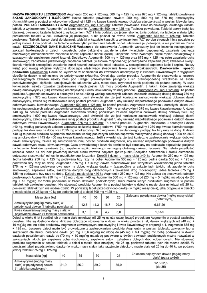 NAZWA PRODUKTU LECZNICZEGO Augmentin 250 mg + 125 mg, 500 mg + 125 mg oraz 875 mg + 125 mg, tabletki powlekane SKŁAD JAKOŚCIOWY I ILOŚCIOWY Każda tabletka powlekana zawiera 250 mg, 500 mg lub 875 mg amoksycyliny (Amoxicillinum) w postaci amoksycyliny trójwodnej i 125 mg kwasu klawulanowego (Acidum clavulanicum) w postaci klawulanianu potasu. POSTAĆ FARMACEUTYCZNA Augmentin 250 mg + 125 mg: Tabletka powlekana. Białe do białawego, owalnego kształtu tabletki z wytłoczeniem “Augmentin” po jednej stronie. Augmentin 500 mg + 125 mg: Tabletka powlekana. Tabletki barwy białej lub białawej, owalnego kształtu tabletki z wytłoczeniem “AC” i linią podziału po jednej stronie. Linia podziału na tabletce ułatwia tylko przełamanie tabletki w celu ułatwienia jej połknięcia, a nie podział na równe dawki. Augmentin 875 mg + 125 mg: Tabletka powlekana. Tabletki barwy białej do białawej, tabletki w kształcie kapsułki z wytłoczeniem “AC” po obu stronach i linią podziału po jednej stronie. Linia podziału na tabletce ułatwia tylko przełamanie tabletki w celu ułatwienia jej połknięcia, a nie podział na równe dawki. SZCZEGÓŁOWE DANE KLINICZNE Wskazania do stosowania Augmentin wskazany jest do leczenia następujących zakażeń bakteryjnych u dzieci i dorosłych: ostre bakteryjne zapalenie zatok (właściwie rozpoznane); zapalenie pęcherza moczowego; odmiedniczkowe zapalenie nerek; zapalenie tkanki łącznej; ukąszenia przez zwierzęta; ciężki ropień okołozębowy z szerzącym się zapaleniem tkanki łącznej. Dodatkowo Augmentin 500 mg + 125 mg oraz 875 mg + 125 mg: ostre zapalenie ucha środkowego; zaostrzenie przewlekłego zapalenia oskrzeli (właściwie rozpoznane); pozaszpitalne zapalenie płuc; zakażenia skóry i tkanek miękkich szczególnie zapalenie tkanki łącznej; zakażenia kości i stawów, w szczególności zapalenie kości i szpiku. Należy wziąć pod uwagę oficjalne wytyczne dotyczące właściwego stosowania leków przeciwbakteryjnych. Dawkowanie i sposób podawania Dawkowanie Dawki są wyrażone w odniesieniu do zawartości amoksycyliny z kwasem klawulanowym z wyjątkiem określenia dawek w odniesieniu do pojedynczego składnika. Określając dawkę produktu Augmentin do stosowania w leczeniu poszczególnych zakażeń należy brać pod uwagę: przewidywane patogeny i ich prawdopodobną wrażliwość na środki przeciwbakteryjne; ciężkość i umiejscowienie zakażenia; wiek, masę ciała, czynności nerek pacjenta jak podano poniżej. W razie konieczności należy rozważyć zastosowanie innych postaci lub mocy produktu Augmentin, tj. takich, które zawierają większą dawkę amoksycyliny i (lub) zawierają amoksycylinę i kwas klawulanowy w innej proporcji. Augmentin 250 mg + 125 mg: Ta postać produktu Augmentin stosowana u dorosłych i dzieci 40 kg według poniższych zaleceń, zapewnia całkowitą dawkę dobową 750 mg amoksycyliny i 375 mg kwasu klawulanowego. Jeśli stwierdzi się, że jest konieczne zastosowanie większej dobowej dawki amoksycyliny, zaleca się zastosowanie innej postaci produktu Augmentin, aby uniknąć niepotrzebnego podawania dużych dawek dobowych kwasu klawulanowego. Augmentin 500 mg + 125 mg: Ta postać produktu Augmentin stosowana u dorosłych i dzieci 40 kg według poniższych zaleceń zapewnia całkowitą dawkę dobową 1500 mg amoksycyliny i 375 mg kwasu klawulanowego. U dzieci <40 kg, ta postać produktu Augmentin stosowana według poniższych zaleceń zapewnia całkowitą dawkę dobową 2400 mg amoksycyliny i 600 mg kwasu klawulanowego. Jeśli stwierdzi się, że jest konieczne zastosowanie większej dobowej dawki amoksycyliny, zaleca się zastosowanie innej postaci produktu Augmentin, aby uniknąć niepotrzebnego podawania dużych dawek dobowych kwasu klawulanowego. Augmentin 875 mg + 125 mg: Ta postać produktu Augmentin, stosowana u dorosłych i dzieci 40 kg, według poniższych zaleceń zapewnia całkowitą dawkę dobową 1750 mg amoksycyliny i 250 mg kwasu klawulanowego, podając lek dwa razy na dobę oraz 2625 mg amoksycyliny i 375 mg kwasu klawulanowego, podając lek trzy razy na dobę. U dzieci <40 kg ta postać produktu Augmentin stosowana według poniższych zaleceń zapewnia maksymalną dawkę dobową 1000 do 2800 mg amoksycyliny i 143 do 400 mg kwasu klawulanowego. Jeśli stwierdzi się, że jest konieczne zastosowanie większej dobowej dawki amoksycyliny, zaleca się zastosowanie innej postaci produktu Augmentin, aby uniknąć niepotrzebnego podawania dużych dawek dobowych kwasu klawulanowego. Czas prowadzonego leczenia powinien być określany na podstawie odpowiedzi pacjenta na leczenie. Niektóre zakażenia (np. zapalenie szpiku kostnego) wymagają dłuższego okresu leczenia. Nie należy przedłużać leczenia ponad 14 dni bez powtórnej kontroli stanu zdrowia pacjenta (patrz punkt „Specjalne ostrzeżenia i środki ostrożności dotyczące stosowania” odnośnie przedłużonego leczenia). Dorośli i dzieci o masie ciała 40 kg Augmentin 250 mg + 125 mg: Jedna tabletka 250 mg + 125 mg podawana trzy razy na dobę. Augmentin 500 mg + 125 mg: Jedna dawka 500 mg + 125 mg podawana trzy razy na dobę. Augmentin 875 mg + 125 mg: dawka standardowa: (we wszystkich wskazaniach) jedna tabletka 875 mg + 125 mg podawana dwa razy na dobę; większa dawka – (szczególnie w zakażeniach takich, jak zapalenie ucha środkowego, zapalenie zatok, zakażenia dolnych dróg oddechowych i zakażenia dróg moczowych): jedna tabletka 875 mg + 125 mg podawana trzy razy na dobę. Dzieci o masie ciała <40 kg Augmentin 250 mg + 125 mg: Nie zaleca się stosowania tabletek powlekanych Augmentin 250 mg + 125 mg u dzieci <40 kg. Augmentin 500 mg + 125 mg: od (20 mg + 5 mg)/kg mc./dobę do (60 mg + 15 mg)/kg mc./dobę podawane w trzech dawkach podzielonych; Dzieci można leczyć produktem Augmentin w postaci tabletek lub zawiesiny doustnej. Nie stosować produktu Augmentin w postaci tabletek u dzieci o masie c