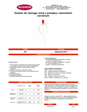 Zestaw do obciągu wina z pompką i zaworkiem zwrotnym SYMBOL KOD EAN WP 5904816016277 CHARAKTERYSTYKA Sposób użycia: 1. Przed użyciem zdezynfekować zestaw gorącą wodą lub roztworem pirosiarczynu potasu (symbol PIR). 2. Końcówkę wężyka z rurką sztywną umieścić w balonie. 3. Zakręcić zaworek na szczycie pompki. 4. Drugi koniec wężyka włożyć do ustawionego niżej naczynia. 5. Ścisnąć pompkę. 6. Rozciągnąć pompkę. 7. Odkręcić zaworek na szczycie pompki. Komplet składa się z: - prostej plastikowej rurki wlotowej o średnicy ok. 15 mm i długości 60 cm, - karbowanego węża spustowego o średnicy ok. 15 mm i długości 73 cm, - pompki z zaworkiem spustowym. Inne produkty z tej kategorii: WBG - Wężyk do obciągu wina WD - Zestaw wężyków do destylatora WE - Elektryczny zestaw do obciągu wina/piwa WS - Wężyk do sokownika WW - Wężyk do obciągu wina EKO WZG - Wężyk do obciągu wina z gruszką DANE LOGISTYCZNE Sztuka PRZEZNACZENIE szer/gł/wys [cm] Ilość sztuk waga [kg] 10x5x82 1 0.07 Zestaw służy do obciągu wina, piwa lub innych cieczy. Jego zaletą jest to, że pompowanie można w każdej chwili przerwać, a płyn przy zakręconym zaworku nie będzie się cofał w rurce, dzięki specjalnej zapadce umieszczonej pod pompką. INFORMACJE DODATKOWE Opakowanie jednostkowe 12x5x79 1 0.08 Opakowanie zbiorcze 18x73x11 10 1.10 Paleta Euro 120x80x170 900 99 Dostępne w ofercie wężyki PCV i zestawy plastikowe do obciągu wykonane są z tworzyw, które posiadają atesty do kontaktu z produktami spożywczymi zawierającymi alkohol. PKWiU VAT 22.21.29.0 23%