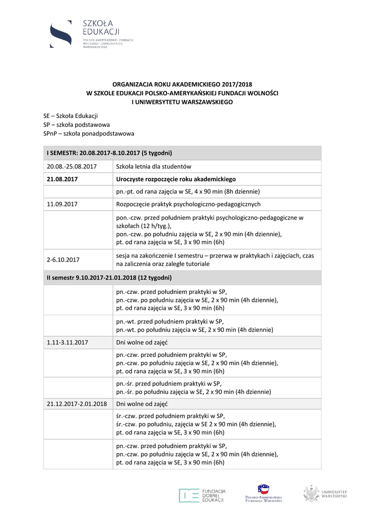 ORGANIZACJA ROKU AKADEMICKIEGO 2017/2018 W SZKOLE EDUKACJI POLSKO-AMERYKAŃSKIEJ FUNDACJI WOLNOŚCI I UNIWERSYTETU WARSZAWSKIEGO SE – Szkoła Edukacji SP – szkoła podstawowa SPnP – szkoła ponadpodstawowa I SEMESTR: 20.08.2017-8.10.2017 (5 tygodni) 20.08.-25.08.2017 Szkoła letnia dla studentów 21.08.2017 Uroczyste rozpoczęcie roku akademickiego pn.-pt. od rana zajęcia w SE, 4 x 90 min (8h dziennie) 11.09.2017 Rozpoczęcie praktyk psychologiczno-pedagogicznych pon.-czw. przed południem praktyki psychologiczno-pedagogiczne w szkołach (12 h/tyg.), pon.-czw. po południu zajęcia w SE, 2 x 90 min (4h dziennie), pt. od rana zajęcia w SE, 3 x 90 min (6h) 2-6.10.2017 sesja na zakończenie I semestru – przerwa w praktykach i zajęciach, czas na zaliczenia oraz zaległe tutoriale II semestr 9.10.2017-21.01.2018 (12 tygodni) pn.-czw. przed południem praktyki w SP, pn.-czw. po południu zajęcia w SE, 2 x 90 min (4h dziennie), pt. od rana zajęcia w SE, 3 x 90 min (6h) pn.-wt. przed południem praktyki w SP, pn.-wt. po południu zajęcia w SE, 2 x 90 min (4h dziennie) 1.11-3.11.2017 Dni wolne od zajęć pn.-czw. przed południem praktyki w SP, pn.-czw. po południu zajęcia w SE, 2 x 90 min (4h dziennie), pt. od rana zajęcia w SE, 3 x 90 min (6h) pn.-śr. przed południem praktyki w SP, pn.-śr. po południu zajęcia w SE, 2 x 90 min (4h dziennie) 21.12.2017-2.01.2018 Dni wolne od zajęć śr.-czw. przed południem praktyki w SP, śr.-czw. po południu, zajęcia w SE 2 x 90 min (4h dziennie), pt. od rana zajęcia w SE, 3 x 90 min (6h) pn.-czw. przed południem praktyki w SP, pn.-czw. po południu zajęcia w SE, 2 x 90 min (4h dziennie), pt. od rana zajęcia w SE, 3 x 90 min (6h) 15.01.-19.01.2018 sesja na zakończenie II semestru – przerwa w praktykach i zajęciach, czas na zaliczenia i zaległe tutoriale 22.01.-28.01.2018 Ferie zimowe, dno wolne od zajęć III semestr 29.01.2018-22.06.2018 (18 tygodni) pn.-czw. przed południem praktyki w SPnP, pn.-czw. po południu zajęcia w SE, 2 x 90 min (4h dziennie), pt. od rana zajęcia w SE, 3 x 90 min (6h) pn.-śr. przed południem praktyki w SPnP, pn.-śr. po południu zajęcia w SE, 2 x 90 min (4h dziennie) 29.03.-3.04.2018 Przerwa świąteczna śr.-czw. przed południem praktyki w SPnP, śr.-czw. po południu zajęcia w SE, 2 x 90 min (4h dziennie), pt. od rana zajęcia w SE, 3 x 90 min (6h) pn.-czw. przed południem praktyki w SPnP, pn.-czw. po południu zajęcia w SE, 2 x 90 min (4h dziennie), pt. od rana zajęcia w SE, 3 x 90 min (6h) 30.04.-4.05.2018 Dni wolne od zajęć pn.-czw. przed południem praktyki w SPnP, pn.-czw. po południu zajęcia w SE, 2 x 90 min (4h dziennie), pt. od rana zajęcia w SE, 3 x 90 min (6h) pn.-śr. przed południem praktyki w SPnP, pn.-śr. po południu zajęcia w SE, 2 x 90 min (4h dziennie), 31.05.-1.06.2018 Dni wolne od zajęć pn.-czw. przed południem praktyki w SPnP, pn.-czw. po południu zajęcia w SE, 2 x 90 min (4h dziennie), pt. od rana zajęcia w SE, 3 x 90 min (6h) sesja na zakończenie III semestru – koniec praktyk i zajęć, czas na zaliczenia i zaległe tutoriale 22.06.2018 Uroczyste prezentacje portfolio i wręczenie dyplomów