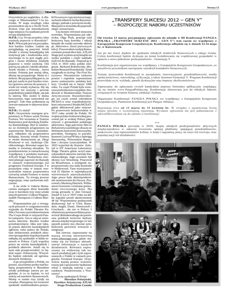 www.gazetagazeta.com Wielkanoc 2012 TEATR Oczywiście po angielsku. A dlaczego w Mississaudze? I tu nowinka. W maju zeszłego roku przeniosłem się tu z North York. Jestem więc już mieszkańcem tego miejsca i tu osadzam powoli swoją działalność. M.P.B.: Czy Twoje projekty i idee znalazły poparcie w Kanadzie? M.P.: Wiesz jak jest na początku. Jest bardzo trudno. Ludzie się przyglądają, są pasywni. Jeżeli chodzi o stronę kanadyjską tak instytucji jak i środowiska artystycznego to tu jest ciągły progres i nasze działania znalazły poparcie o wiele szybciej. Oni patrzą na jakość i skutki działań. Jeżeli chodzi o Polonię... bywa różnie. Polonia jest mniej ufna, dłużej się przypatruje. Może to i dobrze. Bo jej specyfiką jest to, że jak już zaufa to jest bardzo wierna i gotowa zawsze do pomocy. I wiele też wtedy wybacza. My się przecież też uczymy i pewnie popełniliśmy jakieś błędy, ale jak to mówią "Kto siedzi w domu bezczynnie, tego samochód nie potrąci". Tak więc potknięcia są zawsze wpisane w aktywne działania. M.P.B.: Co dalej? M.P.: Oczywiście następne prapremiery w Polsce sztuk Norma Fostera. We wrześniu w Teatrze Kamienica pod dyrekcją Emiliana Kamińskiego (był tu niedawno ze świetnym programem na zaproszenie Krzysia Jasińskiego), odbędzie się prapremiera kolejnej, trzeciej sztuki Fostera w moim tłumaczeniu pt. Długi Weekend w reż. Andrzeja Chichłowskiego. Również super komedia w świetnej obsadzie. To przedstawienie, w ramach naszej współpracy z polskimi teatrami, ATLAS Stage Productions również planuje zaprosić do Kanady w ramach wspomnianego już programu Terminal Europe. I w przyszłym roku w innym warszawskim teatrze prapremiera czwartej sztuki Fostera w moim tłumaczeniu. Tu trwają jeszcze negocjacje, więc zachowam milczenie. A na stole w trakcie tłumaczenia następne dwie komedie oraz w korekcie trzy inne sztuki innych autorów: Colleen Wagner, Judith Thompson i Colleen Murphy. Wspomniałem już o trwających pracach w zorganizowaniu wyjazdu do Polski Theatre PaNik z Toronto z przedstawieniem The Corps Bride w reżyserii Paula Lamperta. Gra w niej aż czternastu aktorów. Bardzo trudne przedsięwzięcie. Idea jest taka, że pięciu aktorów kanadyjskich (główne role) poleci do Polski, tam dobierzemy polskich aktorów i po tygodniu wspólnych prób odbędą się spektakle w kilku teatrach w Polsce. Czyli wspólna praca na scenie kanadyjskich i polskich aktorów. Jeżeli się to nam uda przeprowadzić, to będzie super. Zobaczymy. Wszystko będzie zależało od zgromadzonych funduszy. A po przyjeździe z Polski, na jesieni, zaczniemy próby nad kolejną prapremierą w Kanadzie sztuki polskiego autora po angielsku. A co to będzie, to też zależy od zasobów finansowych. Mamy w sumie trzy tytuły na uwadze. Planujemy też wznowić spektakl multimedialno-poetyc- ki Na samym rogu tej starej mapy, na bazie tekstów Jacka Kaczmarskiego, jednak z pewnymi modyfikacjami w stosunku do poprzedniego scenariusza. I na koniec również smaczna nowinka. Wspomniana już edytorka, Olga Ptak, pracuje nad końcową fazą korekty i edycji książki do nauki zawodu aktora pt. Aktorstwo. Sześć pierwszych lekcji. Pracowałem nad jej tłumaczeniem ponad dwa lata. ATLAS Stage jest wydawcą tej książki na rynku polskim i część nakładu trafi też do Kanady. Napisał ją w USA w 1933 roku polski emigrant, Richard Boleslavsky (Bolesław Ryszard Śrzednicki). Tytuł oryginału to Acting. The First Six Lessons. Niezmiernie ciekawa postać i zupełnie zapomniana przez animatorów polskiej kultury. Urodził się w lutym 1889 roku. Ta część Polski była wówczas pod zaborem rosyjskim. Studiował w Moskiewskim Teatrze Artystycznym Stanisławskiego, po czym został członkiem MChAT-u oraz współzałożycielem i reżyserem I Studia MChAT, gdzie debiutował jako reżyser. Po przewrocie bolszewickim w 1917 roku uciekł do Polski. Po wojnie polsko-bolszewickiej pracował już w wolnej Polsce jako reżyser z gwiazdami polskiego aktorstwa. Jego pierwszy film to Bohaterstwo polskiego skauta ze Stefanem Jaraczem i Junoszą Stępowskim. Następny to paradokument Cud nad Wisłą z Jadwigą Smosarską, Wincentym Rapackim i Jerzym Leszczyńskim. W 1923 wyjechał do Stanów. Założył w NY American Laboratory Stage Theatre gdzie uczył amerykańskich aktorów metody Stanisławskiego. Jego uczniem był słynny Lee Strasberg. Pracował na Broadwayu, a następnie zaproponowano mu stały kontrakt w Hollywood. Tam wyreżyserował 21 filmów w największych wytwórniach amerykańskich. Jego prace były dziesięciokrotnie nominowane do Oscara. Pracował z Marleną Dietrich, Williamem Greenem i wieloma gwiazdami ówczesnego kina. Ma swoją gwiazdę w Alei Gwiazd. Zmarł w LA w 1937 roku na kilka tygodni przed ukończeniem 48 lat. Wspomniany podręcznik drukowany był w USA, Kanadzie, Anglii, Danii, Niemczech i Czechach... ale nie w Polsce. I właśnie my postanowiliśmy przywrócić Bolesławskiego do panteonu polskich twórców kultury okresu międzywojennego i w ten sposób pomóc mu chociaż symbolicznie powrócić wreszcie z emigracji. Jak zawsze, zapraszamy na naszą stronę internetową www.atlasstage.com, gdzie staramy się na bieżąco aktualizować informacje o naszych działaniach. Również zapraszamy na widownię tak naszych produkcji jak i tych zapraszanych z Polski w ramach programu Terminal Europe. Oczywiście każdą pomoc wolontariuszy jak i sponsorów będziemy witać z niemałą euforią i szacunkiem. Pozdrowienia z Warszawy! Życzę spokojnych Świąt Mirosław Połatyński, Dyrektor Artystyczny ATLAS Stage Productions Canada Strona 11