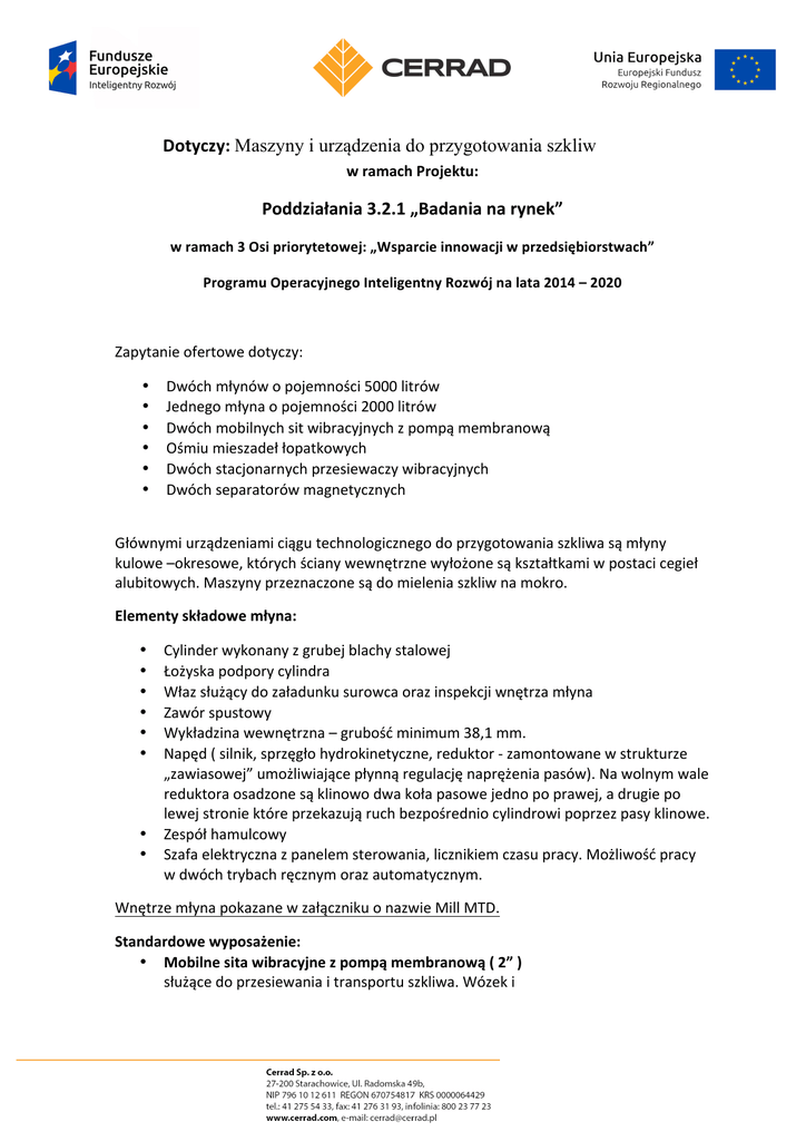 Dotyczy:Maszyny i urządzenia do przygotowania szkliw wramachProjektu: Poddziałania3.2.1„Badanianarynek” wramach3Osipriorytetowej:„Wsparcieinnowacjiwprzedsiębiorstwach” ProgramuOperacyjnegoInteligentnyRozwójnalata2014–2020 Zapytanieofertowedotyczy: • • • • • • Dwóchmłynówopojemności5000litrów Jednegomłynaopojemności2000litrów Dwóchmobilnychsitwibracyjnychzpompąmembranową Ośmiumieszadełłopatkowych Dwóchstacjonarnychprzesiewaczywibracyjnych Dwóchseparatorówmagnetycznych Głównymiurządzeniamiciągutechnologicznegodoprzygotowaniaszkliwasąmłyny kulowe–okresowe,którychścianywewnętrznewyłożonesąkształtkamiwpostacicegieł alubitowych.Maszynyprzeznaczonesądomieleniaszkliwnamokro. Elementyskładowemłyna: • • • • • • • • Cylinderwykonanyzgrubejblachystalowej Łożyskapodporycylindra Włazsłużącydozaładunkusurowcaorazinspekcjiwnętrzamłyna Zawórspustowy Wykładzinawewnętrzna–grubośćminimum38,1mm. Napęd(silnik,sprzęgłohydrokinetyczne,reduktor-zamontowanewstrukturze „zawiasowej”umożliwiającepłynnąregulacjęnaprężeniapasów). Nawolnymwale reduktoraosadzonesąklinowodwakołapasowejednopoprawej,adrugiepo lewejstroniektóreprzekazująruchbezpośredniocylindrowipoprzezpasyklinowe. Zespółhamulcowy Szafaelektrycznazpanelemsterowania,licznikiemczasupracy.Możliwośćpracy wdwóchtrybachręcznymorazautomatycznym. WnętrzemłynapokazanewzałącznikuonazwieMillMTD. Standardowewyposażenie: • Mobilnesitawibracyjnezpompąmembranową(2”) służącedoprzesiewaniaitransportuszkliwa.Wózeki konstrukcjazestalinierdzewnej,regulatorciśnieniadla napędupompy. • Mieszadłałopatkowewskładniesilnikzreduktorem, mieszadłołopatkowewykonanezestalinierdzewnej, Prędkośćmieszadła16obr/min. Moczainstalowana3kW Szafasterownicza Rozstaw mocowań mieszadła w pliku o nazwie BLADE STIRRER • Przesiewaczewibracyjnestacjonarneośrednicy900mm. Zestalinierdzewnej. • Separatorymagnetycznezmagnesamitrwałymi Wartośćpolamagnetycznegonaprętach(12.000Gauss). • Środkimielące: KORUNDparametrytechniczne: -gęstość -zawartośćtlenkuglinu -twardośćMohsa -pochłanianiewody -głębokaodpornośćnaścieraniemierzonaścieralnościomierzem Tabera 3.6 92 9 <0,1 <13 kg/dm³ % % mm³ Ilośćśrodkówmielących: Młynopojemności2000litrów: Ilośćmielnikaw(kg) 500 500 500 500 Wymiarmielnikaw(calach) 1¾” 1½” 1¼” 1” Młynopojemności5000litrów: Ilośćmielnikaw(kg) 1000 900 900 Wymiarmielnikaw(calach) 2” 1¾” 1½” 900 900 1¼” 1” Informacjeoczekiwaneoddostawcy:zapotrzebowanienamocelektryczną,konsumpcja, ciśnieniesprężonegopowietrza. Maszynywyposażonesąwelektryczneimechaniczneurządzeniazabezpieczające,które sąwstaniezabezpieczyćpracownikóworazsamourządzenie. Instrukcje,dokumentacjatechniczna,wykazczęścizamiennychwjęzykupolskim. Transport-pakowanieodpowiedniedlatransportudrogowego. ALUMINAGRINDINGMEDIAtechnicalrequirements -specificweight 3.6 kg/dm³ -aluminacontent 92 % -Mohs'hardness 9 -waterabsorption <0,1 % -deepabrasionresistance,measuredwithTaberabrasiontester <13 mm³