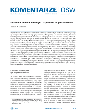 Ośrodek Studiów Wschodnich im. Marka Karpia NUMER 210 | 22.04.2016 www.osw.waw.pl Ukraina w cieniu Czarnobyla. Trzydzieści lat po katastrofie Tadeusz A. Olszański Trzydzieści lat po wybuchu w elektrowni jądrowej w Czarnobylu skutki tej katastrofy wciąż są trwałym elementem sytuacji gospodarczej, ekologicznej i społecznej Ukrainy, Białorusi i niektórych regionów Rosji. Na Ukrainie, do której ogranicza się ten tekst, wstrząs był najsilniejszy, między innymi dlatego, że do katastrofy doszło w elektrowni oddalonej o około 100 km od Kijowa. Jej następstwa wywarły wpływ na rozwój sytuacji politycznej, stały się też istotnym elementem przekształcającej się już w niepodległym państwie tożsamości narodowej. Ukraina poniosła ogromne koszty związane z usuwaniem skutków katastrofy, nie zrezygnowała jednak z energetyki jądrowej, która generuje dziś ponad połowę krajowej produkcji energii elektrycznej. Zapoczątkowany jeszcze przez władze sowieckie system ulg socjalnych dla osób uznanych za poszkodowane po katastrofie stał się ogromnym obciążeniem dla budżetu – koszty jego pełnej realizacji wynosiłyby kilkanaście procent budżetu państwa, nie jest więc on realizowany w całości. System ten umacnia w społeczeństwie poczucie bezradności i zależności od państwa. Katastrofa wpisała się w martyrologiczny schemat ukraińskiego mitu narodowego i umocniła go. Skutki techniczno-ekologiczne katastrofy, a więc też jej koszty gospodarcze trwać będą jeszcze przez stulecia, a skutki socjalne wygasną wraz z pokoleniem poszkodowanych. Czarnobyl więc jeszcze długo pozostanie ważną składową życia Ukrainy, zarówno państwa, jak i społeczeństwa. Katastrofa czarnobylska i jej bezpośrednie skutki 26 kwietnia 1986 roku w IV bloku Czarnobylskiej Elektrowni Atomowej doszło do wybuchu o charakterze reakcji chemicznej, który zapoczątkował największą dotychczas katastrofę w historii energetyki jądrowej i jedną z największych katastrof technogennych w dziejach1. Przyczyną awarii było nieodpowiedzialne działanie obsługi, a także rozwiązania konstrukcyjne reaktora typu RBMK, czyniące taki właśnie wybuch możliwym. W efekcie wybuchu i trwają Największą katastrofą tego rodzaju było dotychczas zawalenie się zapory wodnej Banqiao (Chiny, 1975), które przyniosło śmierć 171 tys. ludzi, a pozbawiło dachu nad głową ok. 11 mln. 1 cego dziesięć dni pożaru doszło do silnego skażenia promieniotwórczego ok. 150 tys. km2 na terytorium Związku Sowieckiego (w granicach Ukrainy 54 tys. km2), a niewielkiego i przejściowego – niemal całej kuli ziemskiej. Bezpośrednio podczas katastrofy zginęły dwie osoby, podczas akcji ratunkowej na ciężką chorobę popromienną zapadły 134 osoby (z ok. dwustu tysięcy biorących w niej udział), z których 28 zmarło w ciągu kilku tygodni. Ze strefy skażonej po kilku dniach wysiedlono ok. 120 tys. osób (w tym na Ukrainie 91 tys.), a do roku 2000 dalszych 230 tys. (w tym na Ukrainie 72 tys.); liczba wysiedlonych była stosunkowo niewielka, gdyż skażenie dotknęło terenów słabo zurbanizowanych. Nad IV blokiem w 1986 roku wzniesiono budowlę ochronną, zwaną Sarkofagiem, mającą KOMENTARZE OSW NUMER 210 1 uniemożliwić dalszą emisję izotopów promieniotwórczych, a jednocześnie zapewnić stały monitoring sytuacji w zrujnowanym reaktorze, gdzie zachodziły procesy dotychczas nieznane nauce. Budowla ta miała z konieczności charakter eksperymentalny i okazała się niewystarczająca. Od 2012 roku trwa budowa nowej osłony, finansowanej w dużej mierze z pomocy UE. Jej ukończenie, planowane na koniec 2016 roku umożliwi stopniowy demontaż ruin i bezpieczne składowanie znajdujących się w nich materiałów rozszczepialnych. Mimo katastrofy elektrownia pracowała dalej. W 1991 roku wyłączono z eksploatacji jej II blok, w 1996 – I, wreszcie w 2000 – pod silną presją międzynarodową – III, bezpośrednio sąsiadujący z Sarkofagiem. Zwolennicy rozwoju energetyki jądrowej są skłonni bagatelizować negatywne konsekwencje katastrofy czarnobylskiej, przeciwnicy – wyolbrzymiać je, nierzadko do absurdu. Nie oznaczało to jednak zakończenia ich funkcjonowania, a tylko przerwanie produkcji energii elektrycznej. Sukcesywne usuwanie z tych bloków paliwa jądrowego zostanie zakończone w 2016 roku, a nadanie mu formy, pozwalającej na stabilne przechowywanie przez tysiąclecia zajmie jeszcze wiele lat (terminy nie mogą być przyspieszone, zależą bowiem od zachodzących w prętach paliwowych przemian fizycznych). Obecnie w elektrowni pracuje 2,5 tys. osób, w całej liczącej ok. 2,6 tys. km2 strefie izolacji kilkadziesiąt tysięcy2. W ciągu trzydziestu lat po katastrofie stopień skażenia większości obszarów dotkniętych katastrofą znacząco spadł w wyniku rozpadu izotopów promieniotwórczych. Obecnie skutki katastrofy ograniczone są do obszaru bezpośrednio otaczającego elektrownię oraz bardzo trudnych do wykrycia „gorących punktów” (miejsc, gdzie nastąpiła koncentracja opadu izotopów promieniotwórczych, na ogół w wyniku opadów deszczu w dniach katastrofy; takie punkty wykrywano także daleko poza obszarem objętym stałą kontrolą). Na większości obszaru strefy izolacji, w tym w mieście Czarnobyl poziom promieniowania był w 2008 roku wyraźnie niższy niż w centrum Warszawy3. Od roku 2002 organizowane są wycieczki turystyczne do strefy izolacji, w tym do samej elektrowni, a w Czarnobylu od kilku lat działa hotel. Przyczyny i konsekwencje katastrofy czarnobylskiej są wciąż przedmiotem sporów, ściśle związanych ze sporem o przyszłość energetyki jądrowej. Zwolennicy jej rozwoju są skłonni bagatelizować negatywne konsekwencje katastrofy, przeciwnicy – wyolbrzymiać je, nierzadko do absurdu. Niekiedy w grę wchodzi też niekompetencja dziennikarzy (np. co kilka– –kilkanaście lat pojawiają się głosy, że w Czar