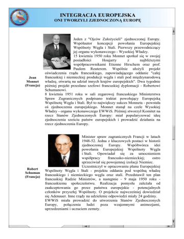 INTEGRACJA EUROPEJSKA ONI TWORZYLI ZJEDNOCZONĄ EUROPĘ Jean Monnet (Francja) Jeden z "Ojców Założycieli" zjednoczonej Europy. Współautor koncepcji powołania Europejskiej Wspólnoty Węgla i Stali. Pierwszy przewodniczący jej organu wykonawczego - Wysokiej Władzy. 15 kwietnia 1950 roku Monnet spotkał się w swojej posiadłości Houjarry z najbliższymi współpracownikami Etienne Hirschem oraz prof. Paulem Reuterem. Wspólnie ułożyli projekt oświadczenia rządu francuskiego, zapowiadającego oddanie "całej francuskiej i niemieckiej produkcji węgla i stali pod międzynarodową władzę, otwartą na udział innych krajów europejskich". Dwa tygodnie później projekt przesłano szefowi francuskiej dyplomacji - Robertowi Schumanowi. 8 kwietnia 1951 roku w sali zegarowej francuskiego Ministerstwa Spraw Zagranicznych podpisano traktat powołujący Europejską Wspólnotę Węgla i Stali. Był to największy sukces Monneta - powstała oś zjednoczenia europejskiego. Monnet stanął na czele Wysokiej Władzy - organu wykonawczego EWWiS. Później stworzył Komitet na rzecz Stanów Zjednoczonych Europy: miał popularyzować ideę zjednoczenia sześciu państw europejskich i prowadzić działania na rzecz zjednoczenia Europy. Robert Schuman (Francja) Minister spraw zagranicznych Francji w latach 1948-52. Jedna z kluczowych postaci w historii zjednoczonej Europy. Współtwórca idei powołania Europejskiej Wspólnoty Węgla i Stali. Opowiadał się za umocnieniem współpracy francusko-niemieckiej; ostro sprzeciwiał się powojennej izolacji Niemiec. Uczestniczył w opracowaniu planu Europejskiej Wspólnoty Węgla i Stali - projektu oddania pod wspólną władzę francuskiego i niemieckiego węgla oraz stali. Przedstawił ten plan francuskiej Radzie Ministrów, a następnie - 9 maja 1950 roku francuskiemu społeczeństwu. Realizacja pomysłu zależała od zaakceptowania go przez państwa europejskie - potencjalnych członków przyszłej Wspólnoty. O projekcie najwcześniej dowiedział się Adenauer. Inne rządy na udzielenie odpowiedzi miały 24 godziny. EWWiS miała prowadzić do utworzenia Stanów Zjednoczonych Europy, połączenia ludzi poza wzajemnymi animozjami, uprzedzeniami i uczuciem zemsty. INTEGRACJA EUROPEJSKA ONI TWORZYLI ZJEDNOCZONĄ EUROPĘ Pierwszy kanclerz Niemiec po wojnie. Współtwórca idei zjednoczonej Europy, wielki rzecznik powojennego pojednania Niemiec i Francji. Był jednym ze współzałożycieli CDU w brytyjskiej strefie okupacyjnej, a po zwycięstwie chadecji w wyborach parlamentarnych w 1949 roku został pierwszym kanclerzem RFN. Miał wówczas 72 lata. Konrad Adenauer (Niemcy) Projekty integracji europejskiej Adenauer snuł już od roku 1919. Proponował wówczas oddanie wojskowo-przemysłowego potencjału państw niemieckich pod zarząd wspólnej Rady. Sądził, że gwarancją pokoju w Europie jest pojednanie francusko-niemieckie. Zjednoczona Europa - zdaniem Adenauera - stanowiła gwarancję powstrzymania zwycięskich potęg przed nowym sojuszem, dając szansę przyjęcia Niemiec do wolnego świata. Stąd udział Adenauera w pracach nad powołaniem EWWiS i zawarcie Paktu Elizejskiego z Francją. W 1963 roku Adenauer wycofał się z czynnego życia politycznego. Premier Wielkiej Brytanii w czasie drugiej wojny światowej, jeden z liderów koalicji antyhitlerowskiej. W czasie słynnego przemówienia w 1946 roku mówiąc o powojennym podziale kontynentu jako pierwszy użył terminu "Żelazna kurtyna". Wzywał do powołania Stanów Zjednoczonych Europy. Winston Churchill (Wielka Brytania) Po wybuchu II wojny światowej został ministrem marynarki wojennej, a 10 maja 1940 roku stanął na czele ponadpartyjnego rządu. Był współtwórcą koalicji Wielkiej Brytanii z USA i ze Związkiem Radzieckim. Uczestniczył w konferencjach Wielkiej Trójki w Teheranie, Jałcie i Poczdamie. Pomimo sukcesów Churchilla na arenie międzynarodowej jego partia przegrała powojenne wybory parlamentarne. Ponownie został premierem pod koniec 1951 roku, ale w cztery lata później zrezygnował z urzędu ze względów zdrowotnych. W 1953 roku otrzymał literacką Nagrodę Nobla za liczne eseje historyczne, a przede wszystkim za 12-tomowe pamiętniki. INTEGRACJA EUROPEJSKA ONI TWORZYLI ZJEDNOCZONĄ EUROPĘ Charles de Gaulle (Francja) Prezydent Francji w latach 1959-69. Francuski bohater narodowy, zwolennik Europy ojczyzn i ograniczania roli Stanów Zjednoczonych na kontynencie. W zamyśle de Gaulle'a Europa miała być mediatorem między Wschodem a Zachodem. Generał był zwolennikiem Europy ojczyzn, Europy od Atlantyku po Ural. Ostro sprzeciwiał się przystąpieniu Wielkiej Brytanii do EWG i ingerencji Amerykanów w sprawy europejskie. Brytyjczyków uważał za "amerykańskiego konia trojańskiego". Wielokrotnie podkreślał wyspiarskie położenie Wielkiej Brytanii i jej brak zainteresowania problemami Starego Kontynentu. Zwolennik niezależności Francji, wycofał francuską armię ze struktur wojskowych NATO. Paul Henri Spaak (Belgia) Premier Belgii, przewodniczący Zgromadzenia EWWiS, Sekretarz Generalny NATO. Współtwórca Europejskiej Wspólnoty Węgla i Stali. Starał się stworzyć nową Belgijską Partię Socjalistyczną na wzór brytyjskiej Labour Party. W latach czterdziestych współuczestniczył w opracowaniu Unii Celnej Beneluksu (weszła w życie w 1948 roku). Spaak doprowadził Belgię do Paktu Północnoatlantyckiego. Uczestniczył w pierwszych próbach integracji europejskiej i podpisania EWWiS. W latach 1952-54 był przewodniczącym Zgromadzenia EWWiS. Później przewodniczył komitetowi, powołanemu w Messynie do opracowania planu Europejskiego Wspólnego Rynku. Brał udział w dyskusjach nad kształtem Traktatów Rzymskich. W 1957 roku został sekretarzem generalnym NATO (siedziba mieściła się wówczas w Paryżu). Na przełomie lat sześćdziesiątych i siedemdziesiątych popierał Alcide de Gasperi (Włochy) Premier Włoch w latach 1945-53, współau