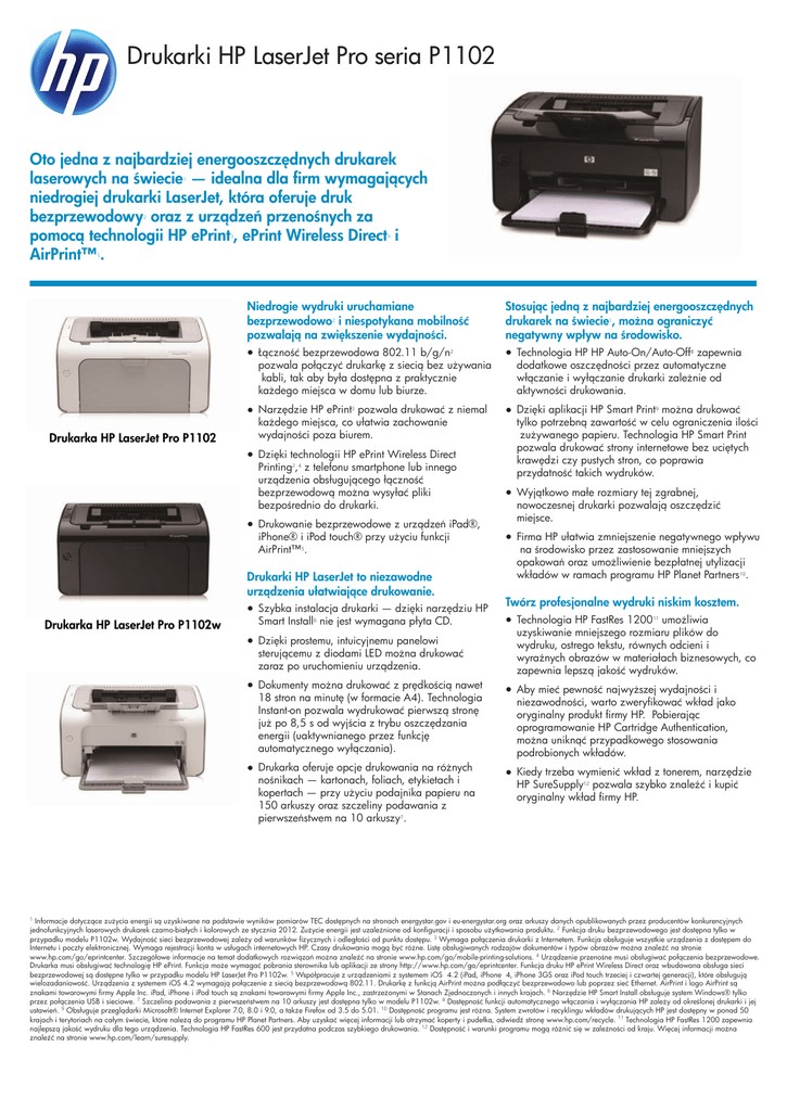 Drukarki HP LaserJet Pro seria P1102 Oto jedna z najbardziej energooszczędnych drukarek laserowych na świecie — idealna dla firm wymagających niedrogiej drukarki LaserJet, która oferuje druk bezprzewodowy oraz z urządzeń przenośnych za pomocą technologii HP ePrint , ePrint Wireless Direct i AirPrint™ . 1 2 3 4 5 Drukarka HP LaserJet Pro P1102 Niedrogie wydruki uruchamiane bezprzewodowo2 i niespotykana mobilność pozwalają na zwiększenie wydajności. Stosując jedną z najbardziej energooszczędnych drukarek na świecie1, można ograniczyć negatywny wpływ na środowisko. ● Łączność bezprzewodowa 802.11 b/g/n2 pozwala połączyć drukarkę z siecią bez używania kabli, tak aby była dostępna z praktycznie każdego miejsca w domu lub biurze. ● Technologia HP HP Auto-On/Auto-Off8 zapewnia dodatkowe oszczędności przez automatyczne włączanie i wyłączanie drukarki zależnie od aktywności drukowania. ● Narzędzie HP ePrint3 pozwala drukować z niemal każdego miejsca, co ułatwia zachowanie wydajności poza biurem. ● Dzięki aplikacji HP Smart Print9 można drukować tylko potrzebną zawartość w celu ograniczenia ilości zużywanego papieru. Technologia HP Smart Print pozwala drukować strony internetowe bez uciętych krawędzi czy pustych stron, co poprawia przydatność takich wydruków. ● Dzięki technologii HP ePrint Wireless Direct Printing2,4 z telefonu smartphone lub innego urządzenia obsługującego łączność bezprzewodową można wysyłać pliki bezpośrednio do drukarki. ● Drukowanie bezprzewodowe z urządzeń iPad®, iPhone® i iPod touch® przy użyciu funkcji AirPrint™5. Drukarki HP LaserJet to niezawodne urządzenia ułatwiające drukowanie. Drukarka HP LaserJet Pro P1102w 1 ● Szybka instalacja drukarki — dzięki narzędziu HP Smart Install6 nie jest wymagana płyta CD. ● Wyjątkowo małe rozmiary tej zgrabnej, nowoczesnej drukarki pozwalają oszczędzić miejsce. ● Firma HP ułatwia zmniejszenie negatywnego wpływu na środowisko przez zastosowanie mniejszych opakowań oraz umożliwienie bezpłatnej utylizacji wkładów w ramach programu HP Planet Partners10. Twórz profesjonalne wydruki niskim kosztem. ● Dzięki prostemu, intuicyjnemu panelowi sterującemu z diodami LED można drukować zaraz po uruchomieniu urządzenia. ● Technologia HP FastRes 120011 umożliwia uzyskiwanie mniejszego rozmiaru plików do wydruku, ostrego tekstu, równych odcieni i wyraźnych obrazów w materiałach biznesowych, co zapewnia lepszą jakość wydruków. ● Dokumenty można drukować z prędkością nawet 18 stron na minutę (w formacie A4). Technologia Instant-on pozwala wydrukować pierwszą stronę już po 8,5 s od wyjścia z trybu oszczędzania energii (uaktywnianego przez funkcję automatycznego wyłączania). ● Aby mieć pewność najwyższej wydajności i niezawodności, warto zweryfikować wkład jako oryginalny produkt firmy HP. Pobierając oprogramowanie HP Cartridge Authentication, można uniknąć przypadkowego stosowania podrobionych wkładów. ● Drukarka oferuje opcje drukowania na różnych nośnikach — kartonach, foliach, etykietach i kopertach — przy użyciu podajnika papieru na 150 arkuszy oraz szczeliny podawania z pierwszeństwem na 10 arkuszy7. ● Kiedy trzeba wymienić wkład z tonerem, narzędzie HP SureSupply12 pozwala szybko znaleźć i kupić oryginalny wkład firmy HP. Informacje dotyczące zużycia energii są uzyskiwane na podstawie wyników pomiarów TEC dostępnych na stronach energystar.gov i eu-energystar.org oraz arkuszy danych opublikowanych przez producentów konkurencyjnych jednofunkcyjnych laserowych drukarek czarno-białych i kolorowych ze stycznia 2012. Zużycie energii jest uzależnione od konfiguracji i sposobu użytkowania produktu. 2 Funkcja druku bezprzewodowego jest dostępna tylko w przypadku modelu P1102w. Wydajność sieci bezprzewodowej zależy od warunków fizycznych i odległości od punktu dostępu. 3 Wymaga połączenia drukarki z Internetem. Funkcja obsługuje wszystkie urządzenia z dostępem do Internetu i poczty elektronicznej. Wymaga rejestracji konta w usługach internetowych HP. Czasy drukowania mogą być różne. Listę obsługiwanych rodzajów dokumentów i typów obrazów można znaleźć na stronie www.hp.com/go/eprintcenter. Szczegółowe informacje na temat dodatkowych rozwiązań można znaleźć na stronie www.hp.com/go/mobile-printing-solutions. 4 Urządzenie przenośne musi obsługiwać połączenia bezprzewodowe. Drukarka musi obsługiwać technologię HP ePrint. Funkcja może wymagać pobrania sterownika lub aplikacji ze strony http://www.hp.com/go/eprintcenter. Funkcja druku HP ePrint Wireless Direct oraz wbudowana obsługa sieci bezprzewodowej są dostępne tylko w przypadku modelu HP LaserJet Pro P1102w. 5 Współpracuje z urządzeniami z systemem iOS 4.2 (iPad, iPhone 4, iPhone 3GS oraz iPod touch trzeciej i czwartej generacji), które obsługują wielozadaniowość. Urządzenia z systemem iOS 4.2 wymagają połączenie z siecią bezprzewodową 802.11. Drukarkę z funkcją AirPrint można podłączyć bezprzewodowo lub poprzez sieć Ethernet. AirPrint i logo AirPrint są znakami towarowymi firmy Apple Inc. iPad, iPhone i iPod touch są znakami towarowymi firmy Apple Inc., zastrzeżonymi w Stanach Zjednoczonych i innych krajach. 6 Narzędzie HP Smart Install obsługuje system Windows® tylko przez połączenia USB i sieciowe. 7 Szczelina podawania z pierwszeństwem na 10 arkuszy jest dostępna tylko w modelu P1102w. 8 Dostępność funkcji automatycznego włączania i wyłączania HP zależy od określonej drukarki i jej ustawień. 9 Obsługuje przeglądarki Microsoft® Internet Explorer 7.0, 8.0 i 9.0, a także Firefox od 3.5 do 5.01. 10 Dostępność programu jest różna. System zwrotów i recyklingu wkładów drukujących HP jest dostępny w ponad 50 krajach i terytoriach na całym świecie, które należą do programu HP Planet Partners. Aby uzyska