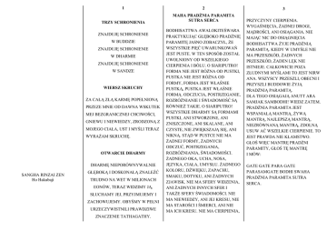 1 2 TRZY SCHRONIENIA MAHA PRADŻNIA PARAMITA SUTRA SERCA ZNAJDUJĘ SCHRONIENIE W BUDDZIE ZNAJDUJĘ SCHRONIENIE W DHARMIE ZNAJDUJĘ SCHRONIENIE W SANDZE WIERSZ SKRUCHY ZA CAŁĄ ZŁĄ KARMĘ POPEŁNIONĄ PRZEZE MNIE OD DAWNA WSKUTEK MEJ BEZGRANICZNEJ CHCIWOŚCI, GNIEWU I NIEWIEDZY, ZRODZONĄ Z MOJEGO CIAŁA, UST I MYŚLI TERAZ WYRAŻAM SKRUCHĘ. OTWARCIE DHARMY DHARMĘ NIEPORÓWNYWALNIE SANGHA RINZAI ZEN Ho Hakubaji GŁĘBOKĄ I DOSKONAŁĄ ZNALEŹĆ TRUDNO NA WET W MILIONACH EONÓW, TERAZ WIDZIMY JĄ, SŁUCHAMY JEJ, PRZYJMUJEMY I ZACHOWUJEMY. OBYŚMY W PEŁNI URZECZYWISTNILI PRAWDZIWE ZNACZENIE TATHAGATHY. BODHISATTWA AWALOKITEŚWARA PRAKTYKUJĄC GŁĘBOKO PRADŻNIĘ PARAMITĘ JASNO ZOBACZYŁ, ŻE WSZYSTKIE PIĘĆ UWARUNKOWAŃ JEST PUSTE. W TEN SPOSÓB ZOSTAŁ UWOLNIONY OD WSZELKIEGO CIERPIENIA I BÓLU. O SIARIPUTRO! FORMA NIE JEST RÓŻNA OD PUSTKI, PUSTKA NIE JEST RÓŻNA OD FORMY, FORMA JEST WŁAŚNIE PUSTKĄ, PUSTKA JEST WŁAŚNIE FORMĄ. ODCZUCIA, POSTRZEGANIE, ROZRÓŻNIANIE I ŚWIADOMOŚĆ SĄ RÓWNIEŻ TAKIE. O SIARIPUTRO! WSZYSTKIE DHARMY SĄ FORMAMI PUSTKI, ANI STWORZONE, ANI ZNISZCZONE, ANI SKALANE, ANI CZYSTE, NIE ZWIĘKSZAJĄ SIĘ, ANI NIKNĄ. STĄD W PUSTCE NIE MA ŻADNEJ FORMY, ŻADNYCH ODCZUĆ, POSTRZEGANIA, ROZRÓŻNIANIA, ŚWIADOMOŚCI. ŻADNEGO OKA, UCHA, NOSA, JĘZYKA, CIAŁA, UMYSŁU. ŻADNEGO KOLORU, DŹWIĘKU, ZAPACHU, SMAKU, DOTYKU, ANI ŻADNYCH ZJAWISK. NIE MA SFERY WIDZENIA, ANI ŻADNYCH INNYCH SFER I TAKŻE SFERY ŚWIADOMOŚCI. NIE MA NIEWIEDZY, ANI JEJ KRESU, NIE MA STAROŚCI I ŚMIERCI, ANI NIE MA ICH KRESU. NIE MA CIERPIENIA, 3 PRZYCZYNY CIERPIENIA. WYGAŚNIĘCIA, ŻADNEJ DROGI, MĄDROŚCI, ANI OSIĄGANIA. NIE MAJĄC NIC DO OSIĄGNIĘCIA BODHISATTWA ŻYJE PRADŻNIĄ PARAMITĄ. KIEDY W UMYŚLE NIE MA PRZESZKÓD, ŻADNYCH PRZESZKÓD, ŻADEN LĘK NIE ISTNIEJE. CAŁKOWICIE POZA ZŁUDNYMI MYŚLAMI TO JEST NIRW ANA. WSZYSCY PRZESZLI, OBECNI I PRZYSZLI BUDDOWIE ŻYJĄ PRADŻNIĄ PARAMITĄ. DLA TEGO OSIĄGAJĄ ANUTT ARA SAMJAK SAMBODHI! WIEDZ ZATEM. PRADŻNIA PARAMITA JEST WSPANIAŁĄ MANTRĄ, ŻYWĄ MANTRĄ, NAJLEPSZĄ MANTRĄ, NIEZRÓWNANĄ MANTRĄ, ZDOLNĄ USUW AĆ WSZELKIE CIERPIENIE. TO JEST PRAWDA NIE KŁAMSTWO. GŁOŚ WIĘC MANTRĘ PRADŻNI PARAMITY, GŁOŚ TĘ MANTRĘ I MÓW: GATE GATE PARA GATE PARASAMGATE BODHI SWAHA PRADŻNIA PARAMITA SUTRA SERCA. 4 MAKA HANJA HARAM IT A SINGJO KANDZIDZAI BOSA GJODZIN HANJA HARAMITA DZI SIOKEN GO ON KAIKU DO ISSAI KU JAKU SIARI SI SIKI FU I KU KU FU I SIKI SIKI SOKU DZE KU KU SOKU DZE SIKI DZIU SO GJO SIKI JAKU BU NJO DZE SIA RI SI DZE SIO HO KU SO FU SIO FU METSU FU KU FU DZIO FU DZO FU GEN DZE KO KU CIU MU SIKI MU DZIU SO GJO SIKI MU GEN NI BI DZES SIN NI MU SIKI SIO KO MI SOKU HO MU GEN KAI NAI SI MU I SIKI KAI MU MU MJO JAKU MU MU MJO DZIN NAI SI MU RO SI JAKU MU RO SI OZ IN MU KU SIU METSU DO MU CI JAKU MU TOKU I MU SIO TOKKO BODAISATTA E HANNJA HARA MIT A KO SIN MU KE GE MU KE GE KO MU U KU FU ON RI IS SAI TEN DO MU SO KUGJO NEHAN SANDZE SIO BUTSU E HANJA HARAMITA KO TOKU ANOKU TARA SAMMJAKU SAMBODAI KO CI HANN JA HARAMITA DZE DAI DZIN SIU DZE DAI MJO SIU DZE MU DZIO SIU DZE MU TO TO SIU NO DZIO ISSAI KU SIN DZITSU FU KO KO SETSU HANJA HARAMITA SIU SOKU SETSU SIU ŁA TSU GIA TEI GJA TEI HA RA GJA TEI HARA SO GJA TEI BODZI SOŁAKA HANNJA SINGJO. 5 6 SIO SAI SIU Dharani Usuwająca Nieszczęścia JEDNOŚĆ WZG LĘDNEGO I ABSOLUTNEGO NAMU SAMANDA MOTO NAN OHARA CI KOTO SIA SONO NAN TODZI TOEN GJA GJA GJA KI GJA KI UN NUN SIFURA SIFURA HARA SIFURA HARA SIFURA CISIU SA CISIU SA SIUSI RI SIUSI RI SOHA DZIA SOHA DZIA SECI GJA SIRI EI SOMOKO UMYSŁ WIELKIEGO MĘDRCA INDII DOGŁĘBNIE PRZEKAZANO OD ZACHODU PO WSCHÓD. POŚRÓD LUDZKICH ISTOT SĄ MĘDRCY I GŁUPCY, ALE NA DRODZE NIE MA PATRIARCHY PÓŁNOCY ANI POŁUDNIA. DOSKONAŁE ŹRÓDŁO JEST CZYSTE I JASNE, ZASILAJĄCE STRUMIENIE PŁYNĄ PRZEZ CIEMNOŚĆ. PRZYWIĄZANIE DO RZECZY JEST ILUZJĄ. SPOTKANIE ABSOLUTU NIE JEST JESZCZE OŚWIECENIEM. WSZYSTKIE SFERY BEZ WYJĄTKU, SUBIEKTYWNE I OBIEKTYWNE SĄ POWIĄZANE, A JEDNOCZEŚNIE NIEZALEŻNE. POWIĄZANE, A JEDNAK ODMIENNIE DZIAŁAJĄCE, CHOĆ WSZYSTKIE ZACHOWUJĄ SWOJE MIEJSCA. FORMA ROZDZIELA SEDNO I KSZT AŁ T, DŹWIĘKI ODRÓŻNIAJĄ PRZYJEMNE I NIEPRZY JEMNE. CIEMNOŚĆ CZYNI WSZYSTKIE SŁOWA JEDNYM, JASNOŚĆ ODRÓŻNIA DOBRE I ZŁE WYRAŻENIA. CZTERY ŻYWIOŁY POWRACAJĄ DO SWEJ NATURY JAK DZIECKO DO MATKI. OGIEŃ JEST GORĄCY, WIATR SIĘ PORUSZA, WODA JEST MOKRA, ZIEMIA TWARDA, OCZY WIDZĄ, USZY SŁYSZĄ, NOS CZUJE ZAPACH, JĘZYK CZUJE SŁONE I KWAŚNE. KAŻDE JEST NIEZALEŻNE OD POZOSTAŁYCH. PRZYCZYNA I HONDZON EKO Ofiarowanie NATURA BUDDY WYPEŁNIA CAŁY WSZECHŚWIAT OBJAWIAJĄC SIĘ TU I TERAZ. OBYŚMY TĄ RECYTACJĄ MAHA PRADŻNI PARAMITY SUTRY SERCA, MAKA HANJA HARAMIT A SIN GJO, (SIO SAI SIU) ZJEDNOCZYLI SIĘ Z SIAKJAMUNIM BUDDĄ, MANDZIUŚRIM BODHISATTWĄ, AWALOKITEŚWARĄ BODHISATTWĄ, SAMANTABHADRĄ BODHISA TTWĄ, OBY TRWAŁA PRAWDZIWA DHARMA. OBY NASZ ZWIĄZEK Z UNIWERSALNĄ SANGHĄ STAŁ SIĘ CAŁKOWITY. DZIESIĘĆ KIERUNKÓW, TRZY ŚWIATY, WSZYSCY BUDDOWIE BODHISATTWOWIE, MAHASATTWOWIE, MAHA PRADŻNIA PARAMITA! 7 SKUTEK MUSZĄ WRÓCIĆ DO WIELKIEJ RZECZYWISTOŚCI. SŁOW A WYSOKO I NISKO UŻYW ANE SĄ WZGLĘDNIE. WEWNĄTRZ ŚWIATŁA JEST CIEMNOŚĆ, LECZ NIE PRÓBUJ JEJ ZROZUMIEĆ, WEWNĄTRZ CIEMNOŚCI JEST ŚWIATŁO, LECZ NIE SZUKAJ GO. ŚWIATŁO I CIEMNOŚĆ SĄ PARĄ JAK W CHODZENIU JEST STOPA PRZED I STOPA ZA. KAŻDA RZECZ MA SWĄ WEWNĘTRZNĄ WARTOŚĆ I JEST POWIĄZANA ZE WSZYSTKIM INNYM FUNKCJĄ I MIEJSCEM. ZWYKŁE ŻYCIE PASUJE DO ABSOLUTU JAK PUDŁO I JEGO WIEKO. ABSOLUTNE WSPÓŁDZIAŁA ZE WZGLĘDNYM JAK DWIE STRZAŁ Y SPOTYKAJĄCE SIĘ W POWIETRZU. CZYTAJĄC SŁOWA POWINIENEŚ UCHWYCIĆ WIELKĄ RZECZYWISTOŚĆ. NIE OSĄDZAJ WEDŁUG ŻADNYCH WZORÓW. JEŚLI NIE WIDZISZ DROGI, NIE WIDZISZ JEJ NAWET GDY NIĄ IDZIESZ. KIEDY IDZIESZ DROGĄ TO NIE JEST BLISKO TO NIE JEST DALEKO. JEŻELI TKWISZ W ILUZJI GÓRY I RZEKI DZIELĄ CIĘ OD NIEJ. Z SZACUNKIEM ZWRACAM SIĘ DO PRAGNĄCYCH OŚWIECENIA NIE TRAĆCI
