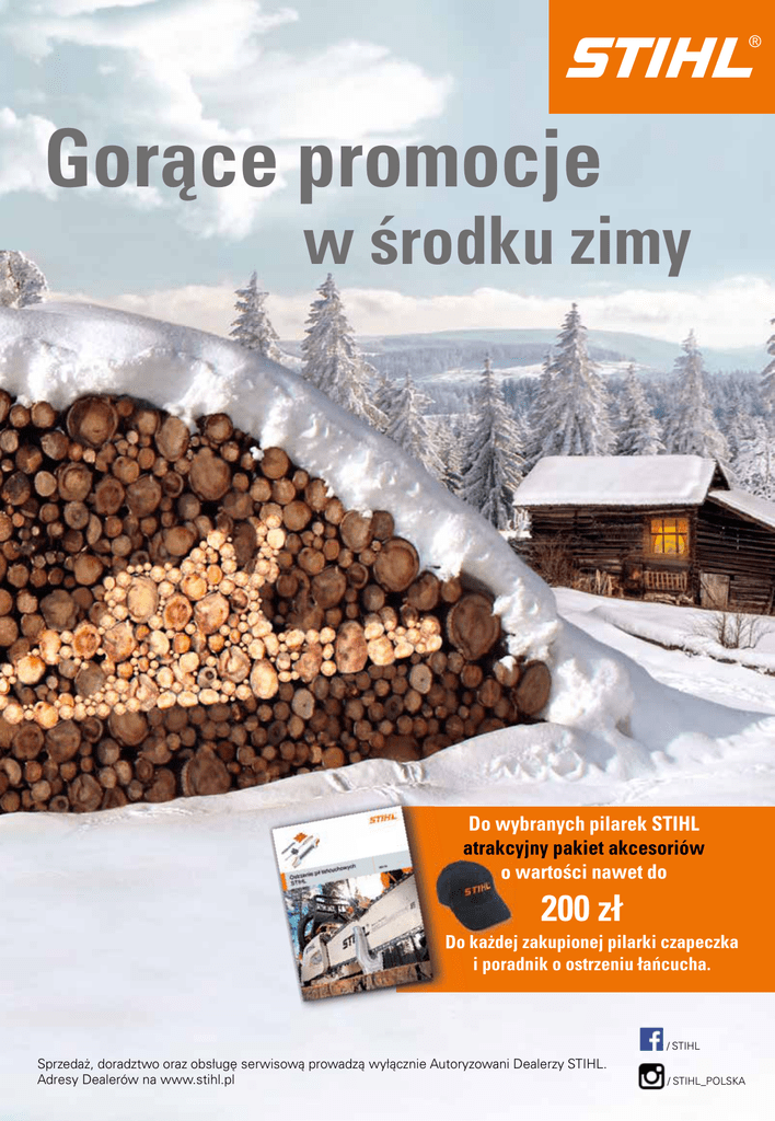 Gorące promocje w środku zimy Do wybranych pilarek STIHL atrakcyjny pakiet akcesoriów o wartości nawet do 200 zł Do każdej zakupionej pilarki czapeczka i poradnik o ostrzeniu łańcucha. www.stihl.pl / STIHL Sprzedaż, doradztwo oraz obsługę serwisową prowadzą wyłącznie Autoryzowani Dealerzy STIHL. Adresy Dealerów na www.stihl.pl / STIHL_POLSKA Pilarki STIHL - od 90 lat na rynku! Marka STIHL kojarzona jest z urządzeniami najwyższej jakości, które wyróżniają się doskonałą konstrukcją i precyzyjnym wykonaniem. Dzięki dużej mocy i komfortowemu wyposażeniu pilarki STIHL stały się niezawodną pomocą przy pracach w przydomowych ogrodach, pracach budowlanych w drewnie jak i podczas codziennej ciężkiej pracy w lesie. Niezawodne jednostki silnikowe, nowoczesne rozwiązania techniczne oraz produkowane we własnych zakładach piły łańcuchowe i prowadnice są gwarancją szybkiego i dokładnego wykonania każdej pracy związanej z przygotowaniem drewna. STIHL MS 170 STIHL MS 180 Moc: 1,2 kW/1,6 KM • Prowadnica: 35 cm • Ciężar: 4,1 kg¹ Moc: 1,4 kW/1,9 KM • Prowadnica: 35 cm • Ciężar: 4,1 kg¹ Model podstawowy do przygotowania drewna opałowego. Łatwa obsługa dzięki wielofunkcyjnemu przełącznikowi. Oszczędny silnik 2-MIX. Większa moc. Wygodny, boczny napinacz piły łańcuchowej. Oszczędny silnik 2-MIX. STIHL MS 231 STIHL MS 251 Moc: 2,0 kW/2,7 KM • Prowadnica: 35 cm • Ciężar: 4,8 kg¹ Moc: 2,2 kW/3,0 KM • Prowadnica: 35 cm • Ciężar: 4,8 kg¹ Doskonała do przygotowania drewna opałowego. Boczny napinacz piły łańcuchowej, system filtrów powietrza o długiej żywotności, praktyczne korki zbiorników. Oszczędny silnik 2-MIX. Optymalna do pozyskiwania drewna opałowego. Boczny napinacz piły łańcuchowej, system filtrów powietrza o długiej żywotności, praktyczne korki zbiorników. Oszczędny silnik 2-MIX. STIHL MS 271 STIHL MS 150 C-E Moc: 2,6 kW/3,5 KM • Prowadnica: 37 cm • Ciężar: 5,6 kg¹ Moc: 1,0 kW/1,3 KM • Prowadnica: 30 cm • Ciężar: 2,8 kg¹ Doskonała do pozyskiwania drewna opałowego, pielęgnacji krajobrazu. Boczny napinacz piły łańcuchowej, system filtrów powietrza o długiej żywotności, praktyczne korki zbiorników. Oszczędny silnik 2-MIX. Wyjątkowo lekka. Boczny napinacz piły łańcuchowej, ręczna pompa paliwowa, system filtrów powietrza o długiej żywotności, praktyczne korki zbiorników. Oszczędny silnik 2-MIX. STIHL MS 241 C-M STIHL MS 261 C-M Moc: 2,3 kW/3,1 KM • Prowadnica: 35 cm • Ciężar: 4,5 kg¹ Moc: 2,9 kW/3,9 KM • Prowadnica: 37 cm • Ciężar: 5,2 kg¹ Doskonała do pozyskiwania drewna małowymiarowego. Boczny napinacz piły łańcuchowej, M-Tronic, system filtrów powietrza o długiej żywotności, praktyczne korki zbiorników, pompa olejowa z regulacją wydajności, zawór dekompresyjny. Oszczędny silnik 2-MIX. Doskonała do pozyskiwania drewna mało- i średniowymiarowego. Boczny napinacz piły łańcuchowej, M-Tronic, system filtrów powietrza o długiej żywotności, praktyczne korki zbiorników, pompa olejowa z regulacją wydajności, zawór dekompresyjny. Oszczędny silnik 2-MIX. STIHL MS 362 C-M STIHL MS 461 Moc: 3,5 kW/4,8 KM • Prowadnica: 37 cm • Ciężar: 5,8 kg¹ Moc: 4,4 kW/6,0 KM • Prowadnica: 40 cm • Ciężar: 6,7 kg¹ Doskonała do pozyskiwania drewna średniowymiarowego. Boczny napinacz piły łańcuchowej, M-Tronic, system filtrów powietrza o długiej żywotności, praktyczne korki zbiorników, pompa olejowa z regulacją wydajności, zawór dekompresyjny. Oszczędny silnik 2-MIX. Wysokowydajna pilarka do pozyskiwania drewna. Boczny napinacz piły łańcuchowej, system filtrów powietrza o długiej żywotności, praktyczne korki zbiorników, pompa olejowa z regulacją wydajności, zawód dekompresyjny. Oszczędny silnik 2-MIX. 1 Ciężar bez paliwa, prowadnicy i piły łańcuchowej. STIHL M-Tronic: Optymalna moc System STIHL M-Tronic to w pełni automatyczny system sterowania pracą silnika, który charakteryzuje: • łatwe uruchamianie • natychmiastowe przyspieszenie • efektywne wykorzystywanie każdej kropli paliwa • optymalne dopasowanie do warunków otoczenia • tylko jedna pozycja robocza START Technika leśna STIHL - akcesoria i środki ochrony osobistej Toporek i siekiery ze styliskiem z poliamidu Prowadnik 2 w 1 Sekatory Stylisko z poliamidu wzmocnione włóknem szklanym. Wyjątkowo lekkie i trwałe. Przyrząd znacznie ułatwiający ostrzenie piły łańcuchowej. Szybkie i precyzyjne ostrzenie zębów tnących i ogranicznika zagłębiania. Niezbędna pomoc podczas pielęgnacji drzew i prac w ogrodzie. Skórzane buty robocze WORKER S3 Hełm ochronny 2504 Okulary ochronne Materiał wierzchni z wysokiej jakości wodoodpornej skóry bydlęcej. Stalowy podnosek i warstwa w podeszwie chroniąca przed przebiciem. Lekki hełm z dużym wizjerem i otworami wentylacyjnymi po obu stronach górnej części. Rynienka przeciwdeszczowa. Szeroki wybór okularów pozwalający dobrać właściwe okulary do konkretnego rodzaju prac i warunków oświetlenia. Kurtka ECONOMY PLUS Spodnie ECONOMY PLUS Polecam! Grzegorz Indyk Mistrz Polski Drwali 2015 Kurtka: duża powierzchnia w kolorze ostrzegawczym, kieszenie na akcesoria, otwory wentylacyjne, zakryty zamek błyskawiczny. Spodnie: zabezpieczenie przed przecięciem (Klasa 1), wyprofilowane strefy kolan. Kieszeń tylna i kieszenie boczne. Kurtka FUNCTION ERGO Spodnie FUNCTION ERGO Kurtka: wyjątkowo wytrzymały materiał, wzmocnienia na łokciach, duża powierzchnia w ostrzegawczym kolorze, kieszenie zamykane na zamki błyskawiczne, otwory wentylacyjne, pasy odblaskowe. Spodnie: zabezpieczenie przed przecięciem (Klasa 1), wzmocnione strefy kolan, elastyczne odblaskowe wstawki, kieszenie na narzędzia. Przedstawiona oferta ma charakter informacyjny i nie stanowi oferty handlowej w rozumieniu art. 66 § 1 Kodeksu Cywilnego.