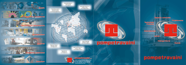 TRAVAINI POMPEN BENELUX B.V. WAARLE - HOLLAND E-mail: [email protected] Дизайн TRAVAINI POMPY POLSKA SP. Z O.O. KATOWICE - POLAND E-mail: [email protected] TRAVAINI PUMPS UK & IRELAND (Chemvac Pumps division) MACCLESFIELD - ENGLAND E-mail: [email protected] Исследования и разработки Badania i wdrozenia Projektowanie Technologia Produkcji Технологичное производство Automatyzacja Автоматизация Jakość TRAVAINI - PUMPEN GMBH BAESWEILER - GERMANY E-mail: [email protected] Качество PREMIER FLUID SYSTEM INC. BURLINGTON - CANADA E-mail: [email protected] TRAVAINI PUMPS USA YORKTOWN - USA E-mail: [email protected] NA4.CC.GENE.PLRU / ZC.UZ / TZ Поддержка заказчиков Эволюция POMPES TRAVAINI FRANCE E.U.R.L. BUCHELAY - FRANCE E-mail: [email protected] 20022 CASTANO PRIMO (Milano) ITALY Via per Turbigo, 44 - Zona Industriale Tel. 0331.889.000 - Fax 0331.889.090 www.pompetravaini.com Obsługa Klienta Rozwój HYDROPACK Kompaktowy system próżniowy z całkowitą lub częściową recyrkulacją wody. Wydajność do 1000m3/h, maksymalna próżnia 33 mbar. TRM TRVX Monoblokowe jednostopniowe pompy próżniowe z pierścieniem cieczowym. Wydajność do 270 m3/h, max próżnia 33 mbar. Jednostopniowe pompy próżniowe nowej konstrukcji. Wydajność do 2000 m3/h, max próżnia 33 mbar. Одноступенчатые водокольцевые вакуумные насосы новой конструкции с производительностью до 2000 м3/час макс. вакуум 33 мбар. Моноблочные одноступенчатые водокольцевые вакуумные насосы с производительностью до 270м3/час, макс. вакуум 33 мбар. Компактная вакуумная установка с полной или частичной циркуляцией воды. Производительность до 1000 м3\ч, макс вакуум 33 мбар. TCH & MCU-CH Jednostopniowe pompy odśrodkowe z zamkniętym wirnikiem. Wydajność do 2000 m3/h, max ciśnienie 6 bar. Одноступенчатые центробежные насосы с закрытым рабочим колесом выполненные по ISO 2858 &5199 производительностью до 2000 м3/час, давление 16 бар. TRV TCHM & TCTM Jednostopniowe pompy próżniowe z pierścieniem cieczowym do 500 m3/h, max próżnia 33 mbar. Monoblokowe jednostopniowe pompy odśrodkowe z wirnikiem zamkniętym lub otwartym typu vortex. Wydajność do 500 m3/h, max ciśnienie 10 bar. Одноступенчатые водокольцевые вакуумные насосы с производительностью до 500 м3/час макс. вакуум 33 мбар. TCN Jednostopniowe pompy odśrodkowe z zamkniętym wirnikiem zgodne z ISO 2858 & 5199 (typoszereg TCH). Wydajność do 2000 m3/h, max ciśnienie 16 bar. Одноступенчатые центробежные насосы с закрытым рабочим колесом с производительностью до 2000 м3/час, давление 6 бар. Автономная (не требует подпитки сервисной жидкости) вакуумная установка с полной или частичной циркуляцией воды. Производительность до 3500 м3\ч, макс вакуум 33 мбар. TCT Моноблочные одноступенчатые центробежные насосы с закрытым или открытым вихревым рабочим колесом с производительностью до 500 м3/час, давление 10 бар. Одноступенчатые центробежные насосы с открытым вихревым рабочим колесом с производительностью до 250 м3/час, давление 7 бар. Wielostopniowe pompy odśrodkowe. Wydajność do 350 m3/h, max ciśnienie 64 bar. POMPY WIROWE POMPY PRÓZNIOWE System próżniowy z zamkniętym biegiem oleju jako cieczy serwisowej. Wydajność do 1600m3/h, maksymalna próżnia 20 mbar. Вакуумная установка с маслом в виде сервисной жидкости. Производительность до 1600 м3\ч , макс вакуум 20 мбар. Многоступенчатые насосы с производительностью до 350 м3/час, макс. давление 64 бар. центробежные насосы вакуумные насосы OILSYS TRH - TRS TCD Dwu lub jednostopniowe pompy z pierścieniem cieczowym. Wydajność do 3500 m3/h, max próżnia 33 mbar. TBA - TBAK Jednostopniowe pompy odśrodkowe z zamkniętym wirnikiem do oleju termalnego. Wydajność do 350 m3/h, max. ciśnienie 10 bar. Двух или одноступенчатые водокольцевые вакуумные насосы с производительностью до 3500 м3/час макс.вакуум 33 мбар. Samozasysające pompy z kanałami bocznymi o niskim NPSH. Wydajność do 35 m3/h, max ciśnienie 35 bar. Dostępne z napędem magnetycznym. Самовсасывающие центробежные насосы с низким коэффициентом NPSH с производительностью до 35 м3/час , макс. давление 35 бар. Могут поставляться с магнитной муфтой. Одноступенчатые центробежные насосы с полностью закрытым рабочим колесом для горячего масла с производительностью до 350 м3/час, давление 10 бар. TBH - TBK TCK Установка с бустерным насосом и водокольцевым насосом для высокого вакуума с част