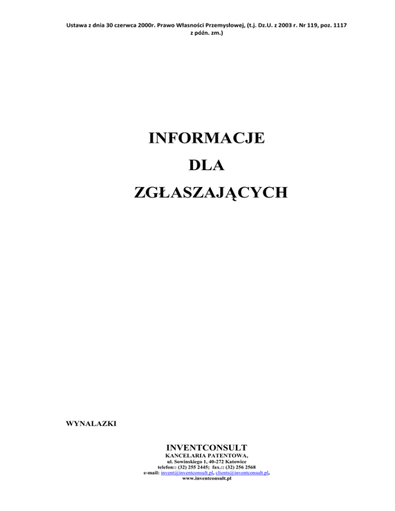 Ustawa z dnia 30 czerwca 2000r. Prawo Własności Przemysłowej, (t.j. Dz.U. z 2003 r. Nr 119, poz. 1117 z późn. zm.) INFORMACJE DLA ZGŁASZAJĄCYCH WYNALAZKI INVENTCONSULT KANCELARIA PATENTOWA, ul. Sowinskiego 1, 40-272 Katowice telefon:: (32) 255 2445; fax.:: (32) 256 2568 e-mail: [email protected], [email protected], www.inventconsult.pl Ustawa z dnia 30 czerwca 2000r. Prawo Własności Przemysłowej, (t.j. Dz.U. z 2003 r. Nr 119, poz. 1117 z późn. zm.) Ustawa z dnia 30 czerwca 2000 r. Prawo własności przemysłowej (Dz.U. z 2003 r. Nr 119, poz. 1117 ze zmianami, dalej jako p.w.p.), jak również inne ustawy na świecie dotyczące prawa własności przemysłowej, nie definiuje pojęcia wynalazku. Wskazuje natomiast, na jakie wynalazki może być udzielona ochrona. I tak w myśl art. 24 ustawy p.w.p. stanowi, że „patenty są udzielane – bez względu na dziedzinę techniki – na wynalazki, które są nowe, posiadają poziom wynalazczy i nadają się do przemysłowego stosowania”. Czas trwania ochrony wynalazku wynosi 20 lat od daty dokonania zgłoszenia w Urzędzie Patentowym. Za wynalazki w rozumieniu art. 24 nie uważa się: odkryć, teorii naukowych i metod matematycznych, wytworów o charakterze jedynie estetycznym, planów, zasad i metod dotyczących działalności umysłowej lub gospodarczej oraz gier (plansze i urządzenia do gier mogą podlegać ochronie) wytworów, których niemożliwość wykorzystania może być wykazana w świetle powszechnie przyjętych i uznanych zasad nauki, programów do maszyn cyfrowych, sposobu przedstawienia informacji. Patentów nie udziela się na: wynalazki, których wykorzystywanie byłoby sprzeczne z porządkiem publicznym lub dobrymi obyczajami; nie uważa się za sprzeczne z porządkiem publicznym korzystanie z wynalazku tylko dlatego, że jest zabronione przez prawo; odmiany roślin lub rasy zwierząt oraz czysto biologiczne sposoby hodowli roślin lub zwierząt; przepis ten nie ma zastosowania do mikrobiologicznych sposobów hodowli ani do wytworów uzyskiwanych takimi sposobami; sposoby leczenia ludzi i zwierząt metodami chirurgicznymi lub terapeutycznymi oraz sposoby diagnostyki stosowane na ludziach lub zwierzętach; przepis ten nie dotyczy produktów, a w szczególności substancji lub mieszanin stosowanych w diagnostyce lub leczeniu. sposoby leczenia ludzi i zwierząt metodami chirurgicznymi lub terapeutycznymi oraz sposoby diagnostyki stosowane na ludziach lub zwierzętach; przepis ten nie dotyczy produktów, a w szczególności substancji lub mieszanin stosowanych w diagnostyce lub leczeniu. Ustawa z dnia 30 czerwca 2000r. Prawo Własności Przemysłowej, (t.j. Dz.U. z 2003 r. Nr 119, poz. 1117 z późn. zm.) Ustawa p.w.p. wprowadziła szereg nowości, z których najistotniejsze to: 1. Sprawozdanie o stanie techniki – wykonywane przez Urząd Patentowy RP i przekazywane zgładzającemu krótko po zgłoszeniu /do 4 m-cy/, INVENTCONSULT KANCELARIA PATENTOWA, ul. Sowinskiego 1, 40-272 Katowice telefon:: (32) 255 2445; fax.:: (32) 256 2568 e-mail: [email protected], [email protected], www.inventconsult.pl Ustawa z dnia 30 czerwca 2000r. Prawo Własności Przemysłowej, (t.j. Dz.U. z 2003 r. Nr 119, poz. 1117 z późn. zm.) 2. Do 6 miesięcy od daty udzielenia patentu można wnieść sprzeciw (patent wygasa po 20 latach od daty zgłoszenia), 3. Nie narusza się patentu przez: - stosowanie wynalazku do celów badawczych i doświadczalnych, dla dokonania jego oceny, analizy albo nauczania, - korzystanie z wynalazku, w niezbędnym zakresie, dla wykonania czynności, jakie na podstawie przepisów prawa są wymagane dla uzyskania rejestracji bądź zezwolenia, stanowiących warunek dopuszczenia do obrotu niektórych wytworów ze względu na ich przeznaczenie, w szczególności środków farmaceutycznych, 4. Przepisy nie wyłączają możliwości udzielenia patentu na wynalazek dotyczący nowego zastosowania znanej substancji (stanowiącej część stanu techniki) lub użycia takiej substancji do uzyskania wytworu mającego nowe zastosowanie, 5. Zgłoszenie wynalazku może obejmować jeden lub więcej wynalazków połączonych ze sobą w taki sposób, że stanowią wyraźnie jeden pomysł wynalazczy (jednolitość wynalazku). Kilka wynalazków ujętych w jednym zgłoszeniu spełnia wymóg jednolitości, jeżeli połączenie ich ze sobą opiera się na jednej lub wielu wspólnych, bądź wzajemnie sobie odpowiadających cechach technicznych spośród tych, które określają zastrzegane wynalazki i decydują o wkładzie wnoszonym przez nie do stanu techniki. Pierwszeństwo Art. 4 Konwencji paryskiej o ochronie Własności Przemysłowej uchwalonej w Paryżu dnia 20 marca 1883 r. wprowadził możliwość skorzystania z tzw. uprzedniego pierwszeństwa. Z uprzedniego pierwszeństwa można skorzystać, dokonując zgłoszenia wynalazku w ciągu 12 miesięcy od daty pierwszego prawidłowego zgłoszenia zagranicznego lub w ciągu 6 miesięcy od daty wystawienia wynalazku na wystawie. Dane i dokumenty potrzebne do dokonania zgłoszenia wynalazku: 1. Nazwisko i imię albo nazwę, adres zamieszkania albo siedzibę zgłaszającego oraz numery identyfikacji podatkowej NIP, a także numer PESEL albo numer identyfikacyjny REGON o ile zgłaszający je posiada 2. tytuł wynalazku 3. opis rozwiązania technicznego będącego przedmiotem wynalazku 4. szkice lub rysunki (jeżeli są konieczne) – format A-4, bez ramki i tabliczki rysunkowej, 5. nazwisko, imię i adres twórcy wynalazku 6. podanie podstawy prawa zgłaszającego do uzyskania patentu (jeżeli zgłaszający nie jest twórcą), 7. dane dotyczące pierwszeństwa (data i numer dokonanego zgłoszenia zagranicznego, data otwarcia wystawy i świadectwo wydane przez komisarza wystawy), 8. dokument pełnomocnictwa, podpisany przez zgłaszającego lub jego uprawnionego przedstawiciela, podanego z imienia, nazwiska i funkcji) 9. dokument będący podstawa zgłaszającego do dokonania zgłoszenia, j