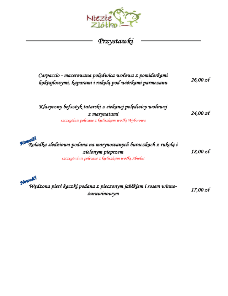 Przystawki Carpaccio - macerowana polędwica wołowa z pomidorkami koktajlowymi, kaparami i rukolą pod wiórkami parmezanu 26,00 zł Klasyczny befsztyk tatarski z siekanej polędwicy wołowej z marynatami 24,00 zł szczególnie polecane z kieliszkiem wódki Wyborowa Roladka sledziowa podana na marynowanych buraczkach z rukolą i zielonym pieprzem 18,00 zł szczegówlnie polecane z kieliszkiem wódki Absolut Wędzona pierś kaczki podana z pieczonym jabłkiem i sosem winnożurawinowym 17,00 zł Sałatki Sałatka Grecka - bukiet sałat, pomidor, ogórek , cebula czerwona, ser feta, oliwki, sos vinaigrette Sałatka z marynowaną pomarańczą - bukiet sałat, marynowana pomarańcza, grillowany kurczak , słonecznik, orzechy włoskie, sos vinaigrette lub jogurtowo czosnkowy 19,00 zł 24,00 zł szczególnie polecane z winem Roccamea Toscana Bianco Sałatka Caprese - mozzarella, świeża bazylia, pomidor, ocet balsamiczny i czosnkowa oliwa 16,00 zł Sałatka z wędzoną kaczką - bukiet sałat, pierś z kaczki, warzywa glazurowane, sos gorgonzola 26,00 zł szczególnie polecane z winem Maestri Cantinieri Rosso Zupy Rosół ze swojskim makaronem i świeżą pietruszką 8,00 zł Barszcz czerwony czysty 6,00 zł Barszcz czerwony z domowymi kołdunami 9,00 zł Krem z cebuli podawany z grzankami, serem i świeżą pietruszką 9,00 zł Żurek śląski z jajkiem podany z pieczywem czosnkowym 9,00 zł Żurek śląski podany w kociołku z gniecionymi ziemniakami 12,00 zł Krem z grzybów leśnych z grzankami i świeżą pietruszką Krem z pomidorów ześwieżą bazylią, śmietaną i chrupiącymi bułeczkami 12,00 zł 11,00 zł Makarony Peperade ze szpinakiem - makaron penne, szpinak , szynka parmeńska, pomidory suszone na słońcu, gorgonzola, sos śmietanowy, parmezan 23,00 zł szczególnie polecane z winem Maestri Cantinieri Rosso Farfalle z suszonymi pomidorami - makaron farfalle, pomidory suszone na słońcu, świeża bazylia, parmezan, oliwa Carbonara - makaron spaghetti, boczek wędzony, sos śmietanowy, parmezan, żółtko jaja, pietruszka zielona 17,00 zł 20,00 zł szczególnie polecane z winem Maestri Cantinieri Bianco Tagliatelle z łososiem, szparagami i nutką białego wina - makaron tagliatelle, filet z łososia, szparagi, pietruszka zielona, sos śmietanowy, parmezan 24,00 zł Zestawy Obiadowe Drób Rumiana pierś z kaczki Confit podana z ziemniakami gratin, buraczkami duszonymi w winie, miodzie i tymianku Pierś z kurczaka z zielonymi szparagami i białym winem podana na rostii w towarzystwie pomidorów marynowanych w czosnku i miodzie Grillowana pierś z kurczaka na szpinaku duszonym w śmietanie podana z ziemniakami gratin i rozmarynem 39,00 zł 29,00 zł 26,00 zł Grilowana pierś z kurczaka z szynką parmeńską i wędzonym serem, podana z pieczonymi ziemniakami, brokułami i masłem migdałowym 34,00 zł Pierś z kurczaka na parze z bukietem gotowanych warzyw i ryżem 25,00 zł Wołowina - Cielęcina Rolada Śląska podana z kluskami i kapustą czerwoną na ciepło 34,00 zł szczególnie polecane z piwem lanym Tyskie Placek "Niezłe Ziółko" podany z gulaszem wołowym i zestawem surówek 28,00 zł Stek z polędwicy w sosie borowikowym z nutą whiski, kluseczkami ziołowymi podany z fasolką szparagową 59,00 zł szczególnie polecane z winem Roccamea Toscana Rosso Kawałki pieczonej cielęciny podane w sosie z zielonego pieprzu z ziemniakami puree i zielonymi szparagami Kotleciki jagnięce podane na słodkich ziemniakach w towarzystwie salatki z fasolki szparagowej i marchewki 39,00 zł 44,00 zł szczególnie polecane z piwem Książęce Ciemne Łgodne Kociołek wołowy pełen smaków podany z pieczywem 18,00 zł Wieprzowina Grillowana polędwiczka podana na podgrzybkach z cebulką, zieloną pietruszką, kluskami sląskimi i kapustą czerwoną na ciepło 38,00 zł Sznycel wieprzowy na grzance, zapiekany z pieczarkami i serem camembert podany z frytkami i zestawem surówek 29,00 zł szczególnie polecane z piwem Dębowe Mocne Tradycyjny kotlet schabowy z kapustą z grzybami i ziemniakami puree Pieczone w piwie golonko b/k faszerowane kapustą i grzybami podane z opiekanymi ziemniaczkami, chrzanem i musztardą szczególnie polecane z piwem Książęce Złote Pszeniczne 26,00 zł 36,00 zł Ryby Dorsz bałtycki w sosie musztardowo-miętowym podany na rumianym toście w towarzystwie blanszowanego szpinaku 29,00 zł Filet z sandacza duszony w pieczarkach, śmietanie i białym winie podany z gotowanymi ziemniakami i bukietem warzyw 44,00 zł szczególnie polecane z winem Roccamea Toscana Bianco Filet z łososia z pieca podany na szpinaku z imbirowym ryżem szczególnie polecane z winem Maestri Cantinieri Bianco Filet z łososia podany z brokułami i delikatnym sosem jogurtowo koperkowym 38,00 zł 36,00 zł Klasyczne wariacje "Niezłego Ziółka" Pierogi ruskie 14,00 zł Pierogi z mięsem 15,00 zł Placki ziemniaczane z sosem grzybowym szczególnie polecane z piwem Lech Placuszki ziemniaczane przekładane szpinakiem i pieczonym łososiem 17,00 zł 19,00 zł szczególnie polecane z piwem Grolsch Premium Lager Naleśniki z fetą i szpinakiem, podane z sosem jogurtowo czosnkowym 17,00 zł Dodatki kluski śląskie 6,00 zł ziemniaki z wody 5,00 zł ziemniaki puree 5,00 zł frytki 6,00 zł ziemniaki opiekane z ziołami 6,00 zł ryż 5,00 zł kapusta zasmażana 6,00 zł kapusta czerwona na ciepło 6,00 zł brokuły z masłem migdałowym 7,00 zł bukiet warzyw z wody 7,00 zł buraczki tradycyjne 5,00 zł surówka z marchewki z chrzanem 5,00 zł surówka z białej kapusty 5,00 zł surówka z kiszonej kapusty 5,00 zł zestaw surówek 8,00 zł musztarda, chrzan, majonez, sos pomidorowy, sos czosnkowy, pieczywo, masło 2,00 zł Coś dla małych smakoszy Zupa pomidorowa z makronem lub ryżem 8,00 zł Kotlet z kurczaka podany z chrupiącymi frytkami i mizerią 16,00 zł Makaronowe kokardki z białym serem, masełkiem i soczystymi truskawkami 14,00 zł Miś ( lody o smaku: truskawkowym i waniliowym, 