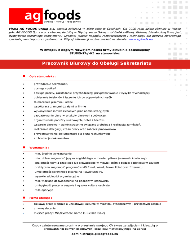 Firma AG FOODS Group a.s. została założona w 1990 roku w Czechach. Od 2000 roku działa również w Polsce jako AG FOODS Sp. z o.o. z obecną siedzibą w Międzyrzeczu Górnym k/ Bielska-Białej. Główną działalnością firmy jest dystrybucja szerokiego asortymentu wysokiej jakości napojów rozpuszczalnych i technologii dla potrzeb zbiorowego żywienia, vendingu oraz gastronomii. Więcej informacji można znaleźć na stronie: www.agfoods.eu W związku z ciągłym rozwojem naszej firmy aktualnie poszukujemy STUDENTA/-KI na stanowisko: Pracownik Biurowy do Obsługi Sekretariatu Opis stanowiska : • prowadzenie sekretariatu • obsługa spotkań • obsługa poczty, rozkładanie przychodzącej; przygotowywanie i wysyłka wychodzącej • odbieranie telefonów i łączenie ich do odpowiednich osób • tłumaczenia pisemne i ustne • współpraca z innymi działami w firmie • wykonywanie innych zleconych prac administracyjnych • zaopatrywanie biura w artykuły biurowe i spożywcze, • organizowanie podróży służbowych, hoteli i biletów, • wsparcie biurowo – administracyjne związane z obsługą i realizacją zamówień, • rozliczanie delegacji, czasu pracy oraz zaliczek pracowników • przygotowywanie dokumentacji dla biura rachunkowego • archiwizacja dokumentów Wymagania : • min. średnie wykształcenie • min. dobra znajomość języka angielskiego w mowie i piśmie (warunek konieczny) • znajomość języka czeskiego lub słowackiego w mowie i piśmie będzie dodatkowym atutem • praktyczna znajomość programów MS Excel, Word, Power Point oraz Internetu • umiejętność sprawnego pisania na klawiaturze PC • wysokie zdolności organizacyjne • mile widziane doświadczenie na podobnym stanowisku • umiejętność pracy w zespole i wysoka kultura osobista • miła aparycja Firma oferuje : ciekawą pracę w firmie o unikatowej kulturze w młodym, dynamicznym i przyjaznym zespole umowę zlecenie miejsce pracy: Międzyrzecze Górne k. Bielska-Białej Osoby zainteresowane prosimy o przesłanie swojego CV (wraz ze zdjęciem i klauzulą o przetwarzaniu danych osobowych) oraz listu motywacyjnego na adres: [email protected]