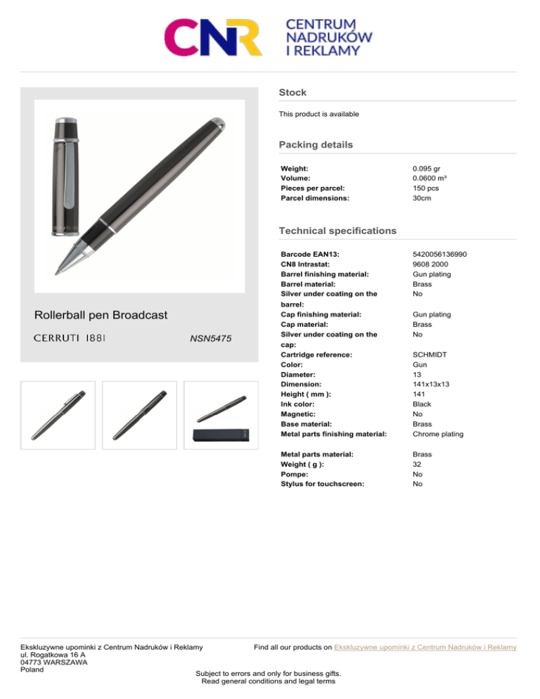 Stock This product is available Packing details Weight: Volume: Pieces per parcel: Parcel dimensions: 0.095 gr 0.0600 m³ 150 pcs 30cm Technical specifications Rollerball pen Broadcast NSN5475 Barcode EAN13: CN8 Intrastat: Barrel finishing material: Barrel material: Silver under coating on the 5420056136990 9608 2000 Gun plating Brass No barrel: Cap finishing material: Cap material: Silver under coating on the Gun plating Brass No cap: Cartridge reference: Color: Diameter: Dimension: Height ( mm ): Ink color: Magnetic: Base material: Metal parts finishing material: SCHMIDT Gun 13 141x13x13 141 Black No Brass Chrome plating Metal parts material: Weight ( g ): Pompe: Stylus for touchscreen: Brass 32 No No Ekskluzywne upominki z Centrum Nadruków i Reklamy Find all our products on Ekskluzywne upominki z Centrum Nadruków i Reklamy ul. Rogatkowa 16 A 04773 WARSZAWA Poland Subject to errors and only for business gifts. Read general conditions and legal terms
