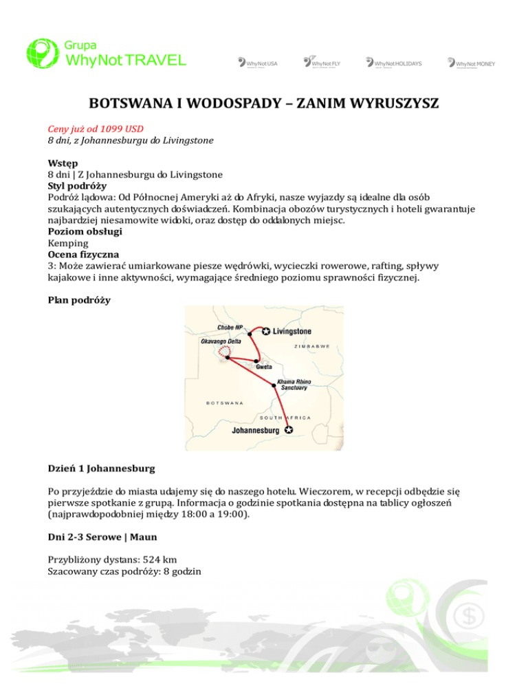 BOTSWANA I WODOSPADY – ZANIM WYRUSZYSZ Ceny już od 1099 USD 8 dni, z Johannesburgu do Livingstone Wstęp 8 dni | Z Johannesburgu do Livingstone Styl podróży Podróż lądowa: Od Północnej Ameryki aż do Afryki, nasze wyjazdy są idealne dla osób szukających autentycznych doświadczeń. Kombinacja obozów turystycznych i hoteli gwarantuje najbardziej niesamowite widoki, oraz dostęp do oddalonych miejsc. Poziom obsługi Kemping Ocena fizyczna 3: Może zawierać umiarkowane piesze wędrówki, wycieczki rowerowe, rafting, spływy kajakowe i inne aktywności, wymagające średniego poziomu sprawności fizycznej. Plan podróży Dzień 1 Johannesburg Po przyjeździe do miasta udajemy się do naszego hotelu. Wieczorem, w recepcji odbędzie się pierwsze spotkanie z grupą. Informacja o godzinie spotkania dostępna na tablicy ogłoszeń (najprawdopodobniej między 18:00 a 19:00). Dni 2-3 Serowe | Maun Przybliżony dystans: 524 km Szacowany czas podróży: 8 godzin Dzisiejsza podróż prowadzi nas przez opuszczoną, środkowowschodnią część Botswany. Kończymy dzień wizytą w Sanktuarium Nosorożców Khana, która jest unikalną inicjatywą lokalnej społeczności w dziedzinie ochrony przyrody. Dzień 4 Delta Okawango Po nocy spędzonej w Maun, pozostawiamy część naszego bagażu i wyruszamy w fascynującą wycieczkę do delty. Podróż potrwa ok. 1-2 godziny, w zależności od doku, do którego trafimy. Tam przenosimy się do mokoro - tradycyjnych, wydrążonych w drewnie kajaków, którymi popłyniemy do centrum delty. Po kilku godzinach docieramy do naszego kempingu w buszu. Prosimy pamiętać, że przez te 2 dni nie będzie dostępny prysznic; rekompensuje to niesamowity krajobraz (zalecamy zabranie ze sobą 5-litrowej butelki wody, dla picia i podstawowej higieny). Spacerujemy, korzystamy z naszych kajaków (w zależności od sezonu mogą być niedostępne), podziwiamy ptactwo i dziewiczy obszar Delty Okawango, największej śródlądowej delty na świecie. Między wczesnym rankiem a popołudniowym safari mamy dużo wolnego czasu, np. na relaks z książką w ręku lub drzemkę. Wieczorem liczymy spadające gwiazdy, śpiewamy z lokalnymi mieszkańcami, relaksujemy się przy rozpalonym ognisku. Dni 5-6 Gweta | Rzeka Chobe Przybliżony dystans: 200 km Szacowany czas podróży: 3 godziny od Maun Oglądamy ostatni wschód słońca nad Deltą, po czym wyruszamy na poranny spacer po jej obszarze. Zobaczyć można kanały, wypełnione krystalicznie czystą wodą. Potem wracamy do Maun i kontynuujemy naszą podróż do Gweta. Padający deszcz budzi do życia uśpione ryby i wodne krewetki, schowane głęboko w mule. Okoliczne łąki są domem dla imponującej liczby antylop, co przyciąga wiele gatunków drapieżników. Dzień 6 Przybliżony dystans: 420 km Szacowany czas podróży: 6 godzin Przyjeżdżamy na obszar Parku Narodowego Chobe, siedziby największej populacji słoni w Afryce Południowej. Najlepszym sposobem na ujrzenie piękna regionu i jego rezydentów (słoni, krokodyli, hipopotamów) jest opcjonalny rejs po rzece Chobe. Dostępna jest również wycieczka safari, na której poszukujemy lwów i antylop. Nasz obóz znajduje się przy brzegu rzeki, w pobliżu jej ujścia. To tam łączą się rzeki Chobe i Zambezi, tworząc granicę dla czterech krajów - Namibii, Botswany, Zambii i Zimbabwe. Dzień 7 Livingstone Przybliżony dystans: 100 km Szacowany czas podróży: 3 godziny Prosimy pamiętać, że ta podróż jest kombinacją kilku mniejszych wycieczek. Być może, w grupie pojawią się nowe osoby, a niektóre zakończą swój tour już dzisiaj. Przepływamy przez rzekę Zambezi promem, kierując się do Livingstone. Tutaj spędzimy ostatnie momenty naszej wycieczki; miejsce to stanowi doskonałą bazę do poznania cudownej natury i ekscytujących rozrywek (np. skoku na bungee z Wodospadu Wiktorii). Dzień 8 Livingstone Odjazd o dowolnej porze. O zakwaterowaniu Biwakowanie w Afryce jest prawdziwą przygodą. Można na własne oczy zobaczyć piękno puszczy i przyrody. Nasze kempingi znajdować się będą wewnątrz lub w pobliżu rezerwatów i parków narodowych; są one zazwyczaj bardzo proste i nieporównywalne do zachodnich standardów. Obiekty posiadają małe restauracje lub bary, pomieszczenia sanitarne, czasami dostępny jest telefon. Obozy mają spłukiwane toalety i prysznice, które niekiedy postawione są na zewnątrz i obudowane trzciną dla prywatności. Ciepła woda jest zazwyczaj dostępna, lecz może jej zabraknąć, gdy używana jest do innych celów niż prysznic. Toalety znajdują się tuż przy obozie. Wszystkie niezbędne rzeczy (oprócz poduszki i śpiwora) są dostarczane, w tym ciepłe materace obozowe. Montaż lub złożenie namiotu zajmuje tylko 5 minut - te są trwałe, solidnej jakości, mieszczą 2 osoby. Ich powierzchnia bazowa to ok. 4 metry kwadratowe, dlatego dorosłe osoby mogą nie być w stanie zmieścić się do środka całym ciałem. Wszystkie namioty mają wbudowane siatki na okna i drzwi, są wodoodporne, jednak przy deszczowych warunkach i nasiąknięciu materiału mogą przeciekać. Używamy własnego sprzętu do gotowania, aby zapewnić dobrej jakości posiłki. W niektórych obozach, połączonych ze środowiskiem naturalnym i zwierzętami należy uważać zalecamy używanie latarki / pochodni podczas spacerów. Pomimo wyzwania i kilku trudniejszych dni, warto jest poświęcić się dla ujrzenia prawdziwej natury i obcowania z nią; niesamowite przygody dają satysfakcję i są doświadczeniem na całe życie. Transport 16-osobowy transport, spacery, mokoro Posiłki 7x śniadanie, 6x lunch, 5x obiad Pojedynczy podróżni Wierzymy że pojedynczy podróżni nie powinni płacić więcej za swój mile spędzony czas, dlatego nasze wycieczki stworzone są dla wspólnego zakwaterowania i nie wiążą się na jeden dodatek. Na czas wycieczki, pojedynczy podróżni łączą się w grupy i zakwaterowani są z osobami tej samej płci