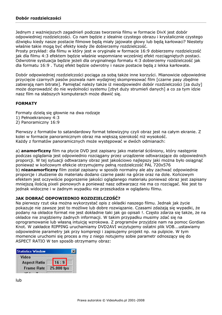 Dobór rozdzielczości Jednym z ważniejszych zagadnień podczas tworzenia filmu w formacie DivX jest dobór odpowiedniej rozdzielczości. Co nam będzie z idealnie czystego obrazu i krystalicznie czystego dźwięku kiedy nasze postacie filmowe będą miały jajowate głowy lub będą karłowaci? Niestety właśnie takie mogą być efekty kiedy źle dobierzemy rozdzielczość. Prosty przykład: dla filmu w który jest w oryginale w formacie 16:9 dobierzemy rozdzielczość jak dla filmu 4:3 efektem będzie właśnie wspomniane wcześniej efekt rozciągniętych postaci. Odwrotnie systuacja będzie jeżeli dla oryginalnego formatu 4:3 dobierzemy rozdzielczość jak dla formatu 16:9 . Tutaj efekt będzie odwrotny i nasze postacie będą z lekka karłowate. Dobór odpowiedniej rozdzielczości pociąga za sobą także inne korzyści. Mianowicie odpowiednie przycięcie czarnych pasów pozwala nam wydajniej skompresować film [czarne pasy zbędnie zabierają nam bitrate]. Pamiętać należy także iż nieodpowiedni dobór rozdzielczości [za duży] może doprowadzić do nie wydolności systemu [zbyt duży strumień danych] a co za tym idzie nasz film na słabszych komputerach może dławić się. FORMATY Formaty dzielą się głownie na dwa rodzaje 1) Pełnoekranowy 4:3 2) Panoramiczny 16:9 Pierwszy z formatów to satandardowy format telewizyjny czyli obraz jest na całym ekranie. Z kolei w formacie panoramicznym obraz ma większą szerokość niż wysokość. Każdy z formatów panoramicznych może występować w dwóch odmianach: a) anamorficzny film na płycie DVD jest zapisany jako materiał ściśniony, który następnie podczas oglądania jest odpowiednio rozciągany przez urządzenie odtwarzające do odpowiednich proporcji. W tej sytuacji odtwarzany obraz jest jakościowo najlepszy jaki można było osiągnąć ponieważ w końcowym efekcie otrzymujemy pełną rozdzielczość PAL 720x576 b) nieanamorficzny film został zapisany w sposób normalny ale aby zachwać odpowiednie proporcje i złudzenie do materiału dodano czarne paski na górze oraz na dole. Końcowym efektem jest oczywiście pogorszenie jakości oglądanego materiału ponieważ obraz jest zapisany mniejszą ilością pixeli pionowych a ponieważ nasz odtwarzacz nie ma co rozciągać. Nie jest to jednak widoczne i w żadnym wypadku nie przeszkadza w oglądaniu filmu. JAK DOBRAĆ ODPOWIEDNIO ROZDZIELCZOŚĆ? Na pierwszy rzut oka można wykorzystać opis z okładki naszego filmu. Jednak jak życie pokazuje nie zawsze jest to możliwe lub dobre rozwiązanie. Czasami zdażają się wypadki, że podany na okładce format nie jest dokładnie taki jak go opisali !. Często zdarza się także, że na okładce nie znajdziemy żadnych informacji. W takim przypadku musimy zdać się na oprogramowanie lub własną intuicję wzrokowa. Z programów przyjdzie nam na pomoc Gordian Knot. W zakładce RIPPING uruchamiamy DVD2AVI wczytujemy ostatni plik VOB...ustawiamy odpowiednie parametry jak przy kompresji i zapisujemy projekt np. na pulpicie. W tym momencie uruchomi się proces a my z niego notujemy sobie parametr odnoszący się do ASPECT RATIO W ten sposób otrzymamy obraz: lub Prawa autorskie © VideoAudio.pl 2001-2008 Jak tylko zobaczymy w jakim formacie jest zapisny materiał możemy przerwać proses bo to co chcieliśmy spradzić już zrobiliśmy. Czasami jednak zdarza się, że i ta metoda może zawieść. Zdarza się to niezwykle rzadko ale niestety zdarza się. Dlatego dla dalszego upewnienia się co do poprawności wybranego formatu w Gordian Knot w zakładce RESOLUTIONS wciskamy w lewym dolnym rogu OPEN i wczytujemy nasz projekt filmu, który utworzyliśmy wcześniej w dziale KOMPRESJA GK+DIVX PRO 5.02+AC3. Kiedy już wczytamy projekt pojawi się nam okno naszego filmu. Przechodzimy w zakładkę RESOLUTIONS i wybieramy tam format taki jaki nam się wcześniej pokazał 16:9 lub 4:3. Kiedy już wybierzemy odpowiedni format w naszym projecie który otworzyliśmy w menu FILE dajemy SAVE&ENCODE. Pojawi się nam okno w którym na samym dole wybieramy PREVIEV i dajemy w odtwarzcz FULLSCREEN i oglądamy film. Jeżeli np. wybraliśmy format 16:9 i przy podglądzie postacie są ok. i nie mamy żadnych zastrzeżeń możemy zapisać sobie na kartce format i zacząć robić film wg opisu w dziale KOMPRESJA GK+DIVX PRO 5.02+AC3. Jeżeli jednak wg programu wyjdzie nam format 16:9 a przy podglądzie zobaczymy że jednak coś z postaciami jest nie tak w Gordian Knot w zakładce RESOLUTIONS wybieramy format 4:3 i znów w projekcie który otworzyliśmy w menu FILE dajemy SAVE&ENCODE oraz PREVIEV i wtedy sprawdzamy czy jest dobrze. Jeżeli podczas próby podglądu pojawi się komunikat Sorry, could not find MediaPlayer 6.4 [C:Program FilesWindows Media Playermplayer2.exe] to display the previev ! nie ma co się załamywać. Wchodzimy do katalogu C:Program Files zaznaczamy katalog Odtwarzacz multimedialny na górnej belce klikamy na KOPIUJ a zaraz potem obok WKLEJ. Po tej operacji powinien nam się pojawić katalog o nazwie Kopia Odtwarzacz multimedialny. Zmieniamy nazwę tego katalogu na Windows Media Player [zachowując odstępy między wyrazami !!] i kiedy już zmienimy powtarzamy kroki wcześniejsze i od tej pory powinno być już wszystko ok. a podgląd PREVIEV dostępny. Jeżeli jednak mimo wykonania tych operacji wciąż będzie się pojawiał nam komunikat Sorry, could not find MediaPlayer 6.4 [C:Program FilesWindows Media Playermplayer2.exe] to display the previev ! oznacza to, że albo coś źle zrobiliśmy albo potrzebna będzie intalacja programu WINDOWS MEDIA PLAYER [dostępny w wielu czasopismach np:CHIP, ENTER, KOMPUTERŚWIAT itp.] Dzięki tej metodzie będziemy wiedzieli jaki dokładnie foramt ma nasz materiał i jaki mamy zastosować. ROZDZIELCZOŚĆ Teraz wiedząc już jaki format będziemy mieli robimy wszystko krok po kroku wg opisu w dziale KOMPRESJA GK+DIVX PRO 5.02+AC3 i w zakładce RESOLUTION zaznaczamy format taki jaki nam wys