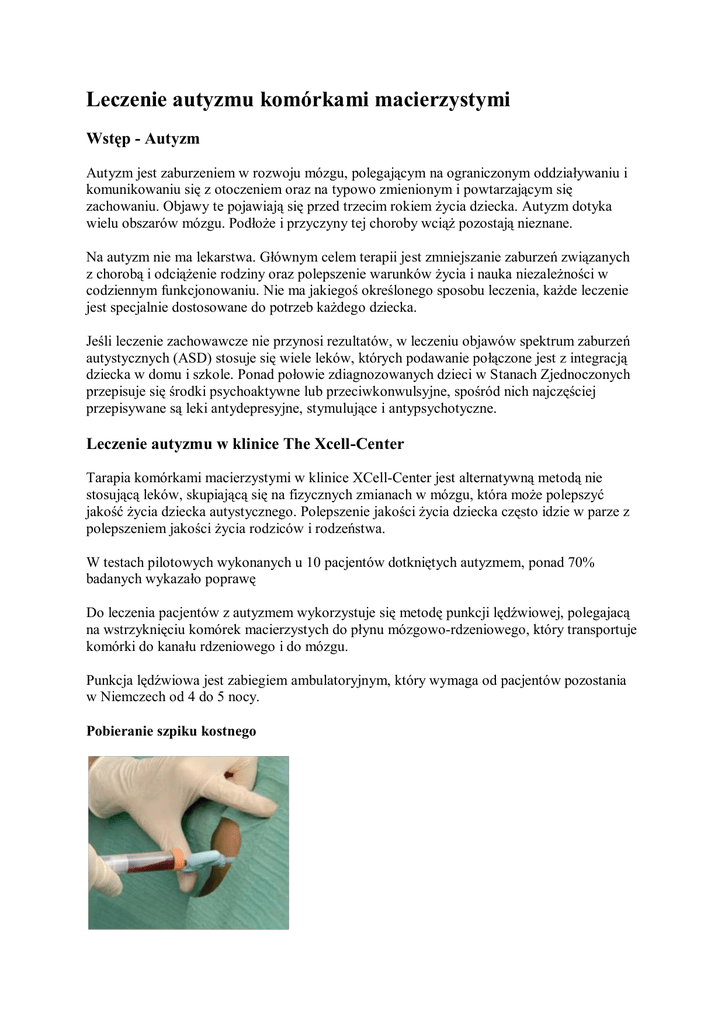 Leczenie autyzmu komórkami macierzystymi Wstęp - Autyzm Autyzm jest zaburzeniem w rozwoju mózgu, polegającym na ograniczonym oddziaływaniu i komunikowaniu się z otoczeniem oraz na typowo zmienionym i powtarzającym się zachowaniu. Objawy te pojawiają się przed trzecim rokiem życia dziecka. Autyzm dotyka wielu obszarów mózgu. Podłoże i przyczyny tej choroby wciąż pozostają nieznane. Na autyzm nie ma lekarstwa. Głównym celem terapii jest zmniejszanie zaburzeń związanych z chorobą i odciążenie rodziny oraz polepszenie warunków życia i nauka niezależności w codziennym funkcjonowaniu. Nie ma jakiegoś określonego sposobu leczenia, każde leczenie jest specjalnie dostosowane do potrzeb każdego dziecka. Jeśli leczenie zachowawcze nie przynosi rezultatów, w leczeniu objawów spektrum zaburzeń autystycznych (ASD) stosuje się wiele leków, których podawanie połączone jest z integracją dziecka w domu i szkole. Ponad połowie zdiagnozowanych dzieci w Stanach Zjednoczonych przepisuje się środki psychoaktywne lub przeciwkonwulsyjne, spośród nich najczęściej przepisywane są leki antydepresyjne, stymulujące i antypsychotyczne. Leczenie autyzmu w klinice The Xcell-Center Tarapia komórkami macierzystymi w klinice XCell-Center jest alternatywną metodą nie stosującą leków, skupiającą się na fizycznych zmianach w mózgu, która może polepszyć jakość życia dziecka autystycznego. Polepszenie jakości życia dziecka często idzie w parze z polepszeniem jakości życia rodziców i rodzeństwa. W testach pilotowych wykonanych u 10 pacjentów dotkniętych autyzmem, ponad 70% badanych wykazało poprawę Do leczenia pacjentów z autyzmem wykorzystuje się metodę punkcji lędźwiowej, polegajacą na wstrzyknięciu komórek macierzystych do płynu mózgowo-rdzeniowego, który transportuje komórki do kanału rdzeniowego i do mózgu. Punkcja lędźwiowa jest zabiegiem ambulatoryjnym, który wymaga od pacjentów pozostania w Niemczech od 4 do 5 nocy. Pobieranie szpiku kostnego Pierwszego dnia szpik kostny zostaje pobrany z grzebienia kości biodrowej poprzez wykonane cieniutką igłą mini nakłucie przy znieczuleniu lokalnym. Cała procedura trwa na ogół około 30 minut. Ponieważ pobieranie szpiku kostnego wymaga, aby pacjent siedział nieruchomo, wykonuje się go przy znieczuleniu ogólnym u dzieci i dorosłych, którzy nie są w stanie siedzieć nieruchomo. Kiedy pobieranie szpiku kostnego jest już zakończone, po krótkim przebywaniu w klinice, pacjent może powrócić do hotelu i prowadzić normalny tryb życia. Więcej szczegółów na temat procedury pobierania szpiku kostnego znajdziesz w Informacje na temat pozwolenia pobierania szpiku kostnego (plik PDF). Postępowanie laboratoryjne Następnego dnia, komórki macierzyste zostają wyizolowane ze szpiku kostnego w ultranowoczesnym laboratorium, zatwierdzonym przez administrację rządową. Personel laboratorium dokonuje jakościowych i ilościowych pomiarów komórek macierzystych. Komórki te mają zdolność do przekształcania się w różne typy komórek, prowadząc w ten sposób do naprawy i regeneracji uszkodzonych tkanek. Wszczepianie komórek macierzystych Trzeciego dnia, komórki macierzyste są z powrotem wszczepiane pacjentowi metodą punkcji lędźwiowej. Punkcja lędźwiowa Przy znieczuleniem miejscowym, między kręg L4 a L5 zostaje wprowadzona igła rdzeniowa, następnie pobierana jest mała ilość płynu rdzeniowego. Część tego płynu jest następnie mieszana z roztworem komórek macierzystych, po czym płyn ten z kolei zostaje z powrotem wstrzyknięty do płynu rdzeniowego pacjenta, a nie do samego rdzenia kręgowego. Po wszczepieniu komórek macierzystych, pacjent pozostaje przez kilka godzin w pokoju szpitalnym, w pozycji leżącej, po czym wraca do hotelu. Punkcja lędźwiowa u dzieci i u pacjentów, którzy nie są w stanie siedzieć nieruchomo jest wykonywana przy znieczuleniu ogólnym. Po zabiegu Po punkcji lędźwiowej pacjenci ze względów bezpieczeństwa muszą pozostać na miejscu przynajmniej przez jeden dzień po zabiegu. Mogą wrócić do domu piątego dnia. Wyniki leczenia Dane statystyczne zebrane we wrześniu 2009 roku dotyczące leczenia 7 pacjentów dotkniętych autyzmem pokazały, że u ponad 70% (5 z 7) zanotowano poprawę po terapii komórkami macierzystymi. Średnia wieku pacjentów to 8,9 lat, a średni wiek to 6 lat. Najstarszy pacjent miał 16 lat, a najmłodszy 5. Nie zauważono żadnego związku między pozytywnym wynikiem, a ilością wszczepionych komórek. Podsumowując, u leczonych pacjentów zanotowano poprawę w sferze psychologii poznawczej, bogactwie językowym, kontakcie społecznym, wzrokowym, koordynacji, sferze ruchowej i świadomości Poniżej przedstawiono podsumowanie wyników dla 4 z 5 pacjentów, u których zanotowano poprawę po zastosowanym leczeniu: Pacjent #1 - (M) Wiek 6 - Leczenie w maju 2009 Poprawa w sferze psychologii poznawczej i procesach odczuwania Pacjent może teraz wspiąć się samodzielnie na trampolinę i bawić się na niej przez około 20 minut. Przed leczeniem, krzyczał kiedy rodzice stawiali go na trampolinie. Dluższy okres koncentracji - oglądał TV przez 30 minut. Przed wszczepieniem komórek macierzystych, potrafił się na czymś skupić od kilku sekund do jednej minuty. Zmniejszyła się też częstotliwość zabaw pozbawionych sensu Powyższe postępy zostały potwierdzone przez lekarza pacjenta Pacjent #2 - (M) Wiek 6 - Leczenie w czerwcu 2009 Poprawa w sferze ruchowej rąk i palców Poprawa w pisaniu Poprawa w mówieniu Większa umiejętność samodzielnego jedzenia Może teraz jeździć na rowerze bez strachu Poprawa w kontaktach z otoczeniem Poprawa w sferze psychologii poznawczej Pacjent #3 - (K) Wiek 16 - Leczenie w lipcu 2009 Poprawa w sferze ruchowej i koordynacji Bardziej ufny Spokojniejszy w szkole Poprawa ocen szkolnych, zwłaszcza z matematyki Pacjent #4 - (K) Wiek 11 - Leczenie w styczniu 2
