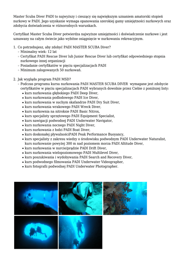 Master Scuba Diver PADI to najwyższy i cieszący się największym uznaniem amatorski stopień nurkowy w PADI. Jego uzyskanie wymaga opanowania szerokiej gamy umiejętności nurkowych oraz zdobycia doświadczenia w różnorodnych warunkach. Certyfikat Master Scuba Diver potwierdza najwyższe umiejętności i doświadczenie nurkowe i jest uznawany na całym świecie jako wybitne osiągnięcie w nurkowaniu rekreacyjnym. 1. Co potrzebujesz, aby zdobyć PADI MASTER SCUBA Diver? Minimalny wiek: 12 lat Certyfikat PADI Rescue Diver lub Junior Rescue Diver lub certyfikat odpowiedniego stopnia nurkowego innej organizacji Posiadanie certyfikatów w pięciu specjalizacjach PADI Minimum zalogowanych 50 nurkowań. ❍ ❍ ❍ ❍ 2. Jak wygląda program PADI MSD? Podczas programu kursu nurkowania PADI MASTER SCUBA DIVER wymagane jest zdobycie certyfikatów w pięciu specjalizacjach PADI wybranych dowolnie przez Ciebie z poniższej listy: kurs nurkowania głębokiego PADI Deep Diver, kurs nurkowania podlodowego PADI Ice Diver, kurs nurkowania w suchym skafandrze PADI Dry Suit Diver, kurs nurkowania wrakowego PADI Wreck Diver, kurs nurkownia na nitroksie PADI Basic Nitrox, kurs specjalisty sprzętowego PADI Equipment Specialist, kurs nawigacji podwodnej PADI Underwater Navigator, kurs nurkowania nocnego PADI Night Diver, kurs nurkowania z łodzi PADI Boat Diver, kurs doskonałej pływalnościPADI Peak Performance Buoyancy, kurs specjalisty z zakresu wiedzy o środowisku podwodnym PADI Underwater Naturalist, kurs nurkowanie powyżej 300 m nad poziomem morza PADI Altitude Diver, kurs nurkowania w nurcie/prądzie PADI Drift Diver, kurs nurkowania wielopoziomowego PADI Multilevel Diver, kurs poszukiwania i wydobywania PADI Search and Recovery Diver, kurs podwodnego filmowania PADI Underwater Videographer, kurs fotografii podwodnej PADI Underwater Photographer. ❍ ■ ■ ■ ■ ■ ■ ■ ■ ■ ■ ■ ■ ■ ■ ■ ■