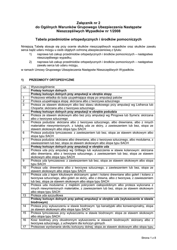 Załącznik nr 2 do Ogólnych Warunków Grupowego Ubezpieczenia Następstw Nieszczęśliwych Wypadków nr 1/2008 Tabela przedmiotów ortopedycznych i środków pomocniczych Niniejszą Tabelę stosuje się przy ocenie skutków nieszczęśliwych wypadków oraz skutków zawału serca bądź udaru mózgu u osób objętych ochroną ubezpieczeniową z tytułu: 1) naprawa lub zakup przedmiotów ortopedycznych i środków pomocniczych – następstwa nieszczęśliwego wypadku; 2) naprawa lub zakup przedmiotów ortopedycznych i środków pomocniczych – następstwa zawału serca lub udaru mózgu, w ramach Umowy Grupowego Ubezpieczenia Następstw Nieszczęśliwych Wypadków. 1) Lp. 1 2 3 4 5 6 7 8 9 10 11 12 13 14 15 16 17 PRZEDMIOTY ORTOPEDYCZNE Wyszczególnienie Protezy kończyn dolnych Protezy kończyn dolnych przy amputacji w obrębie stopy Protezowa wkładka do buta uzupełniająca stopę po amputacji palców Proteza uzupełniająca stopę: skórzana albo z tworzywa sztucznego Proteza ze stawem skokowym albo bez stawu skokowego przy amputacji wg Lisfranca lub Choparta: skórzana albo z tworzywa sztucznego Protezy kończyn dolnych przy amputacji w obrębie podudzia Proteza ze stawem skokowym albo bez przy amputacji wg Pirogowa lub Syme'a: skórzana albo z tworzywa sztucznego Proteza podudzia: skórzana albo z tworzywa sztucznego, albo drewniana, albo z innych materiałów niewymienionych, z tulejką uda ze skóry, z zawieszeniem lub bez, stopa ze stawem skokowym albo stopa typu SACH Proteza podudzia tymczasowa: z zawieszeniem lub bez, stopa ze stawem skokowym albo stopa typu SACH Proteza podudzia: skórzana albo drewniana, albo z tworzywa sztucznego, albo modularna, z zawieszeniem lub bez, stopa ze stawem skokowym albo stopa typu SACH Protezy kończyn dolnych przy amputacji w obrębie uda Proteza uda przy amputacji wg Grittiego lub wyłuszczenia w stawie kolanowym: skórzana albo drewniana, albo z tworzywa sztucznego, z zawieszeniem lub bez, stopa ze stawem skokowym albo stopa typu SACH Proteza uda tymczasowa: z zawieszeniem lub bez, stopa ze stawem skokowym albo stopa typu SACH Proteza uda: drewniana albo z tworzywa sztucznego, z zawieszeniem lub bez, stopa ze stawem skokowym albo stopa typu SACH Proteza uda z lejem kikutowym skórzanym: goleń i kolano drewniane albo goleń i kolano z tworzywa sztucznego, albo goleń ze skóry, albo z drewna, albo z tworzywa, z zawieszeniem lub bez, stopa ze stawem skokowym albo stopa typu SACH Proteza uda modularna: z miękkim pokryciem ciałopodobnym albo proteza wykonana z innych niewymienionych materiałów, z zawieszeniem lub bez, stopa ze stawem skokowym albo stopa typu SACH Proteza uda szczudłowa Protezy kończyn dolnych przy pełnej amputacji w obrębie uda (wyłuszczenie w stawie biodrowym) Proteza przy wyłuszczeniu w stawie biodrowym: typ kanadyjski albo konwencjonalny, stopa ze stawem skokowym albo stopa typu SACH Proteza tymczasowa przy wyłuszczeniu w stawie biodrowym: stopa ze stawem skokowym albo stopa typu SACH Kosz biodrowy przy obustronnym wyłuszczeniu w stawach biodrowych: skórzany albo z tworzywa sztucznego, z uchwytami dla kończyn górnych Protezowe wyrównanie skrótu kończyny dolnej: stopa ze stawem skokowym albo stopa typu Strona 1 z 8 18 19 20 21 22 23 24 25 26 27 28 29 30 31 32 33 34 35 36 37 38 39 40 41 42 43 44 45 46 47 48 49 50 51 52 53 SACH, z zawieszeniem lub bez Wyposażenie dodatkowe do protez kończyn dolnych Pończocha kikutowa - przy amputacji w obrębie stopy Pończocha kikutowa - przy amputacji podudzia Pończocha kikutowa - przy amputacji uda Pończocha kikutowa albo majteczki przy jednostronnej pełnej amputacji kończyny dolnej albo majteczki przy obustronnej pełnej amputacji kończyn dolnych Protezy kończyn górnych Proteza kosmetyczna części ręki Proteza kosmetyczna przedramienia: skórzana albo z tworzywa sztucznego, z dłonią protezową, z zawieszeniem lub bez Proteza kosmetyczna przedramienia: z elementów modularnych, z miękkim pokryciem ciałopodobnym, z dłonią protezową, z zawieszeniem lub bez Proteza kosmetyczna przedramienia: skórzana albo z tworzywa sztucznego, z tulejką ramienia, z dłonią protezową Proteza kosmetyczna przedramienia: z elementów modularnych, z tulejką ramienia, z miękkim pokryciem ciałopodobnym, z dłonią protezową Proteza kosmetyczna ramienia: z elementów modularnych, z miękkim pokryciem ciałopodobnym, z dłonią protezową, z zawieszeniem lub bez Proteza kosmetyczna ramienia: skórzana albo z tworzywa sztucznego, lej ze skóry albo z tworzywa, z dłonią protezową, z zawieszeniem lub bez Proteza kosmetyczna całej kończyny górnej: ze stawem barkowym albo bez stawu barkowego, skórzana albo z tworzywa sztucznego, z dłonią protezową, z zawieszeniem lub bez Proteza kosmetyczna całej kończyny górnej: ze stawem barkowym albo bez stawu barkowego, z elementów modularnych, z miękkim pokryciem ciałopodobnym, z dłonią protezową, z zawieszeniem lub bez Proteza robocza mechaniczna części ręki Proteza robocza mechaniczna przedramienia: z dłonią protezową, z zawieszeniem Proteza robocza mechaniczna ramienia: z dłonią protezową, z zawieszeniem Proteza robocza mechaniczna przy pełnej amputacji kończyny górnej: z dłonią protezową, z zawieszeniem Wyposażenie dodatkowe do protez kończyn górnych Uchwyty robocze do protez kończyn górnych, np.: hak wieloczynnościowy albo hak dwudzielny Pończochy kikutowe - przy amputacji przedramienia Pończochy kikutowe - przy amputacji ramienia Pończochy kikutowe - przy pełnej amputacji kończyny górnej Aparaty ortopedyczne na kończyny dolne Aparat korekcyjny palucha koślawego Aparaty odciążająco-korekcyjne dla palców stóp Szyna spiralna z sandałem: strzałkowa albo piszczelowa Szyna strzałkowa ze strzemieniem do buta, z podciągiem sprężynowym lub bez Aparat na opadającą stopę (stopowo-goleniowy tylny) Podciąg gumowy zapobiegający opadaniu stopy Aparat drutowy do kolana z podciągiem spr