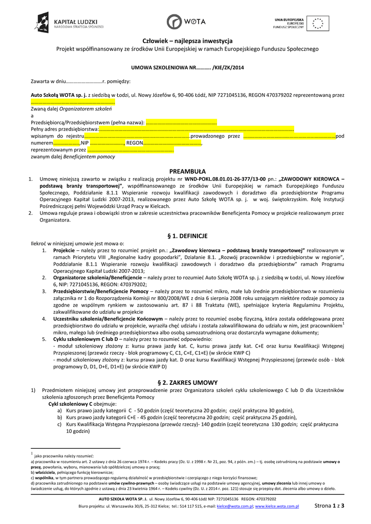 Człowiek – najlepsza inwestycja Projekt współfinansowany ze środków Unii Europejskiej w ramach Europejskiego Funduszu Społecznego UMOWA SZKOLENIOWA NR……….. /KIE/ZK/2014 Zawarta w dniu……………………….r. pomiędzy: Auto Szkołą WOTA sp. j. z siedzibą w Łodzi, ul. Nowy Józefów 6, 90-406 Łódź, NIP 7271045136, REGON 470379202 reprezentowaną przez ……………………………………………………….. Zwaną dalej Organizatorem szkoleń a Przedsiębiorcą/Przedsiębiorstwem (pełna nazwa): ………………………………………………. Pełny adres przedsiębiorstwa:……………………………………………………………………………………………………………………………………. wpisanym do rejestru……………………………………………….……..……………….prowadzonego przez ………………………………….…………...….…………pod numerem………………..,NIP …………………….., REGON………………………………………, reprezentowanym przez …………………………………………………………. zwanym dalej Beneficjentem pomocy PREAMBUŁA 1. 2. Umowę niniejszą zawarto w związku z realizacją projektu nr WND-POKL.08.01.01-26-377/13-00 pn.: „ZAWODOWY KIEROWCA – podstawą branży transportowej”, współfinansowanego ze środków Unii Europejskiej w ramach Europejskiego Funduszu Społecznego, Poddziałanie 8.1.1 Wspieranie rozwoju kwalifikacji zawodowych i doradztwo dla przedsiębiorstw Programu Operacyjnego Kapitał Ludzki 2007-2013, realizowanego przez Auto Szkołę WOTA sp. j. w woj. świętokrzyskim. Rolę Instytucji Pośredniczącej pełni Wojewódzki Urząd Pracy w Kielcach. Umowa reguluje prawa i obowiązki stron w zakresie uczestnictwa pracowników Beneficjenta Pomocy w projekcie realizowanym przez Organizatora. § 1. DEFINICJE Ilekroć w niniejszej umowie jest mowa o: 1. Projekcie – należy przez to rozumieć projekt pn.: „Zawodowy kierowca – podstawą branży transportowej” realizowanym w ramach Priorytetu VIII „Regionalne kadry gospodarki”, Działanie 8.1. „Rozwój pracowników i przedsiębiorstw w regionie”, Poddziałanie 8.1.1 Wspieranie rozwoju kwalifikacji zawodowych i doradztwo dla przedsiębiorstw” ramach Programu Operacyjnego Kapitał Ludzki 2007-2013; 2. Organizatorze szkolenia/Beneficjencie – należy przez to rozumieć Auto Szkołę WOTA sp. j. z siedzibą w Łodzi, ul. Nowy Józefów 6, NIP: 7271045136, REGON: 470379202; 3. Przedsiębiorstwie/Beneficjencie Pomocy – należy przez to rozumieć mikro, małe lub średnie przedsiębiorstwo w rozumieniu załącznika nr 1 do Rozporządzenia Komisji nr 800/2008/WE z dnia 6 sierpnia 2008 roku uznającym niektóre rodzaje pomocy za zgodne ze wspólnym rynkiem w zastosowaniu art. 87 i 88 Traktatu (WE), spełniające kryteria Regulaminu Projektu, zakwalifikowane do udziału w projekcie 4. Uczestniku szkolenia/Beneficjencie Końcowym – należy przez to rozumieć osobę fizyczną, która została oddelegowana przez 1 przedsiębiorstwo do udziału w projekcie, wyraziła chęć udziału i została zakwalifikowana do udziału w nim, jest pracownikiem mikro, małego lub średniego przedsiębiorstwa albo osobą samozatrudnioną oraz dostarczyła wymagane dokumenty; 5. Cyklu szkoleniowym C lub D – należy przez to rozumieć odpowiednio: - moduł szkoleniowy złożony z: kursu prawa jazdy kat. C, kursu prawa jazdy kat. C+E oraz kursu Kwalifikacji Wstępnej Przyspieszonej (przewóz rzeczy - blok programowy C, C1, C+E, C1+E) (w skrócie KWP C) - moduł szkoleniowy złożony z: kursu prawa jazdy kat. D oraz kursu Kwalifikacji Wstępnej Przyspieszonej (przewóz osób - blok programowy D, D1, D+E, D1+E) (w skrócie KWP D) § 2. ZAKRES UMOWY 1) Przedmiotem niniejszej umowy jest przeprowadzenie przez Organizatora szkoleń cyklu szkoleniowego C lub D dla Uczestników szkolenia zgłoszonych przez Beneficjenta Pomocy Cykl szkoleniowy C obejmuje: a) Kurs prawo jazdy kategorii C - 50 godzin (część teoretyczna 20 godzin; część praktyczna 30 godzin), b) Kurs prawo jazdy kategorii C+E - 45 godzin (część teoretyczna 20 godzin; część praktyczna 25 godzin), c) Kurs Kwalifikacja Wstępna Przyspieszona (przewóz rzeczy)- 140 godzin (część teoretyczna 130 godzin; część praktyczna 10 godzin) 1 jako pracownika należy rozumieć: a) pracownika w rozumieniu art. 2 ustawy z dnia 26 czerwca 1974 r. – Kodeks pracy (Dz. U. z 1998 r. Nr 21, poz. 94, z późn. zm.) – tj. osobę zatrudnioną na podstawie umowy o pracę, powołania, wyboru, mianowania lub spółdzielczej umowy o pracę; b) właściciela, pełniącego funkcję kierownicze; c) wspólnika, w tym partnera prowadzącego regularną działalność w przedsiębiorstwie i czerpiącego z niego korzyści finansowe; d) pracownika zatrudnionego na podstawie umów cywilno-prawnych – osoby świadczące usługi na podstawie umowy agencyjnej, umowy zlecenia lub innej umowy o świadczenie usług, do których zgodnie z ustawą z dnia 23 kwietnia 1964 r. – Kodeks cywilny (Dz. U. z 2014 r. poz. 121) stosuje się przepisy dot. zlecenia albo umowy o dzieło. AUTO SZKOŁA WOTA SP. J. ul. Nowy Józefów 6, 90-406 Łódź NIP: 7271045136 REGON: 470379202 Biuro projektu: ul. Warszawska 30/6, 25-312 Kielce; tel.: 514 117 515, e-mail: [email protected]; www.kielce.wota.com.pl Strona 1 z 3 Człowiek – najlepsza inwestycja Projekt współfinansowany ze środków Unii Europejskiej w ramach Europejskiego Funduszu Społecznego 2) 3) 4) 5) Cykl szkoleniowy D obejmuje: a) Kurs prawo jazdy kat. D - 80 godzin (część teoretyczna 20 godzin; część praktyczna 60 godzin), b) Kurs Kwalifikacja Wstępna Przyspieszona - 140 godzin (część teoretyczna 130 godzin; część praktyczna 10 godzin) Szkolenia, o których mowa w pkt. 1 odbywać się będą w miejscu i terminie wskazanym przez Organizatora szkoleń oraz na zasadach 