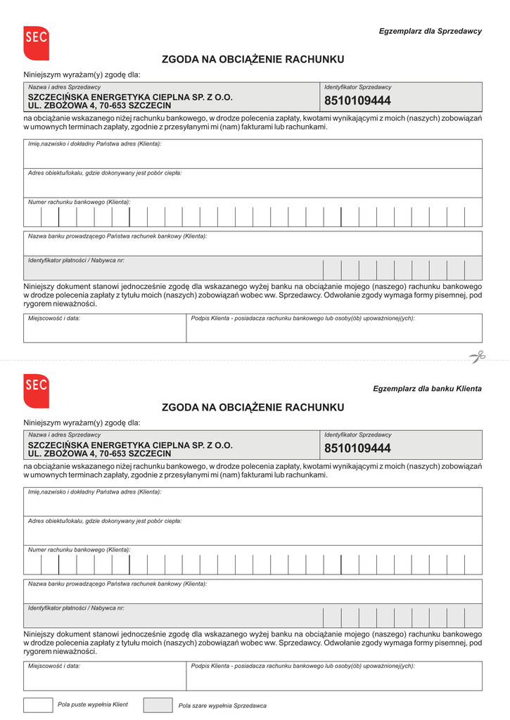 Egzemplarz dla Sprzedawcy ZGODA NA OBCI¥¯ENIE RACHUNKU Niniejszym wyra¿am(y) zgodê dla: Nazwa i adres Sprzedawcy SZCZECIÑSKA ENERGETYKA CIEPLNA SP. Z O.O. SZCZECIŃSKA DEMBOWSKIEGO 6, SZCZECIN 71-533 SZCZECIN UL. ZBOŻOWA 4, 70-653 Identyfikator Sprzedawcy 8510109444 na obci¹¿anie wskazanego ni¿ej rachunku bankowego, w drodze polecenia zap³aty, kwotami wynikaj¹cymi z moich (naszych) zobowi¹zañ w umownych terminach zap³aty, zgodnie z przesy³anymi mi (nam) fakturami lub rachunkami. Imiê,nazwisko i dok³adny Pañstwa adres (Klienta): Adres obiektu/lokalu, gdzie dokonywany jest pobór ciep³a: Numer rachunku bankowego (Klienta): Nazwa banku prowadz¹cego Pañstwa rachunek bankowy (Klienta): Identyfikator p³atnoœci / Nabywca nr: Niniejszy dokument stanowi jednoczeœnie zgodê dla wskazanego wy¿ej banku na obci¹¿anie mojego (naszego) rachunku bankowego w drodze polecenia zap³aty z tytu³u moich (naszych) zobowi¹zañ wobec ww. Sprzedawcy. Odwo³anie zgody wymaga formy pisemnej, pod rygorem niewa¿noœci. Miejscowoœæ i data: Podpis Klienta - posiadacza rachunku bankowego lub osoby(ób) upowa¿nionej(ych): Egzemplarz dla banku Klienta ZGODA NA OBCI¥¯ENIE RACHUNKU Niniejszym wyra¿am(y) zgodê dla: Nazwa i adres Sprzedawcy SZCZECIÑSKA ENERGETYKA CIEPLNA SP. Z O.O. SZCZECIŃSKA DEMBOWSKIEGO 6, SZCZECIN 71-533 SZCZECIN UL. ZBOŻOWA 4, 70-653 Identyfikator Sprzedawcy 8510109444 na obci¹¿anie wskazanego ni¿ej rachunku bankowego, w drodze polecenia zap³aty, kwotami wynikaj¹cymi z moich (naszych) zobowi¹zañ w umownych terminach zap³aty, zgodnie z przesy³anymi mi (nam) fakturami lub rachunkami. Imiê,nazwisko i dok³adny Pañstwa adres (Klienta): Adres obiektu/lokalu, gdzie dokonywany jest pobór ciep³a: Numer rachunku bankowego (Klienta): Nazwa banku prowadz¹cego Pañstwa rachunek bankowy (Klienta): Identyfikator p³atnoœci / Nabywca nr: Niniejszy dokument stanowi jednoczeœnie zgodê dla wskazanego wy¿ej banku na obci¹¿anie mojego (naszego) rachunku bankowego w drodze polecenia zap³aty z tytu³u moich (naszych) zobowi¹zañ wobec ww. Sprzedawcy. Odwo³anie zgody wymaga formy pisemnej, pod rygorem niewa¿noœci. Miejscowoœæ i data: Pola puste wype³nia Klient Podpis Klienta - posiadacza rachunku bankowego lub osoby(ób) upowa¿nionej(ych): Pola szare wype³nia Sprzedawca Szanowni Państwo, Wychodząc naprzeciw Państwa potrzebom bezobsługowej realizacji płatności za energię cieplną, proponujemy Państwu skorzystanie z usługi polecenia zapłaty. Ta forma daje Państwu gwarancję prawidłowych i terminowych rozliczeń należności oraz komfort niewymagający osobistego, comiesięcznego zaangażowania. Na czym polega Polecenie Zapłaty? Polecenie Zapłaty jest bezgotówkową formą rozliczenia. Polega na jednorazowym złożeniu dyspozycji cyklicznej realizacji płatności z Państwa rachunku bankowego. Rachunki opłacane są w terminie wskazanym na fakturze, a Państwo nie muszą już ich pilnować, ani poświęcać czasu na ich regulowanie na poczcie, w punktach kasowych czy w banku. Zgodnie z Ustawą Prawo bankowe, Polecenie Zapłaty można odwołać i/lub płatność reklamować, nawet po realizacji transakcji (np. w wyniku powstania niezgodności). Kto może skorzystać z Polecenia Zapłaty? Każdy kto posiada rachunek bankowy i ma podpisaną Umowę sprzedaży ciepła i świadczenia usług przesyłania, może uruchomić taką usługę. Polecenie Zapłaty stosowane jest w różnych rozliczeniach bezgotówkowych (np. za gaz, ciepło, wodę, telefon, telewizję, internet). Informacje na temat tej formy, wraz z listą banków, która je prowadzi, znajdują się na stronie www.poleceniezaplaty.org.pl. Jak uruchomić Polecenie Zapłaty? Aby uruchomić Polecenie Zapłaty wystarczy wypełnić odcinki załączonego formularza pod nazwą Zgoda na obciążenie rachunku. Oryginały należy dostarczyć osobiście lub przesłać pocztą do Biura Obsługi Klienta SEC przy ul. Zbożowej 4 w Szczecinie. Nasi pracownicy zajmą się aktywacją Państwa Polecenia Zapłaty, przekazując niezbędne informacje do banku prowadzącego Państwa rachunek. Uruchomienie rozliczenia bezgotówkowego nastąpi od najbliższego terminu płatności wskazanego na fakturze, licząc od dnia złożenia dyspozycji Polecenia Zapłaty. Jak uruchomić Polecenie Zapłaty? Po uruchomieniu Polecenia Zapłaty, płatności za energię cieplną odbywać się będą automatycznie przez bank. Polecenie Zapłaty będzie aktywne od miesiąca, w którym otrzymają Państwo fakturę z adnotacją „Płatne przez bank – polecenie zapłaty”. Oznacza to, że ta i kolejne płatności będą pobierane z Państwa rachunku bankowego w dniu wskazanym na fakturze jako termin płatności. SEC nadal będzie wysyłać Państwu faktury w celach informacyjnych, tj. o poziomie zużycia ciepła oraz w celu kontroli wydatków. Polecenie Zapłaty można odwołać wykonując podobną czynność jak wyżej, czyli poprzez złożenie formularza odwołującego w Państwa Banku. Szczecińska Energetyka Cieplna Sp. z o.o. zarejestrowana w Sądzie Rejonowym Szczecin-Centrum w Szczecinie, XIII Wydział Gospodarczy Krajowego Rejestru Sądowego pod numerem KRS: 0000131910 gdzie przechowywana jest dokumentacja spółki, numer NIP: 851-010-94-44, numer REGON: 811655650, kapitał zakładowy spółki: 126.500.000,00 zł, www.sec.com.pl Siedziba ul. Zbożowa 4, 70-653 Szczecin, centrala T +48 91 450 97 00, Biuro Obsługi Klienta T +48 91 450 99 99, F +48 91 450 99 09